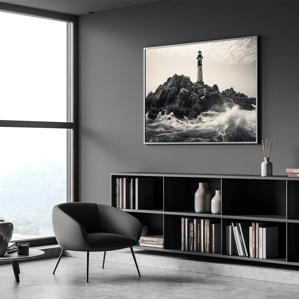 Immerse yourself in the rugged beauty of the coast with this Rocky Lighthouse and Waves wall art. This striking piece captures the majesty of a lighthouse perched on a rocky outcrop, with waves crashing dramatically against the shore. The monochromatic tones emphasize the raw power of the sea and the steadfastness of the lighthouse, making it a perfect addition for those who appreciate nature's untamed beauty.