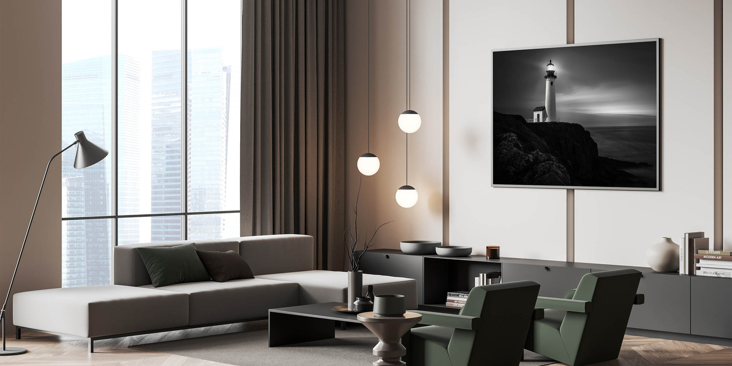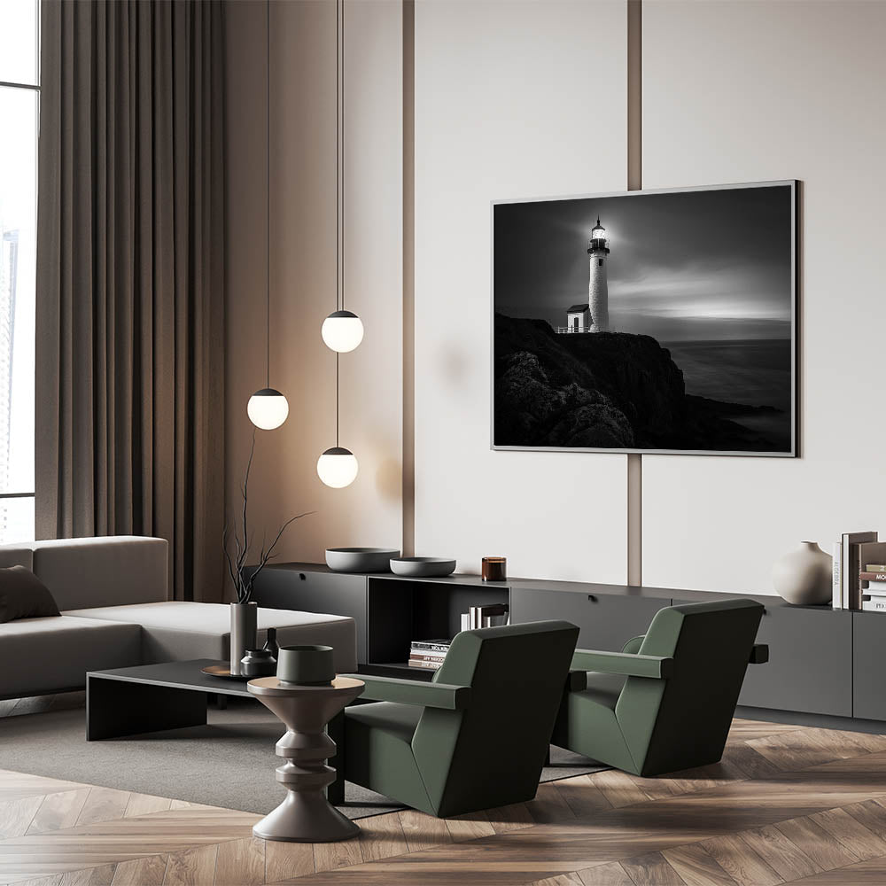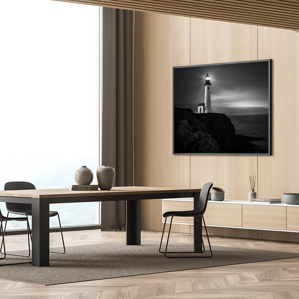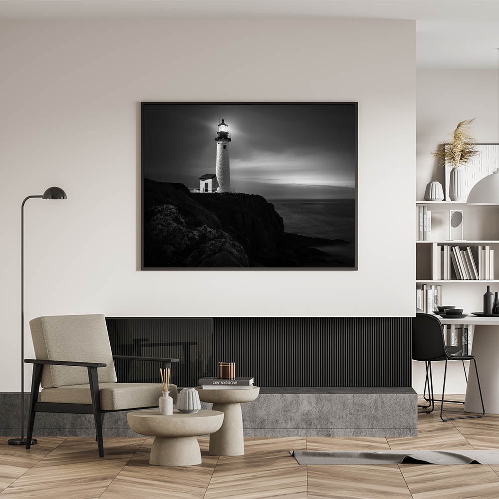 This lighthouse art piece is perfect for those who are drawn to the quiet strength of solitary structures and the calming influence of the sea at night. The deep contrasts and elegant composition make it a standout addition to any room, offering a peaceful retreat from the hustle and bustle of daily life.