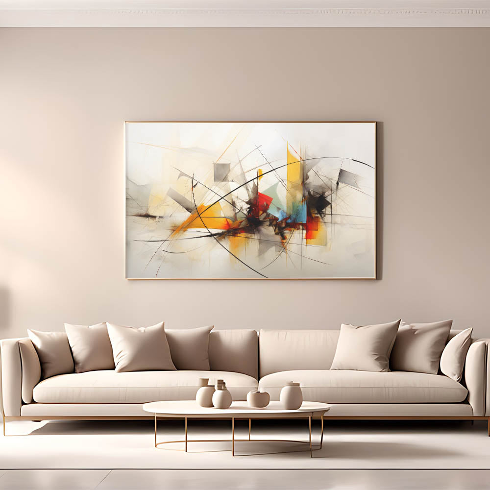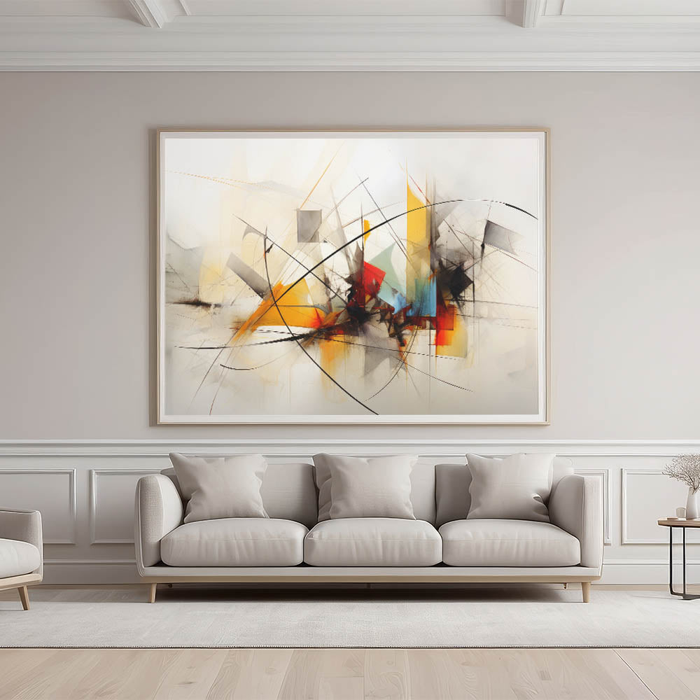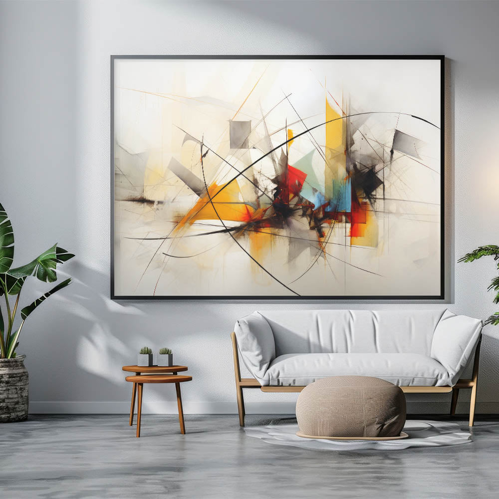 Add a touch of dynamic sophistication to your space with this stunning abstract expressionist wall art. This piece features a vibrant interplay of bold lines and shapes, creating an energetic composition that captures the essence of movement and fluidity. The color palette includes striking shades of yellow, red, and touches of blue, complemented by subtle gray tones, making it a perfect addition to modern interiors.