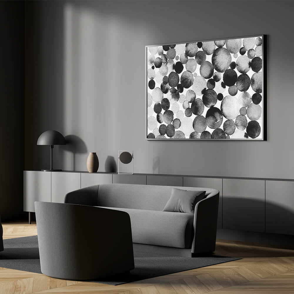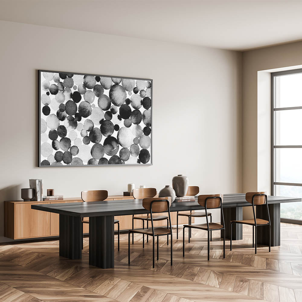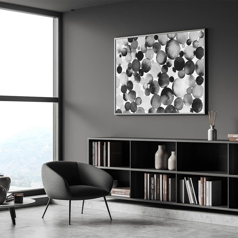 Elevate your home or office decor with this artistic black and white abstract canvas. This unique monochrome design features a captivating pattern of variously sized circles in shades of black and grey, creating a modern and sophisticated visual appeal.