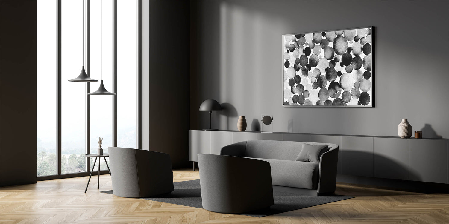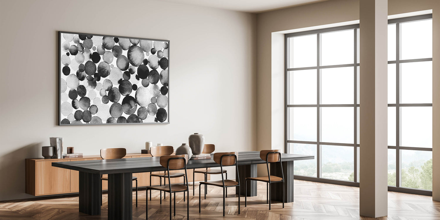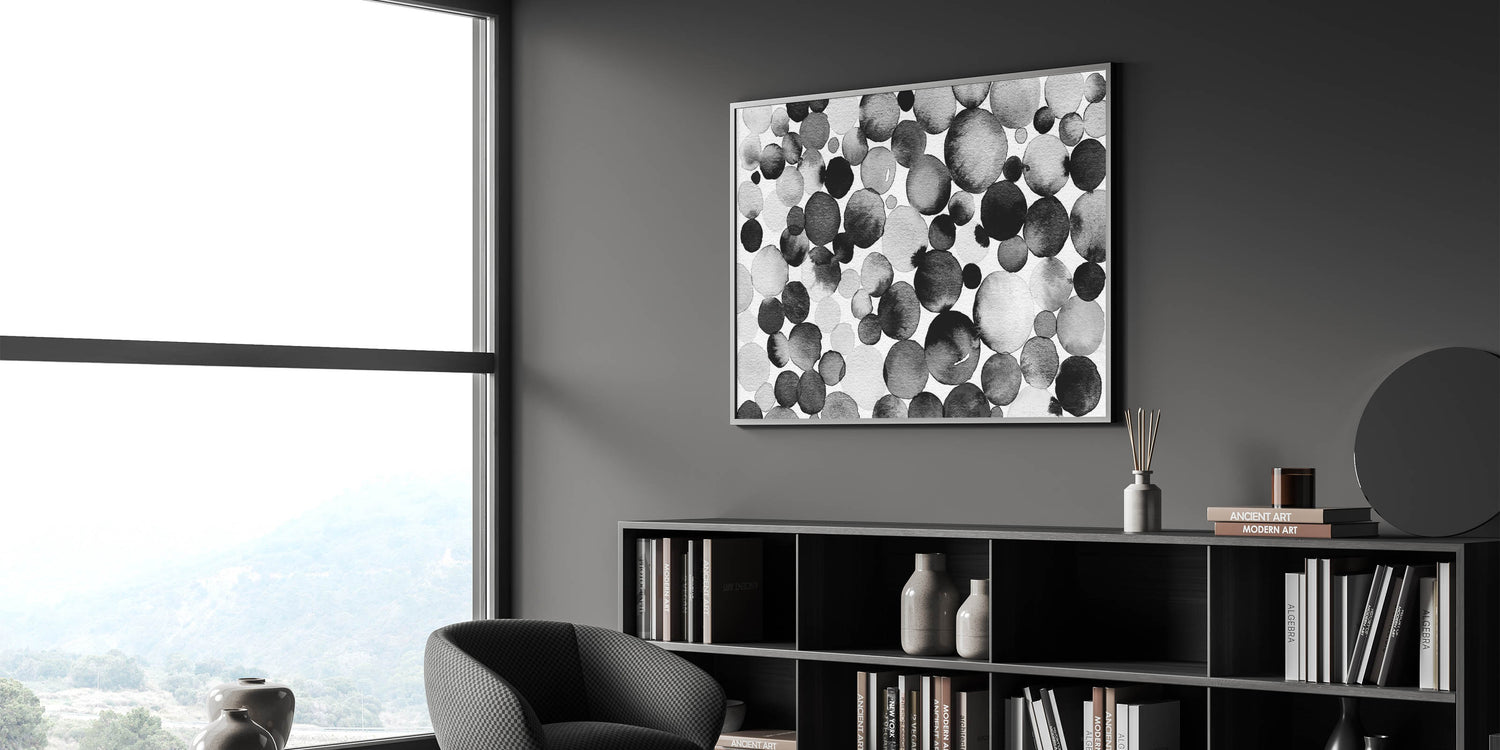 Elevate your home or office decor with this artistic black and white abstract canvas. This unique monochrome design features a captivating pattern of variously sized circles in shades of black and grey, creating a modern and sophisticated visual appeal.