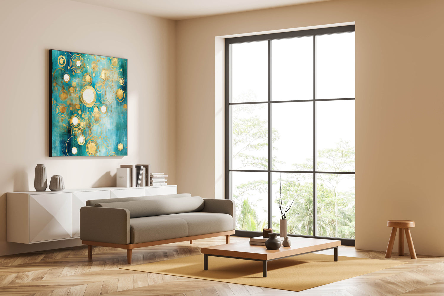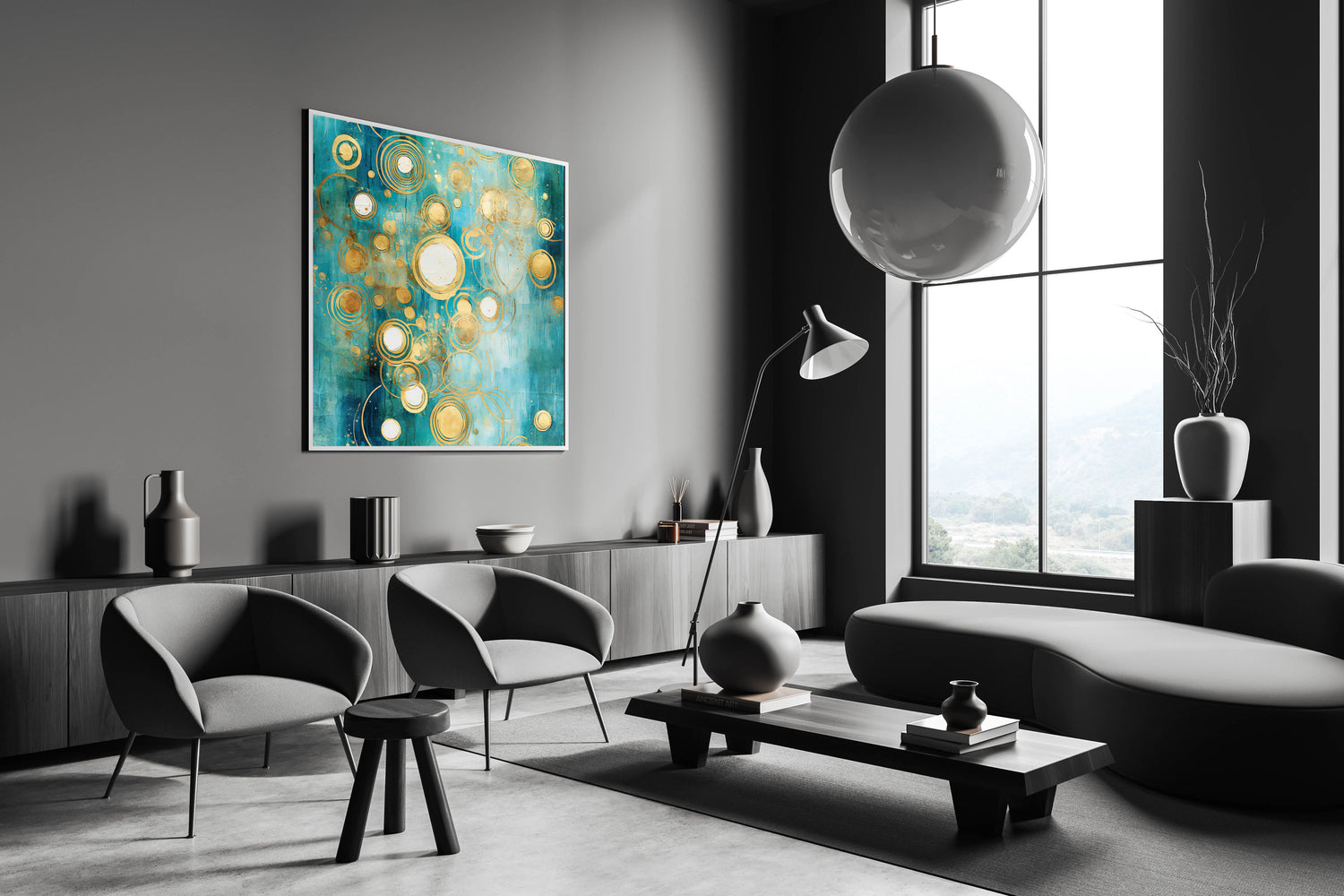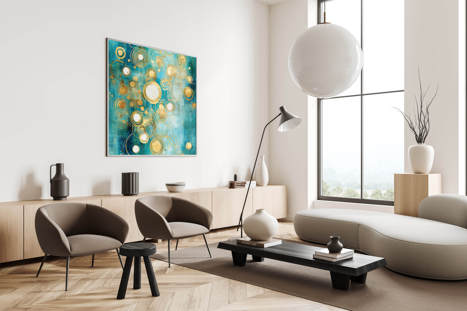 The vibrant teal background combined with shimmering gold and white circles brings a sense of freshness and luxury to any room. This unique piece is designed to be a striking focal point, perfect for living rooms, bedrooms, or office spaces.