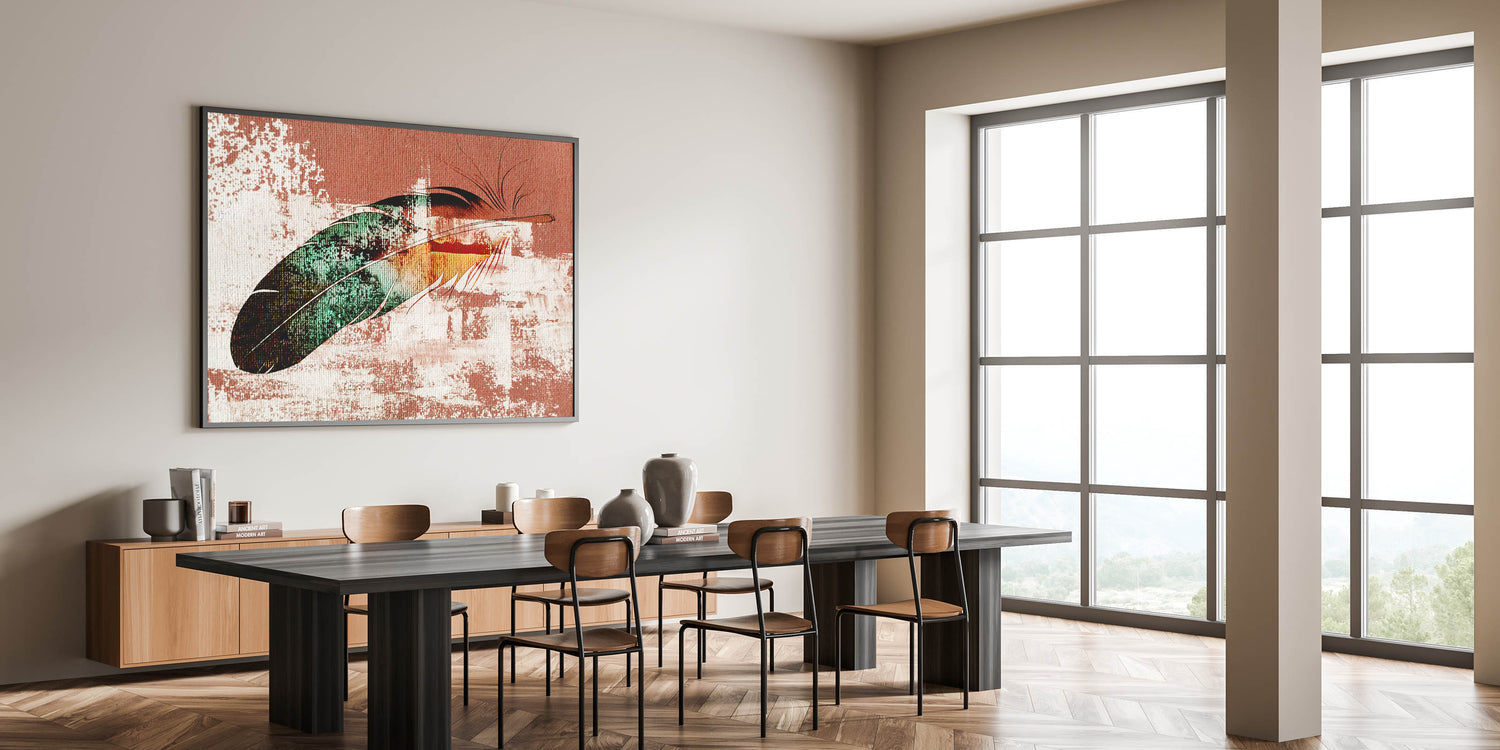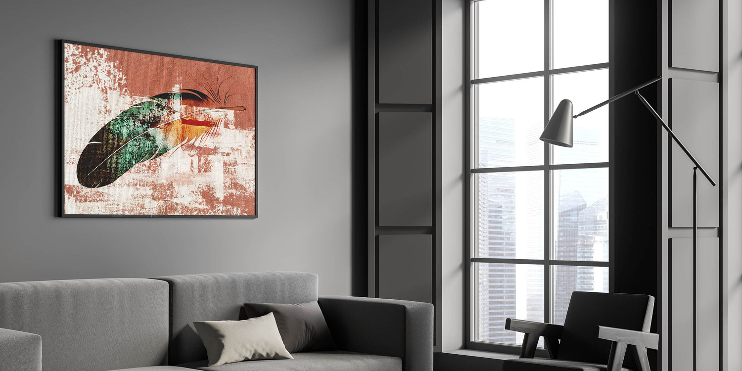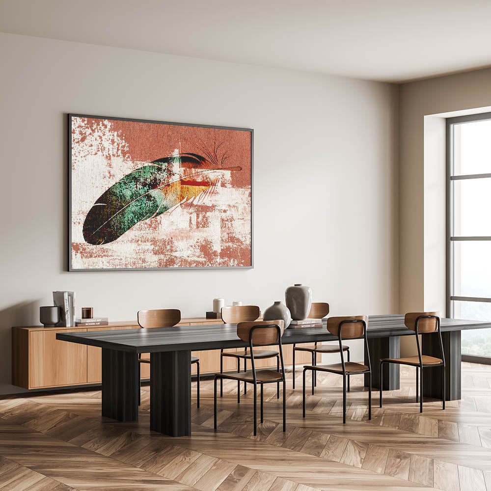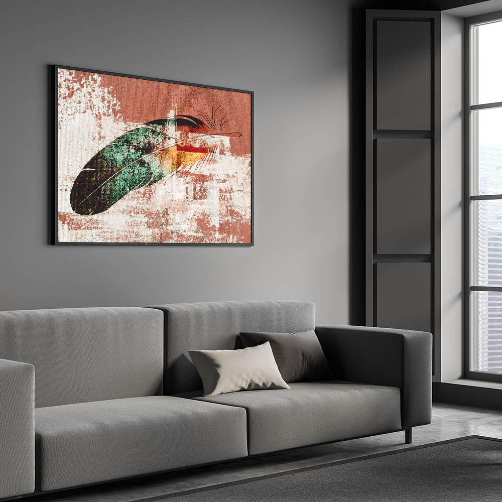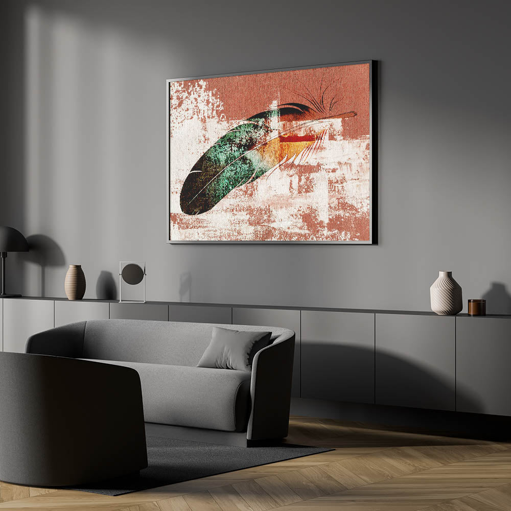 Add a touch of nature and vibrant color to your space with this colorful feather abstract art. The intricate design features a beautifully detailed feather, rendered in rich shades of green, orange, and yellow, set against a rustic textured background. This artwork perfectly balances modern abstract strokes with the organic beauty of nature, making it a versatile piece for any home or office decor.