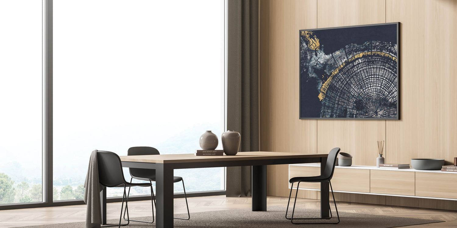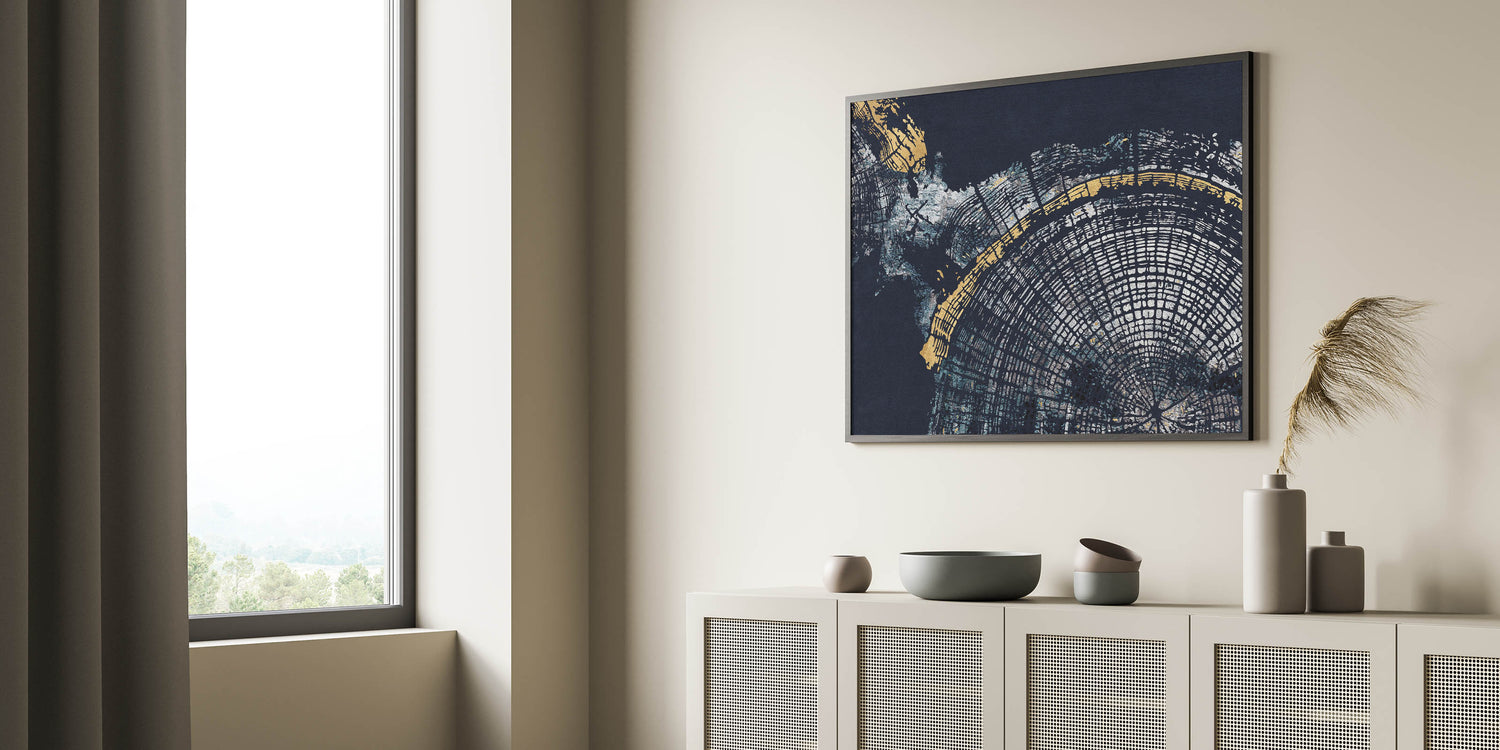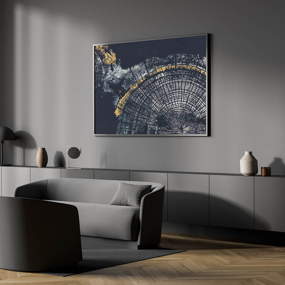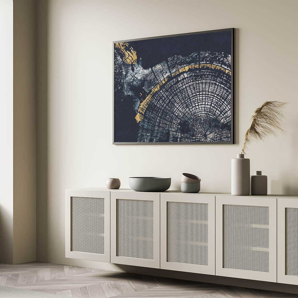 Enhance your decor with the "Elegant Abstract Rings Art." This modern canvas print features a captivating blend of navy blue and gold hues, creating a sophisticated and striking visual experience. The artwork showcases intricate circular patterns reminiscent of tree rings, adding depth and a touch of nature-inspired elegance to any room.