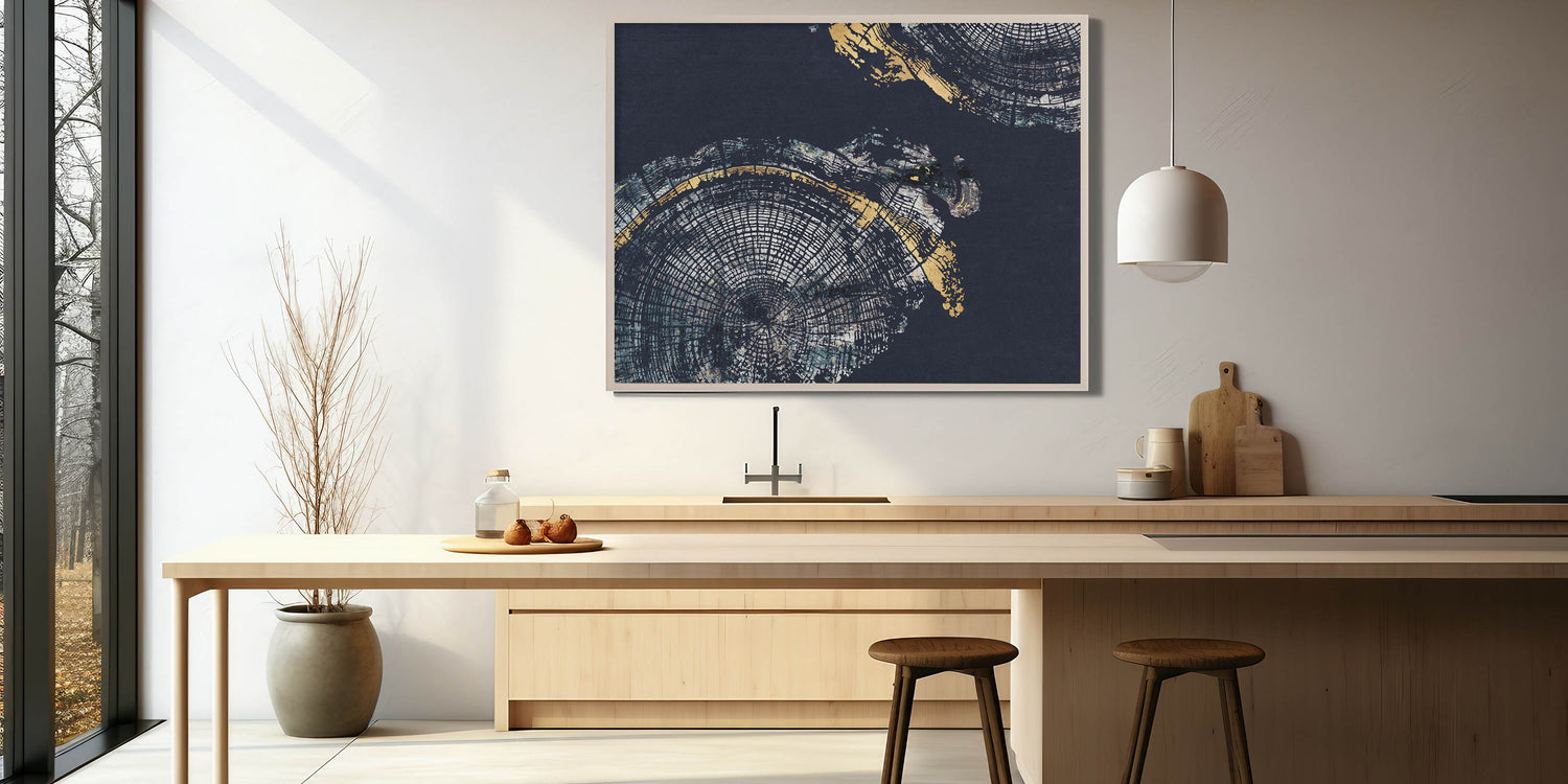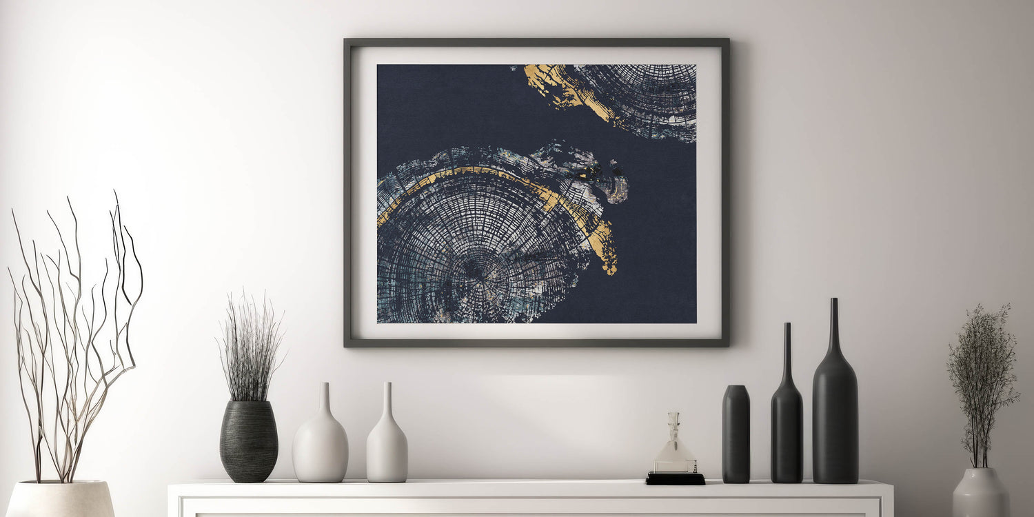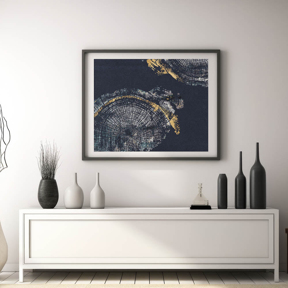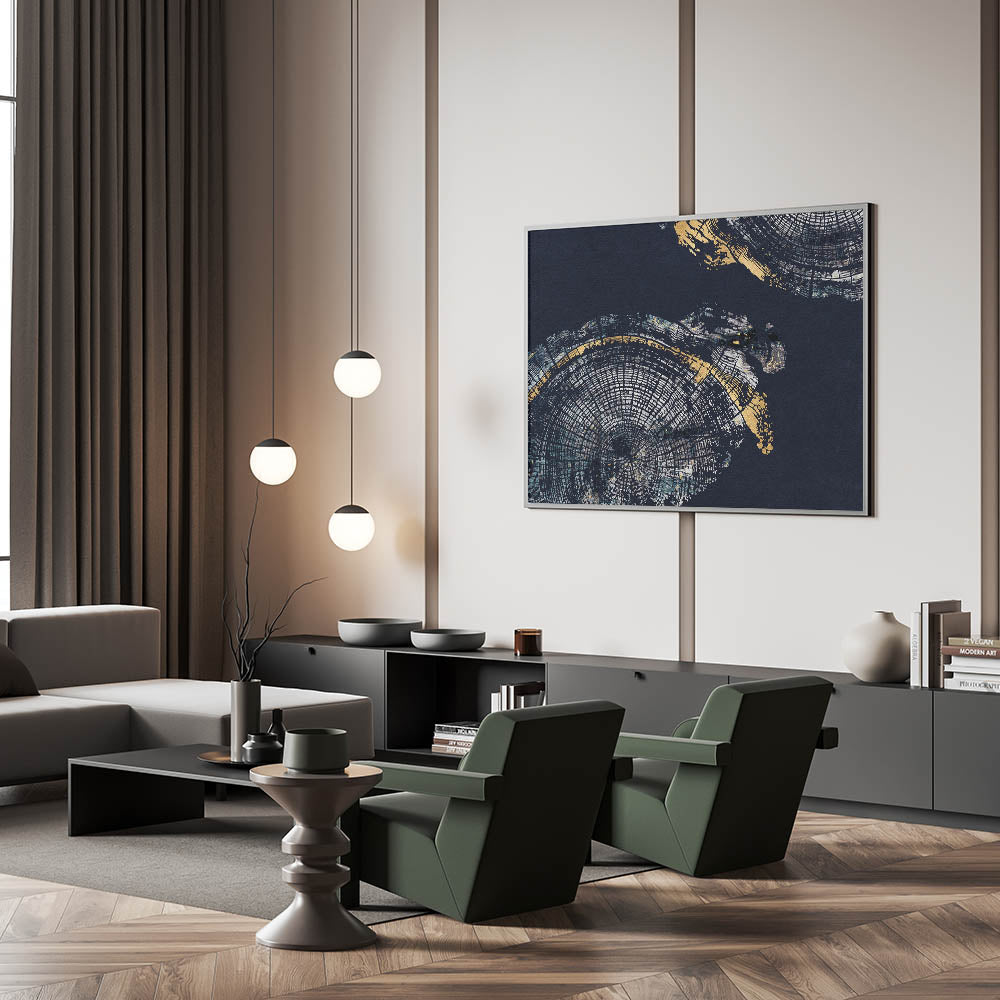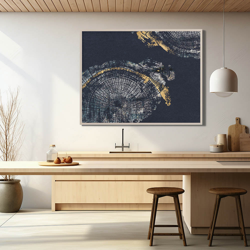 Elevate your decor with the "Elegant Rings Abstract Art." This modern canvas print features a captivating blend of navy blue and gold hues, creating a sophisticated and striking visual experience. The artwork showcases intricate circular patterns reminiscent of tree rings, adding depth and a touch of nature-inspired elegance to any room.