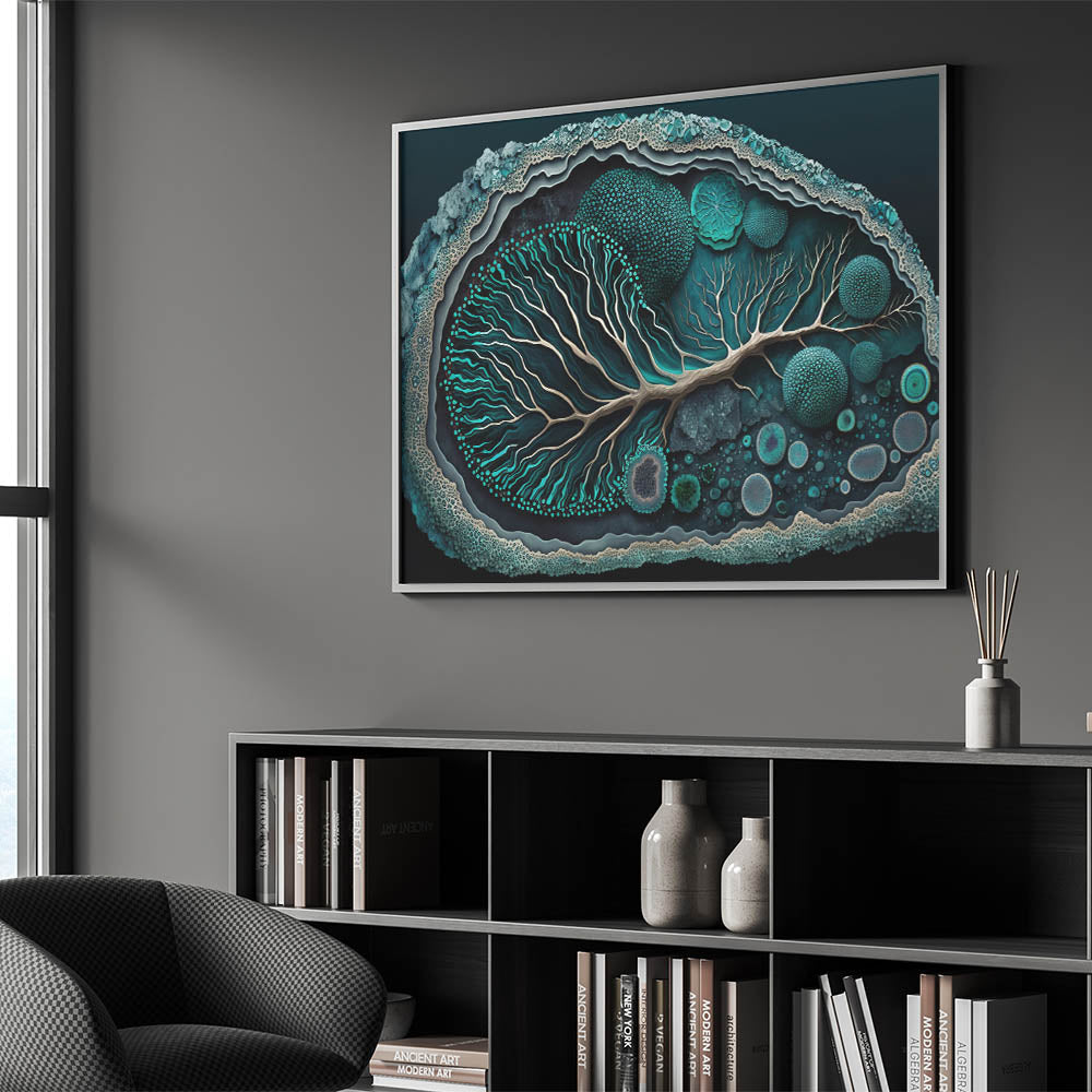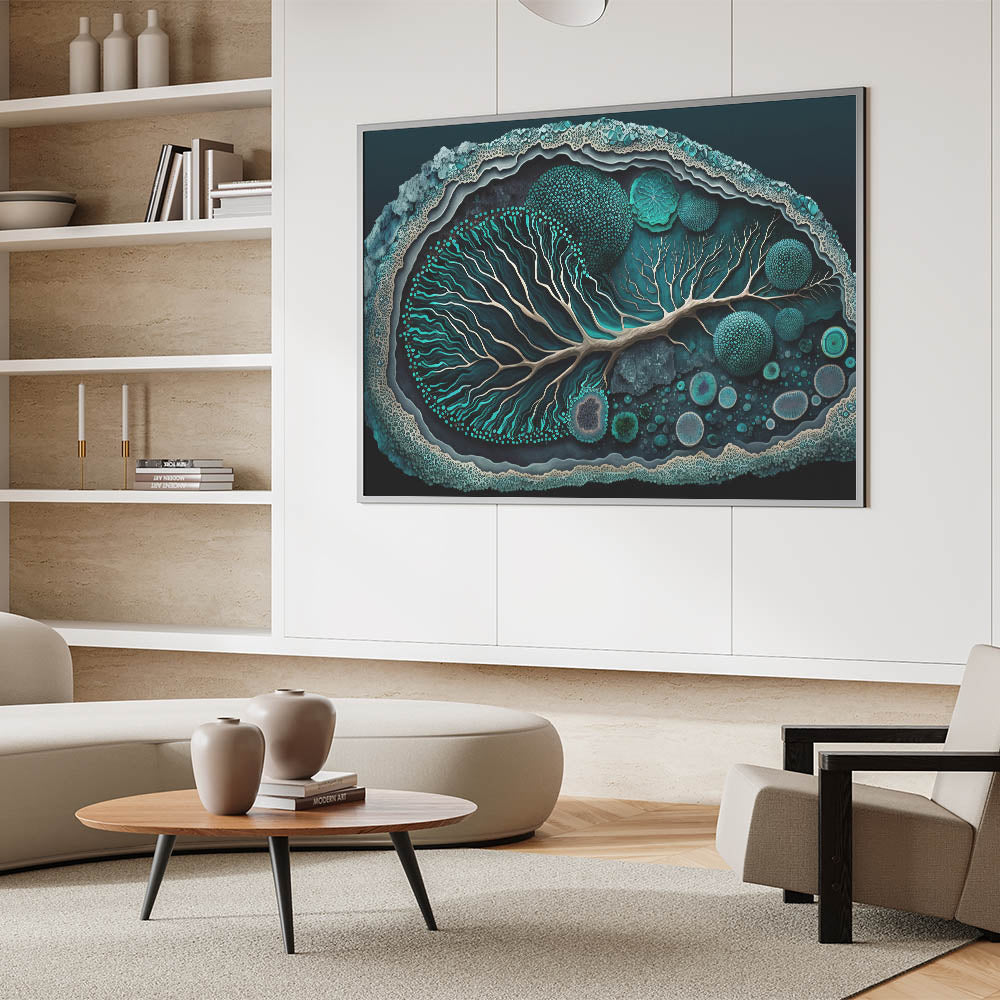This stunning floral abstract canvas art showcases an intricate, oceanic-inspired botanical pattern in rich teal and beige hues. The design captures the beauty of underwater flora with detailed textures and vibrant colors, evoking the mystery and elegance of the deep sea. Ideal for modern and eclectic spaces, this piece combines nature with abstract artistry, making it a perfect focal point for any room.