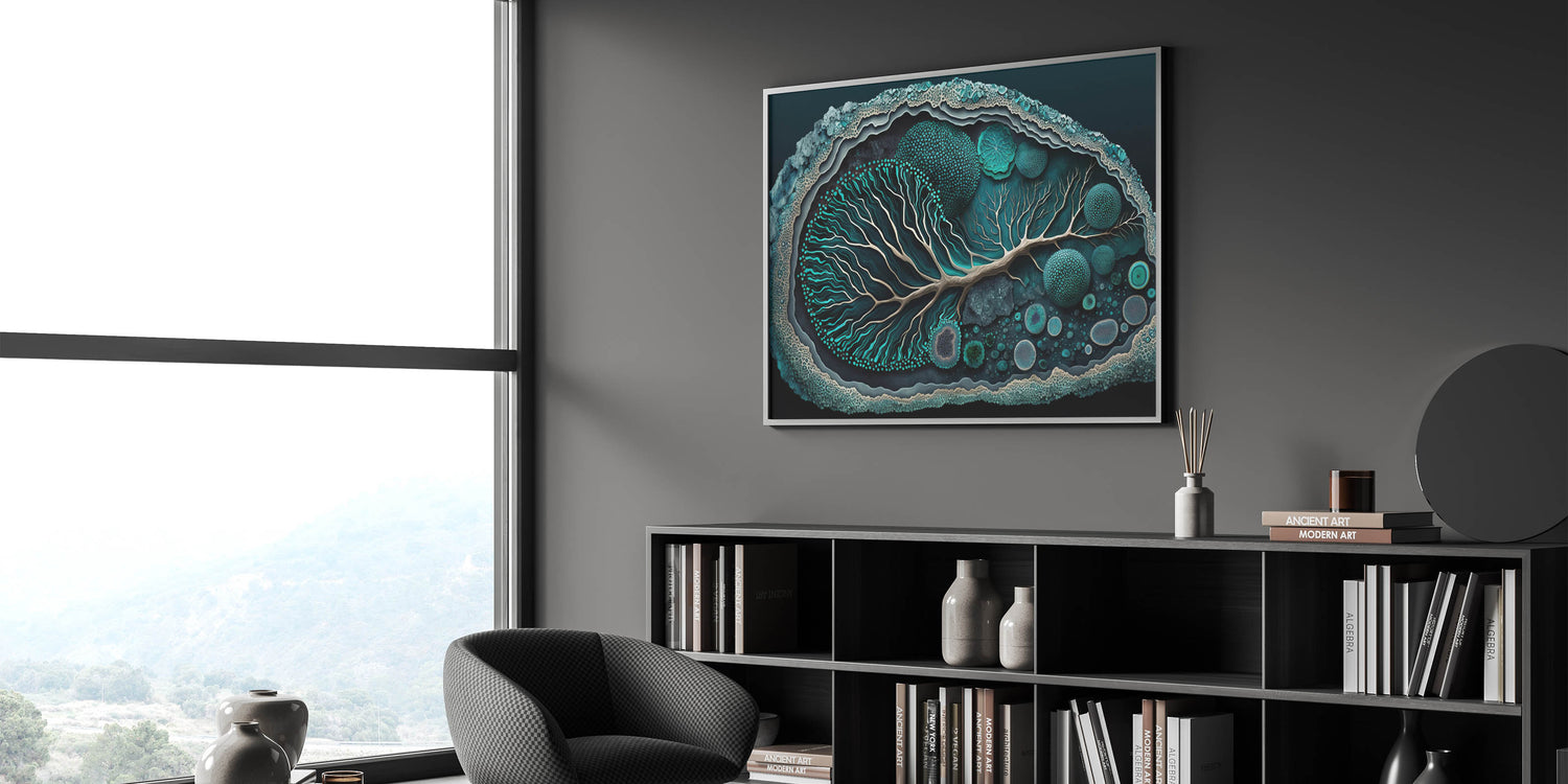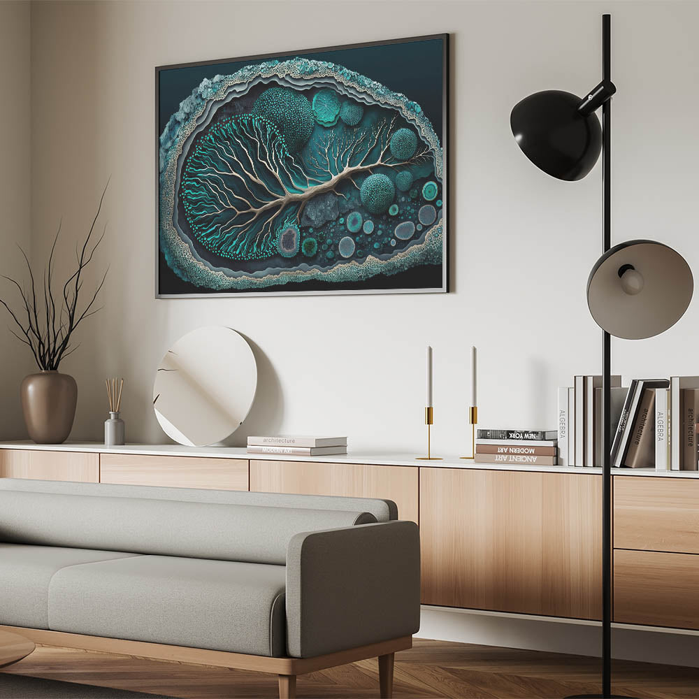 Enhance your decor with this unique floral abstract artwork, bringing a serene, aquatic vibe to your home. Its intricate details and rich colors make it an ideal choice for anyone looking to add a touch of nature’s beauty with a contemporary twist.
