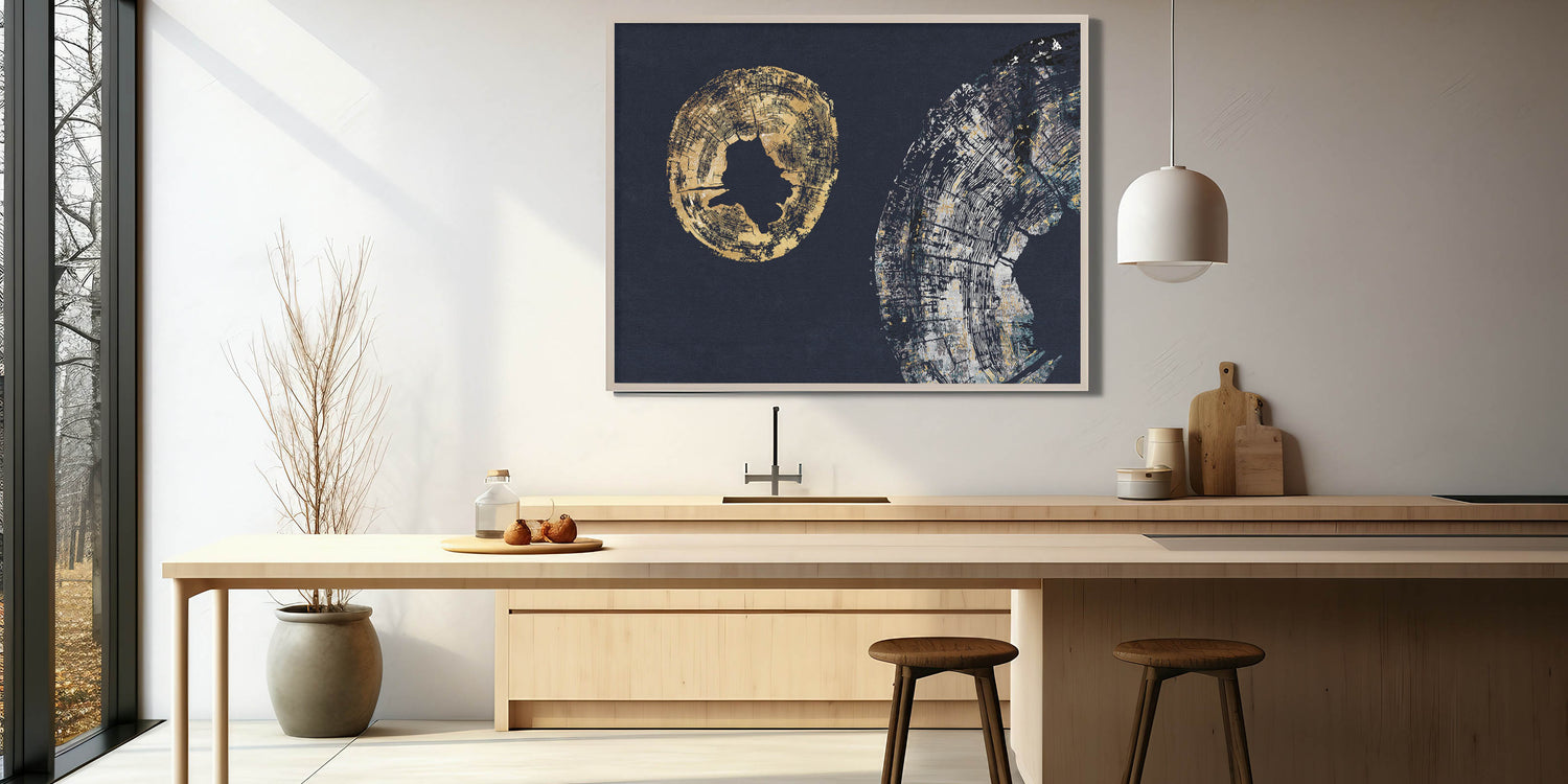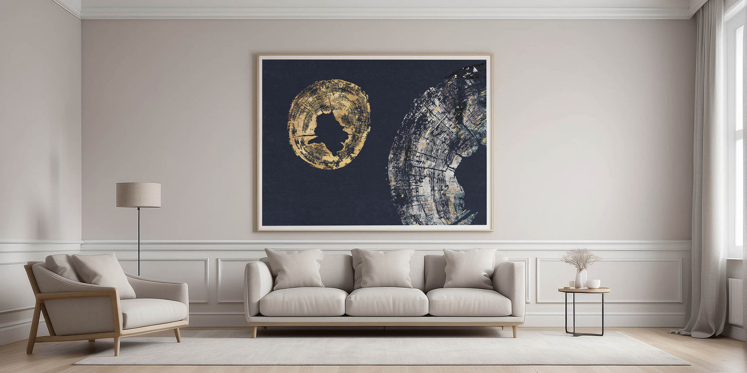 Transform your space with this Golden and Navy Abstract Rings canvas art, a minimalist piece that merges modern design with a touch of elegance. The artwork features two prominent circular forms, one in rich gold and the other in textured navy blue, set against a deep navy background. The juxtaposition of the solid gold and navy rings creates a striking visual contrast, bringing a sense of balance and sophistication to your decor. This piece is perfect for those who appreciate minimalist design with a bold, artistic edge.