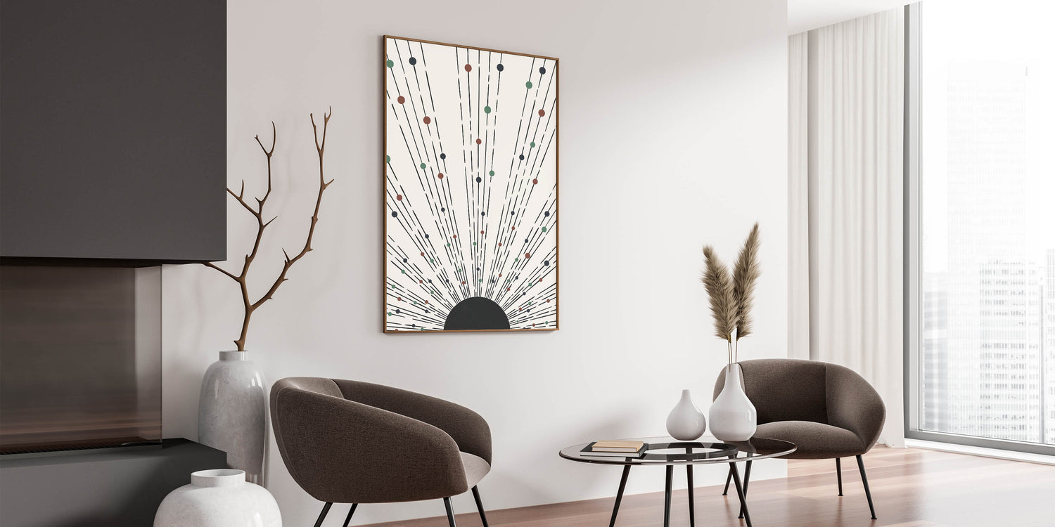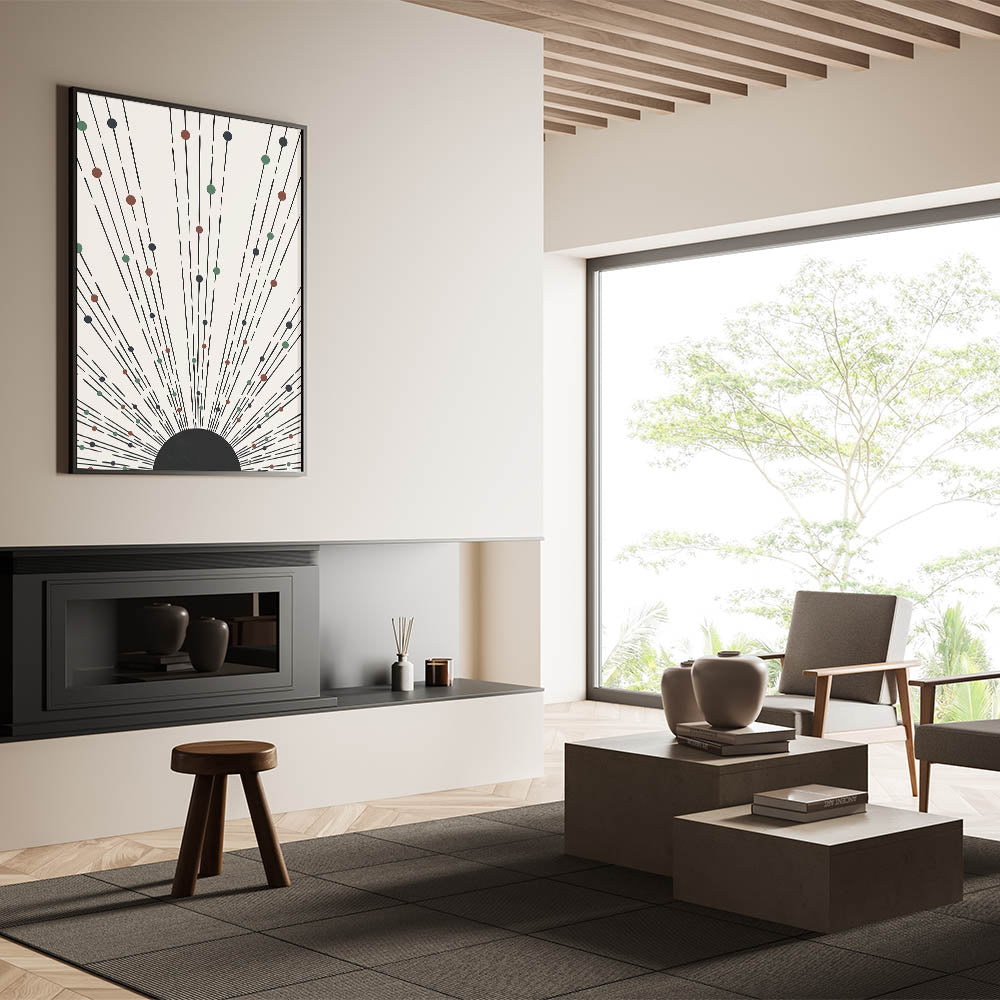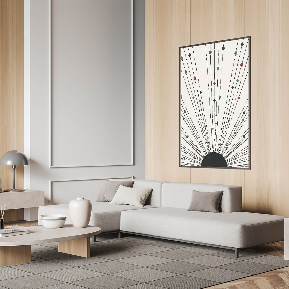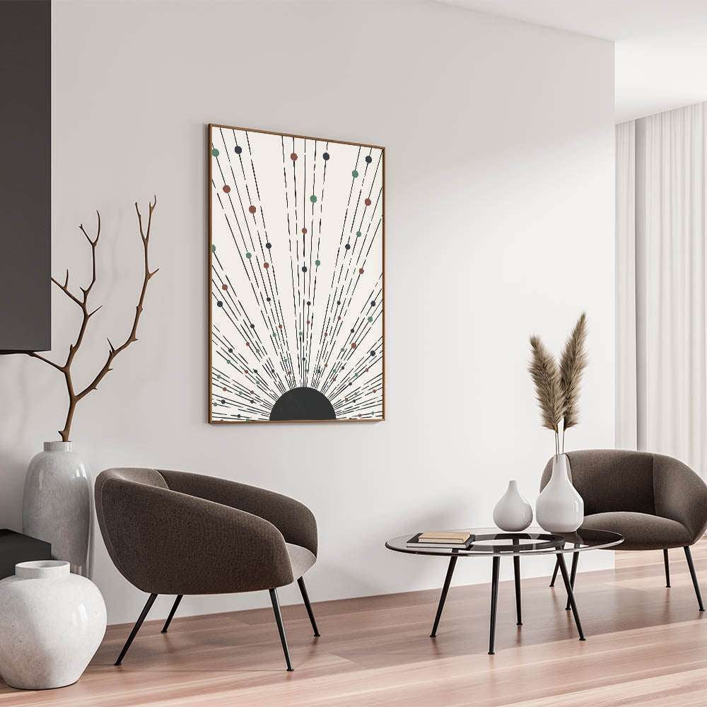 Introduce a striking element of simplicity to your space with this Minimalist Abstract Art design. Featuring a modern geometric sunburst pattern, this piece offers a stunning blend of clean lines and simple shapes, making it the perfect addition to any contemporary decor. The high-contrast black sun at the base of the design is complemented by fine lines and dots in green, brown, and black, creating a visually compelling abstract composition.