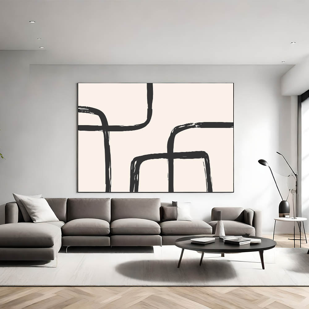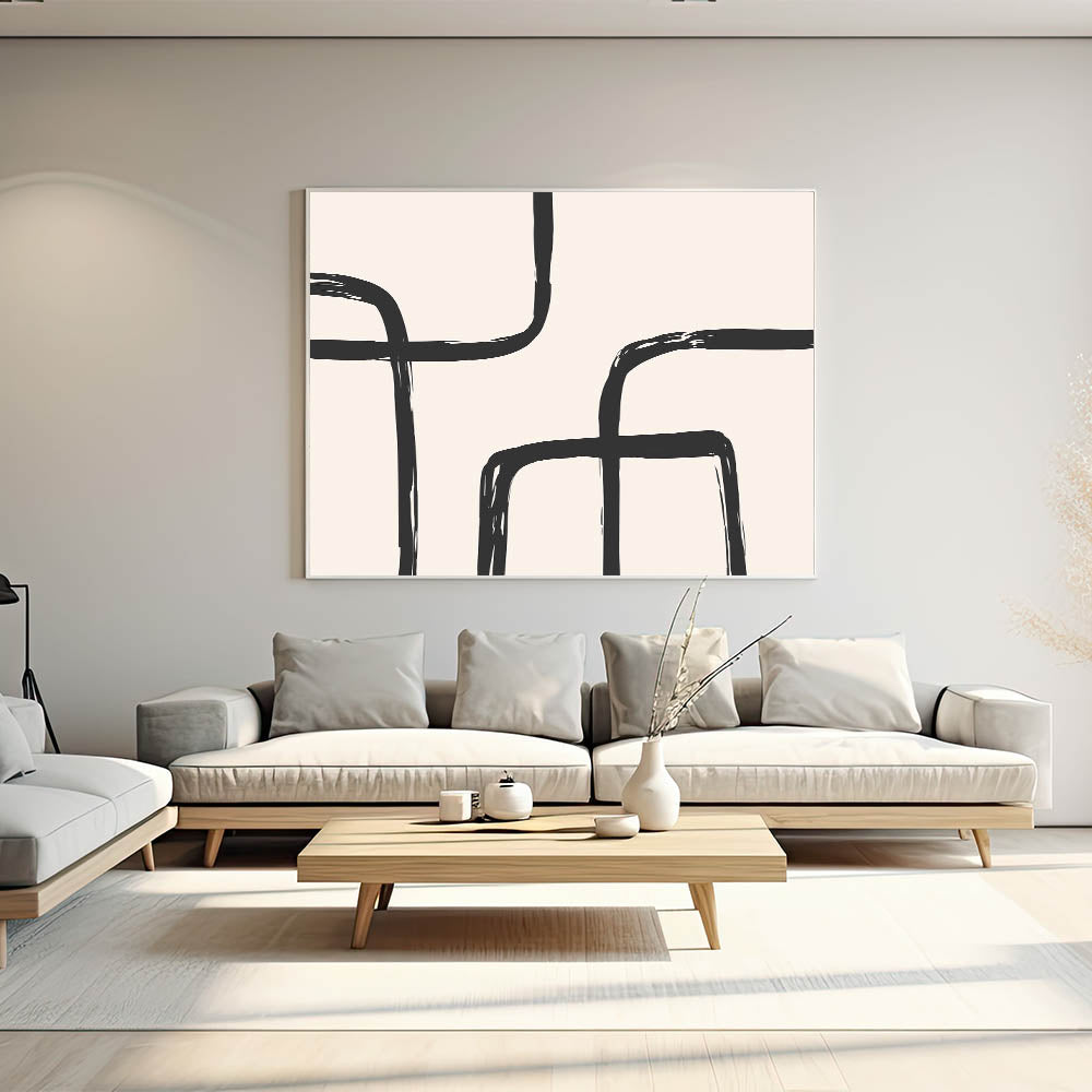 Introducing a stunning piece of minimalist abstract art that embodies modern simplicity and elegance. This design features bold black brushstrokes against a soft beige background, creating a striking contrast that draws the eye without overwhelming the space. Perfect for those who appreciate clean lines and subtle sophistication, this artwork is a versatile addition to any room.