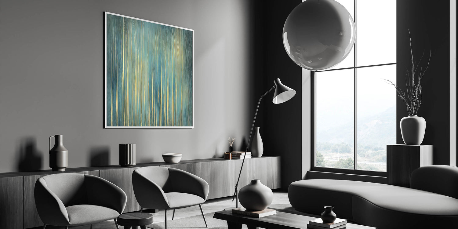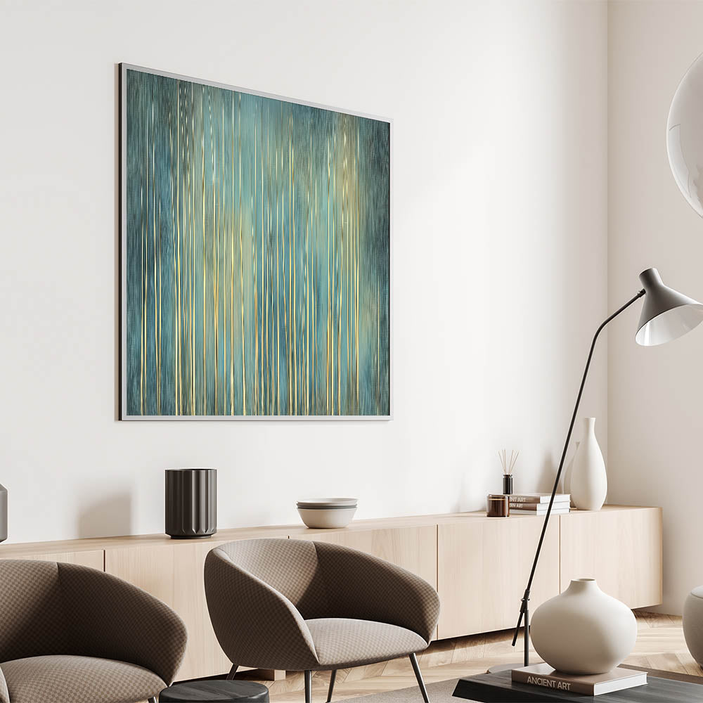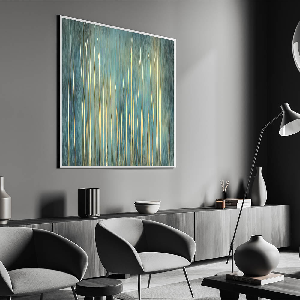 Introduce tranquility and sophistication to your home with this minimalist forest-inspired abstract artwork. Featuring sleek vertical lines in hues of teal, gold, and soft green, this design evokes the elegance of tall trees bathed in gentle light. The soothing gradient background adds depth and movement, creating a serene and modern aesthetic.