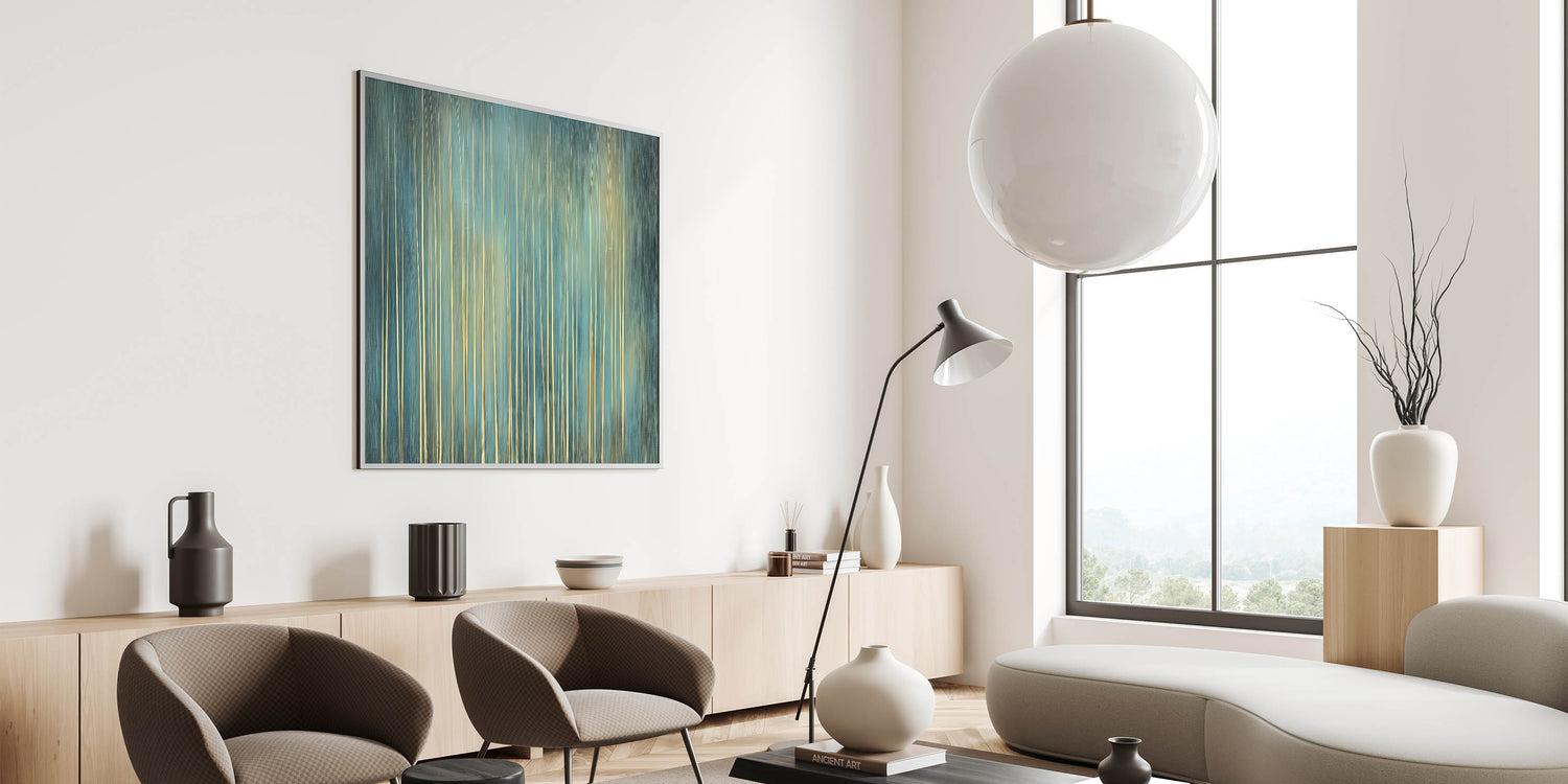 Transform your space with this elegant abstract forest artwork. Its minimalist design and tranquil colors create a timeless and harmonious ambiance, perfect for any decor.