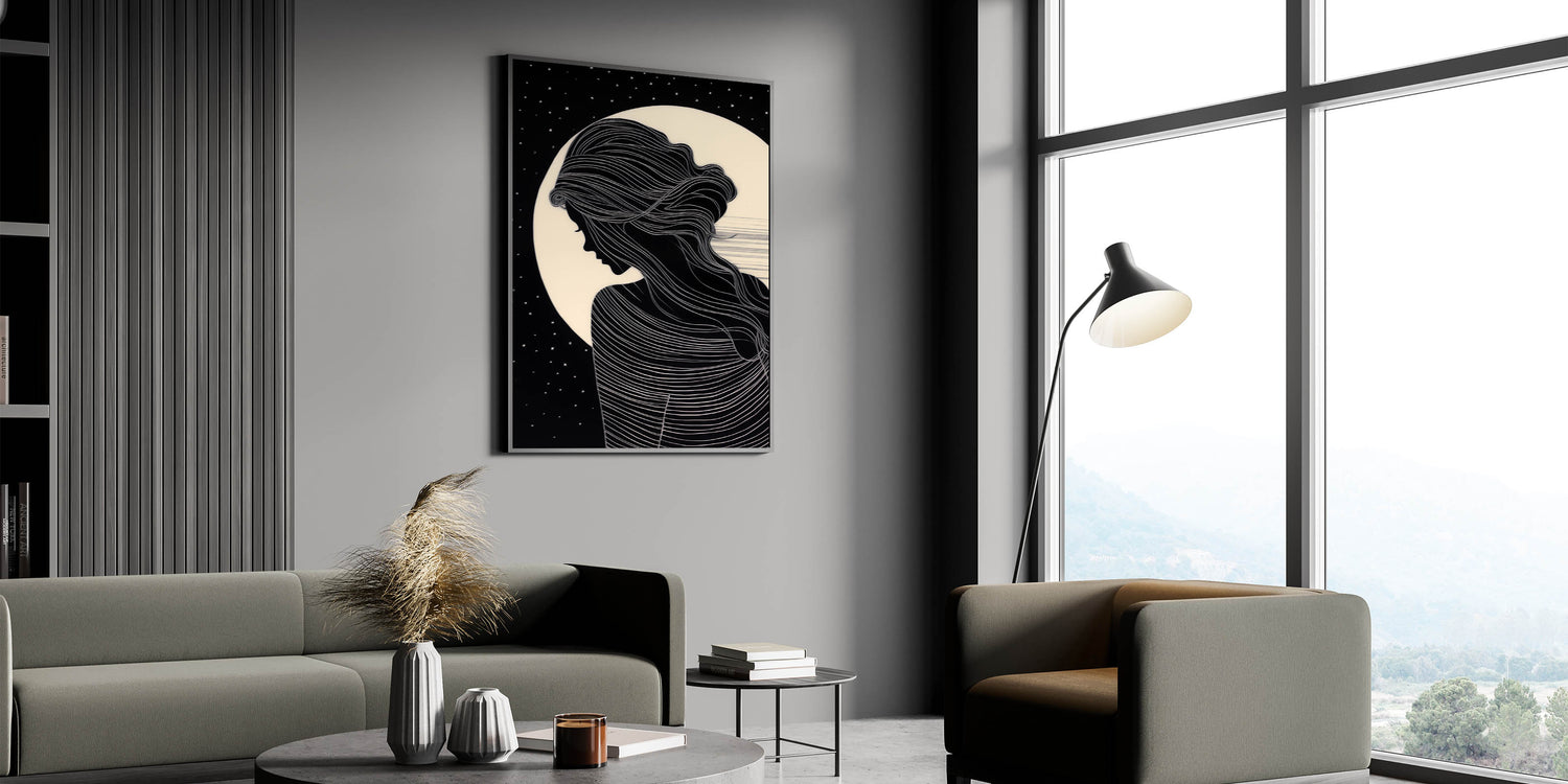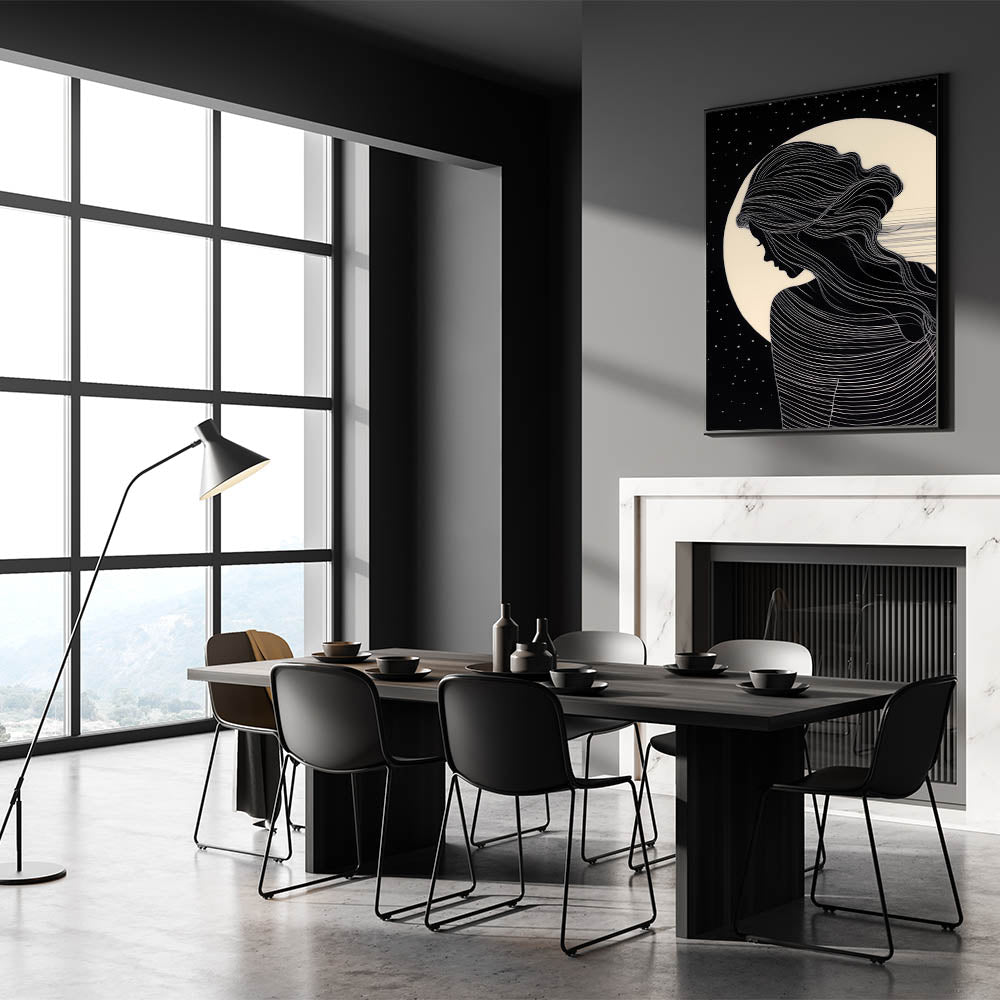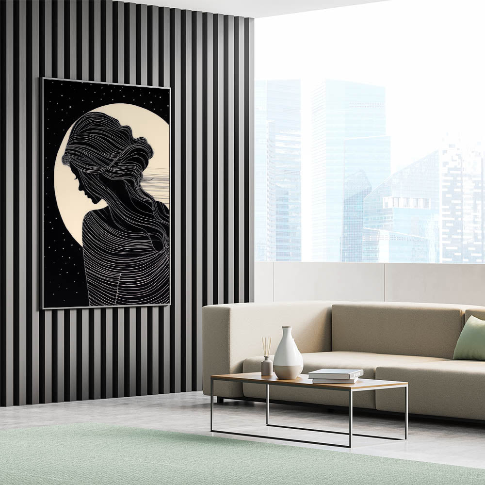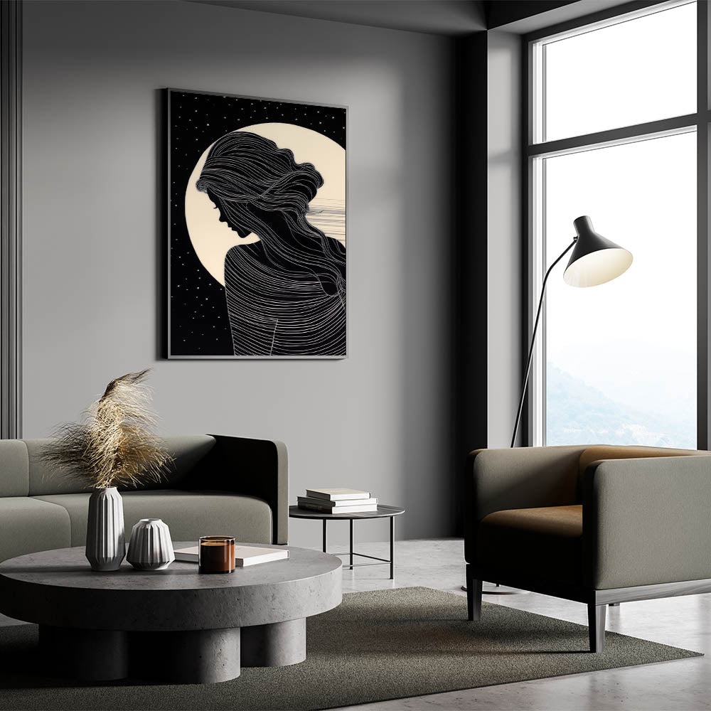 Bring an ethereal and captivating presence to your space with this minimalist silhouette art of a woman in moonlight. The delicate flowing lines of her hair blend seamlessly with the starry night sky, creating a sense of movement and serenity. The contrast of black and white emphasizes the simple yet profound beauty of the design, making it perfect for contemporary and minimalist decor. This stunning piece adds a sense of mystery and elegance to any room, whether in a bedroom, living room, or office.
