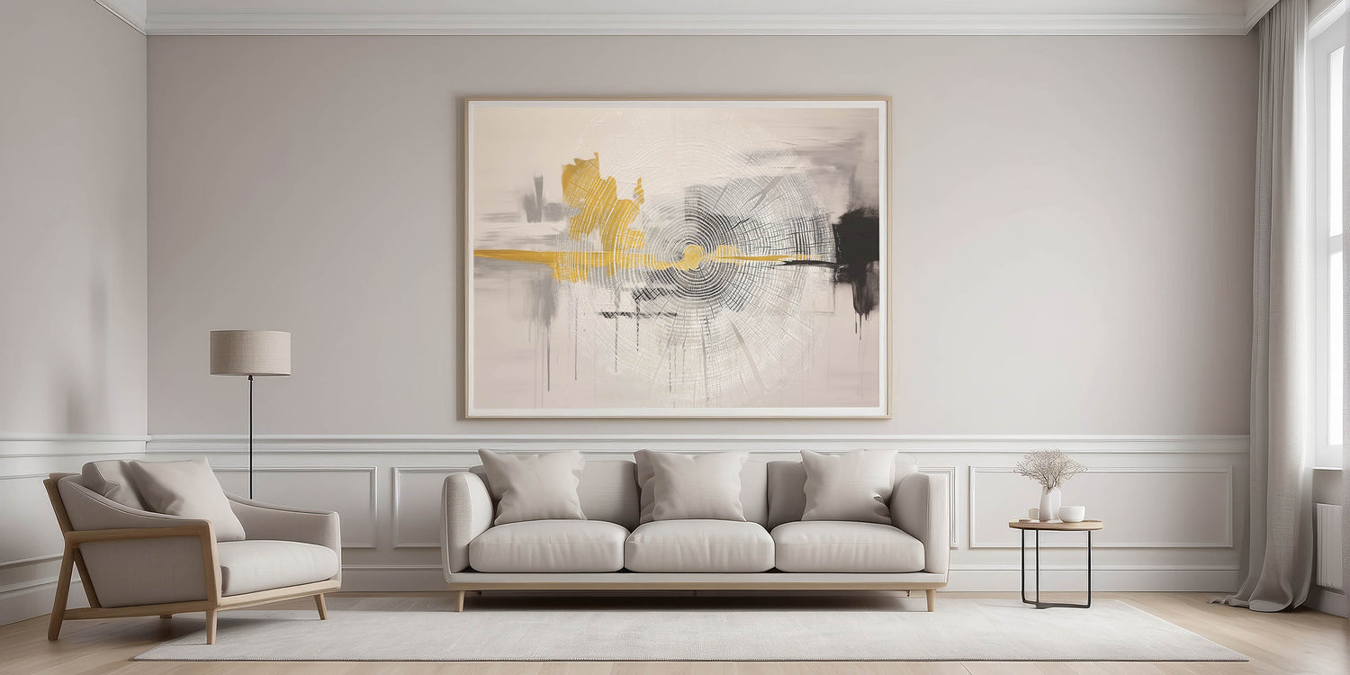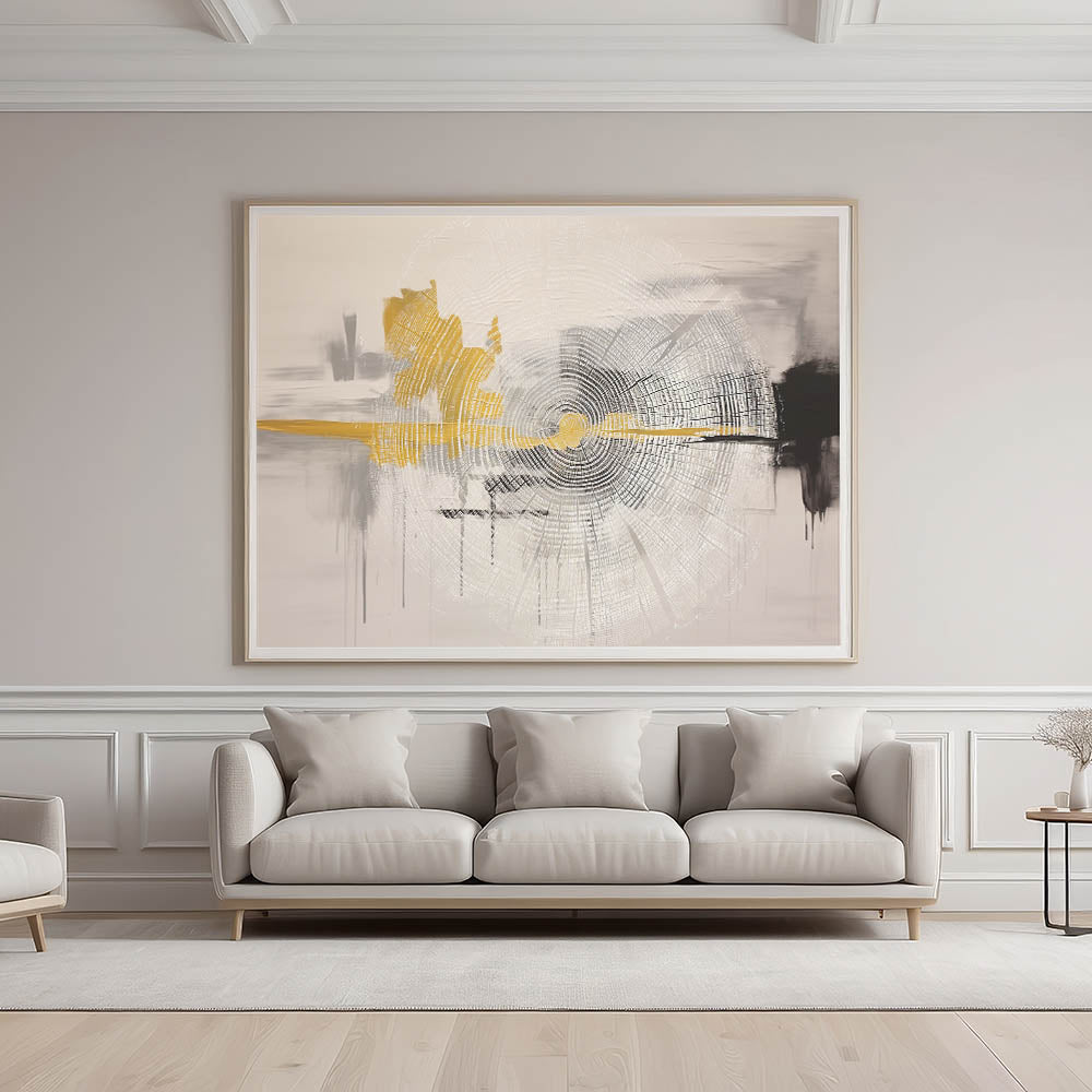 Elevate your space with this striking modern abstract artwork, featuring a dynamic blend of geometric lines and bold strokes in black, gray, and gold. The design draws the eye with its intricate circular patterns, layered textures, and a striking gold accent that runs through the center, adding a touch of luxury to the composition. Perfect for modern and minimalist interiors, this piece serves as a powerful focal point in any room.