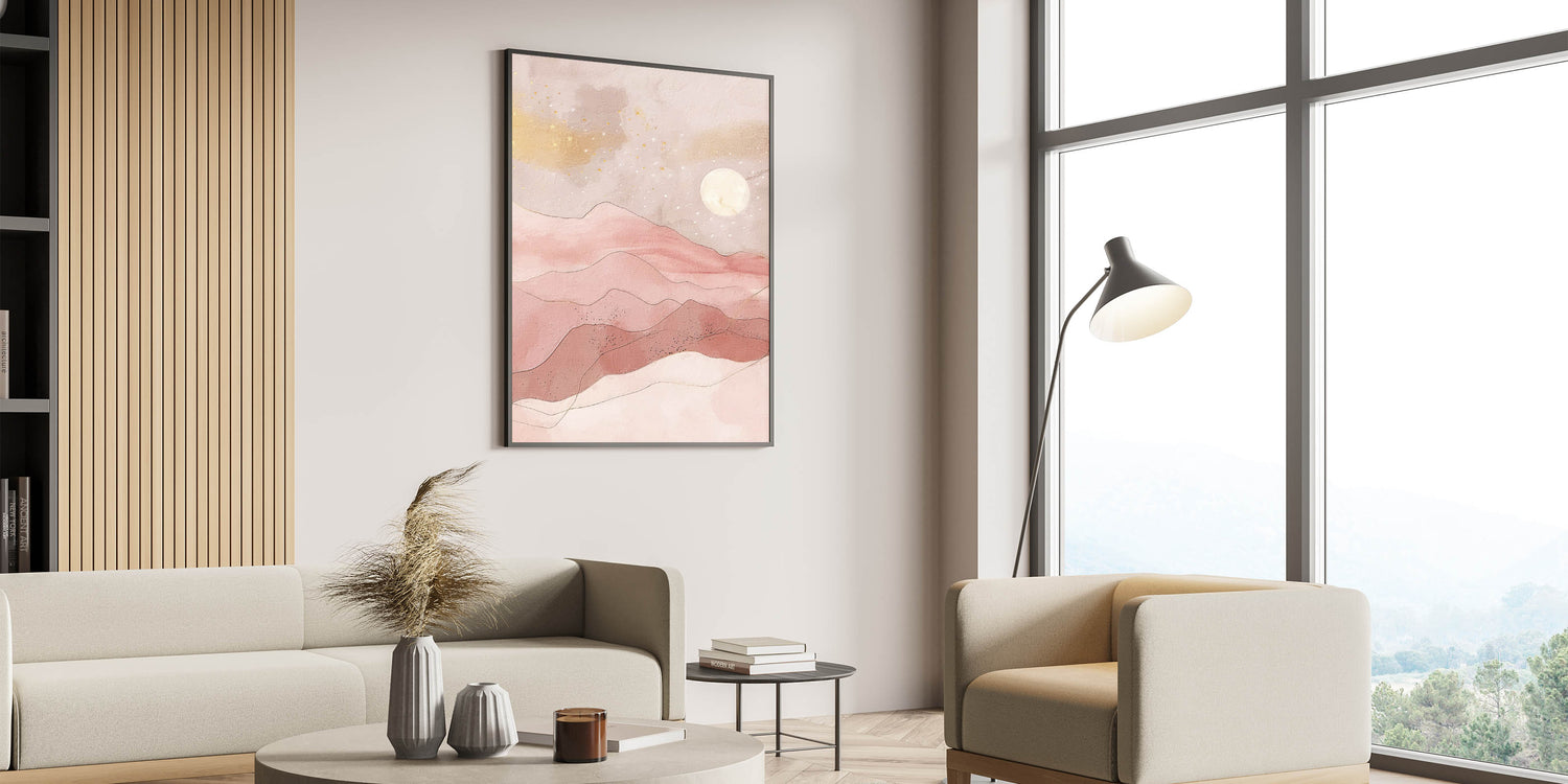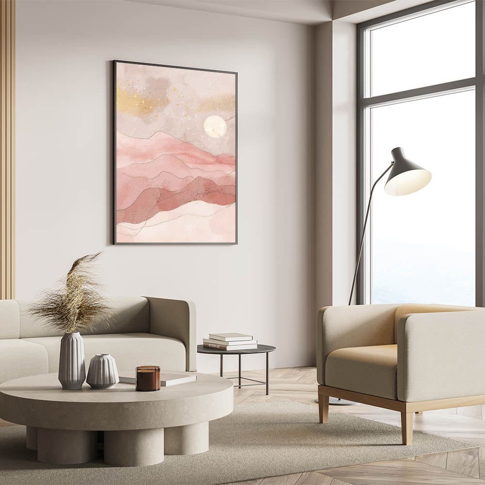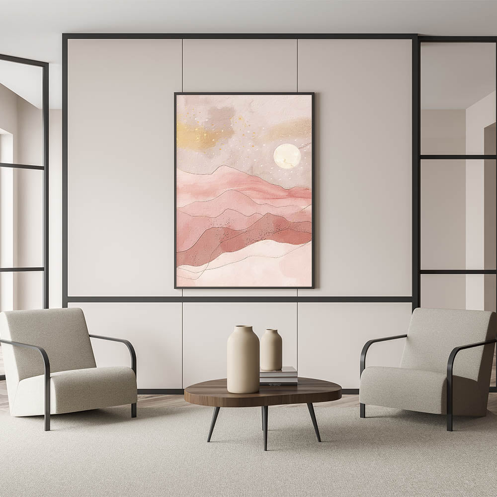 This captivating modern abstract landscape art piece brings a serene moonlit desert scene to life with soft hues and intricate details. Perfect for any contemporary space, this artwork blends warm tones of pink, beige, and hints of gold, creating a soothing and timeless aesthetic. The abstract mountain forms and subtle starry sky make this piece a standout addition to any room.