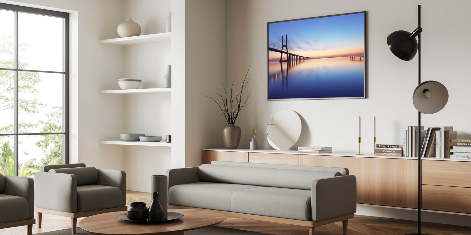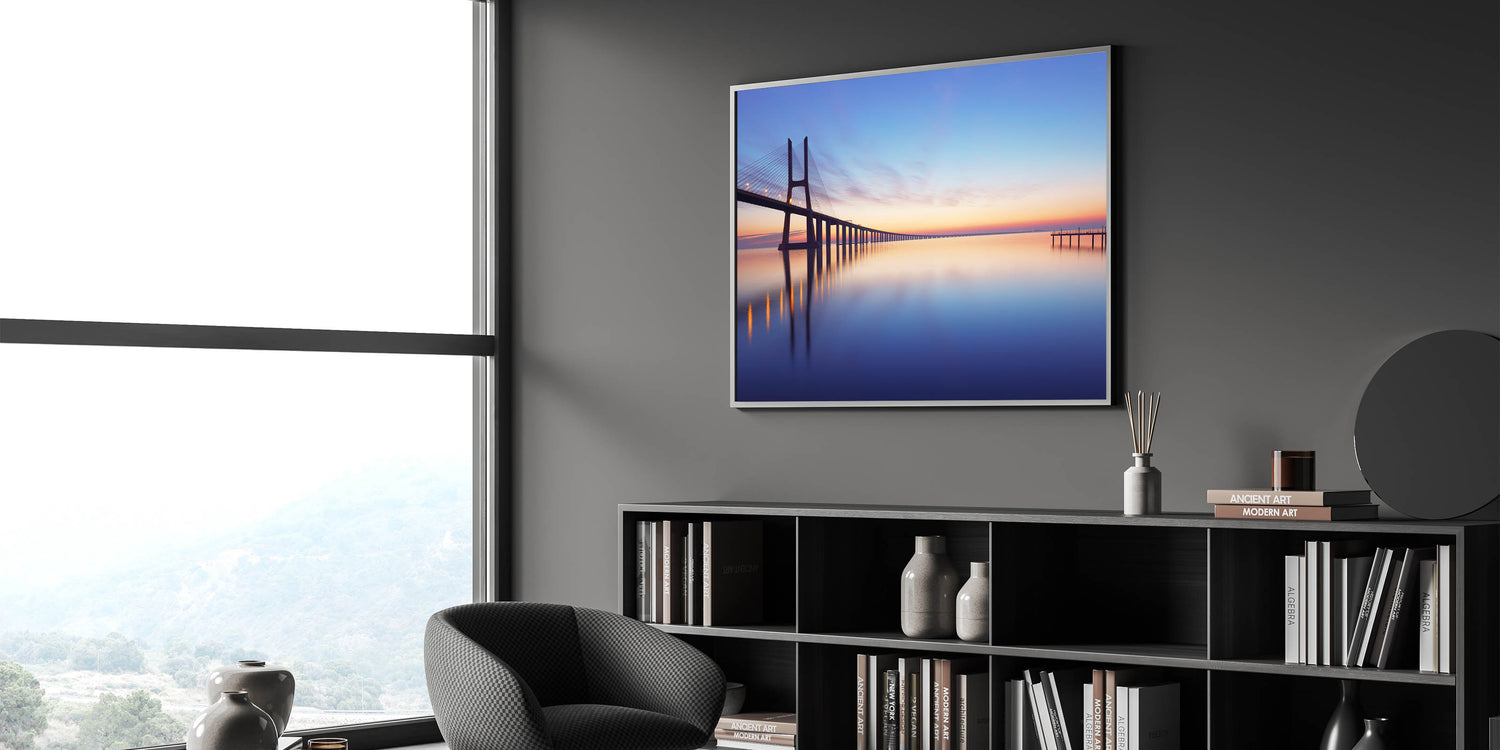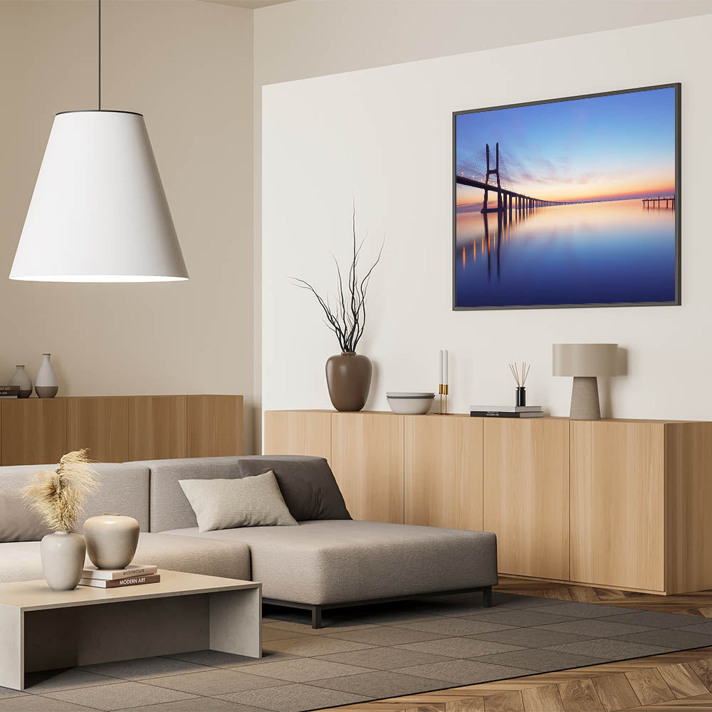 Capture the serenity of Lisbon with this stunning Lisbon canvas print, featuring the Vasco da Gama Bridge at sunrise. The peaceful reflection of the bridge in the still waters of the Tagus River, combined with the soft colors of dawn, creates a breathtaking and calming atmosphere. Perfect for adding a touch of tranquility to any space, this artwork embodies the harmonious blend of architecture and nature that defines Portugal’s coastal beauty.