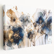 Enhance your home with this stunning floral abstract wall art, featuring deep navy blue blooms accented with elegant gold and beige tones. This modern wall art piece blends contemporary artistry with nature-inspired beauty, making it the perfect wall art for living rooms or any stylish interior. The fluid brushstrokes and delicate gold details create a luxurious and sophisticated ambiance, adding warmth and character to your space.