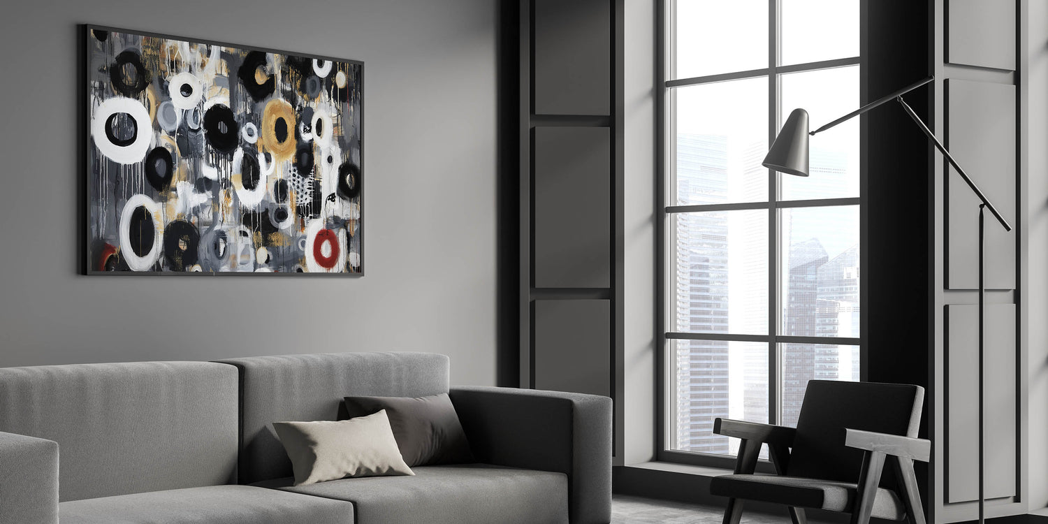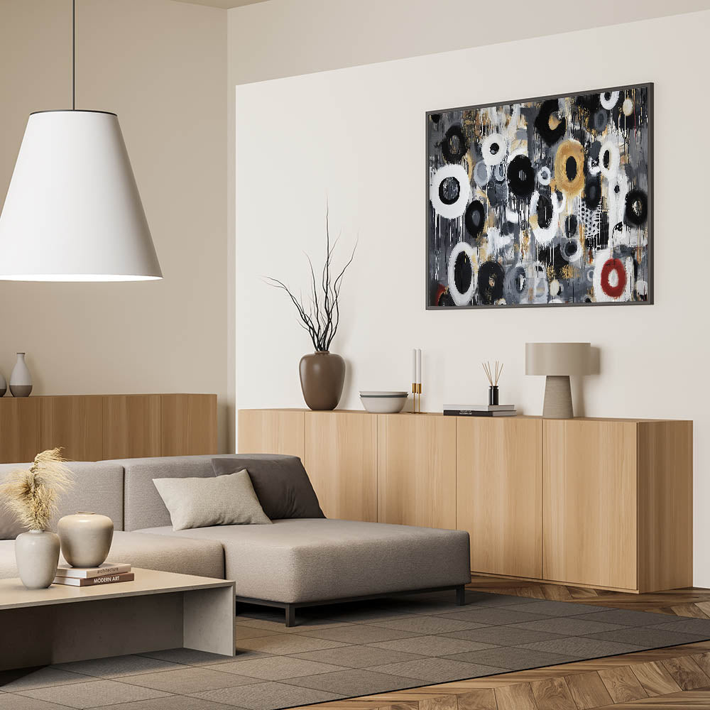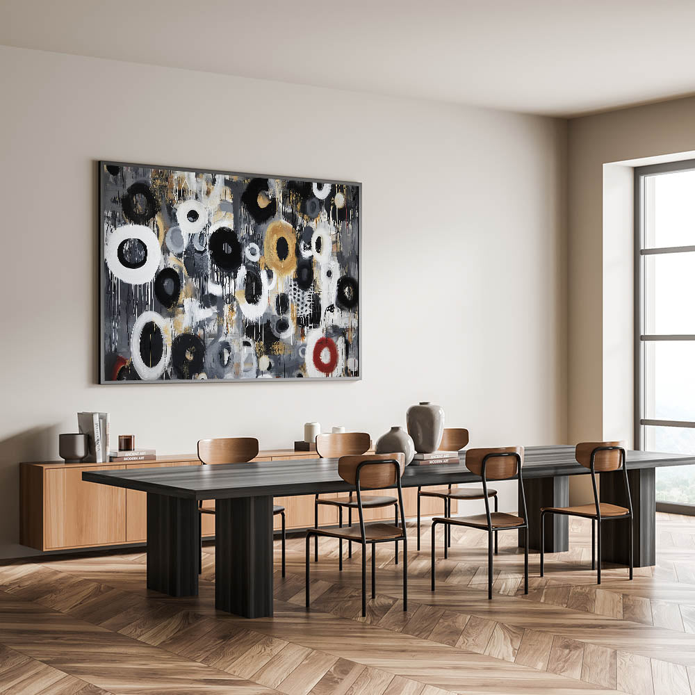 Add energy and sophistication to your space with this living room wall art, featuring an expressive black, white, gold, and red abstract circular design. The fluid brushstrokes, layered textures, and dynamic drips bring a sense of movement and contemporary style, making this modern wall art perfect for modern living room decor. Whether placed in a minimalist setting or paired with bold interiors, this canvas wall art makes a stunning focal point.