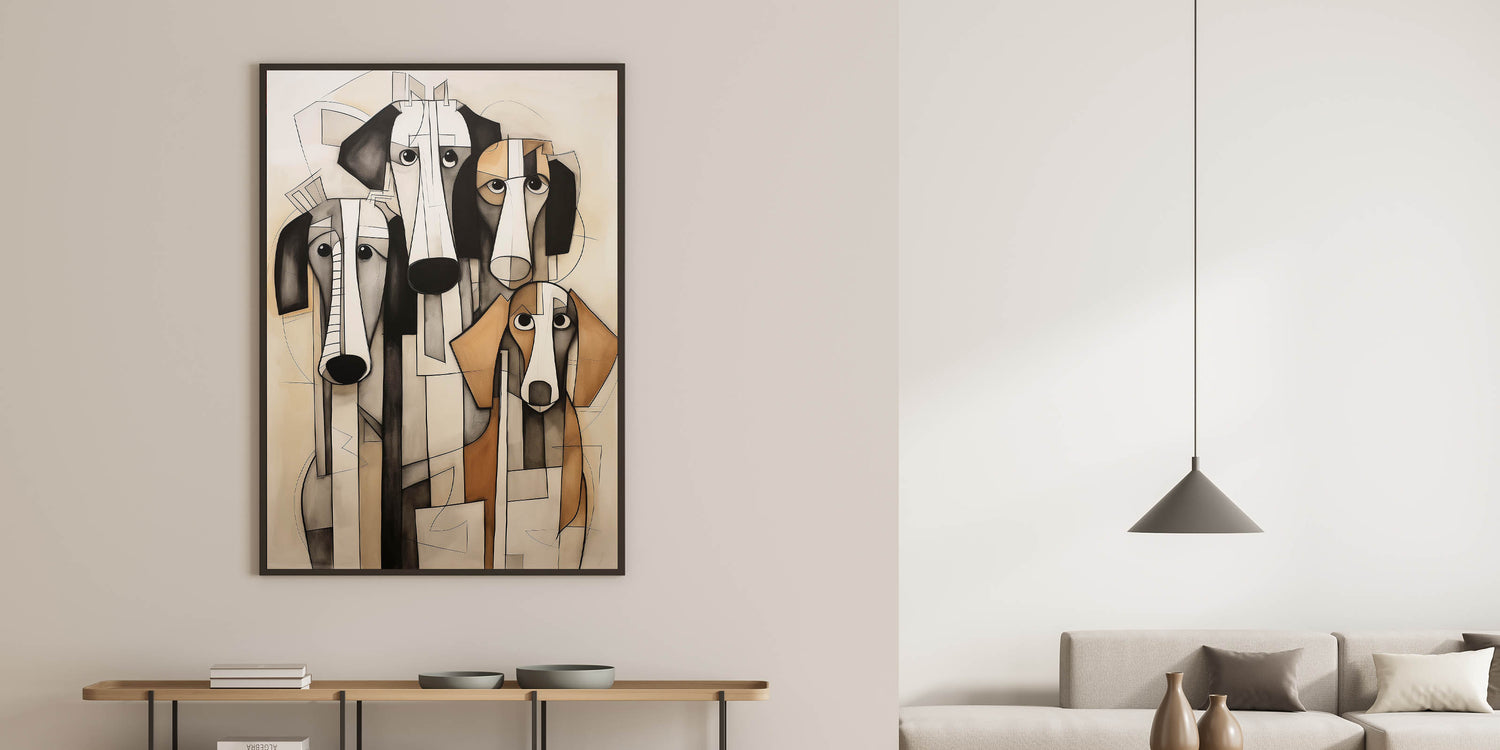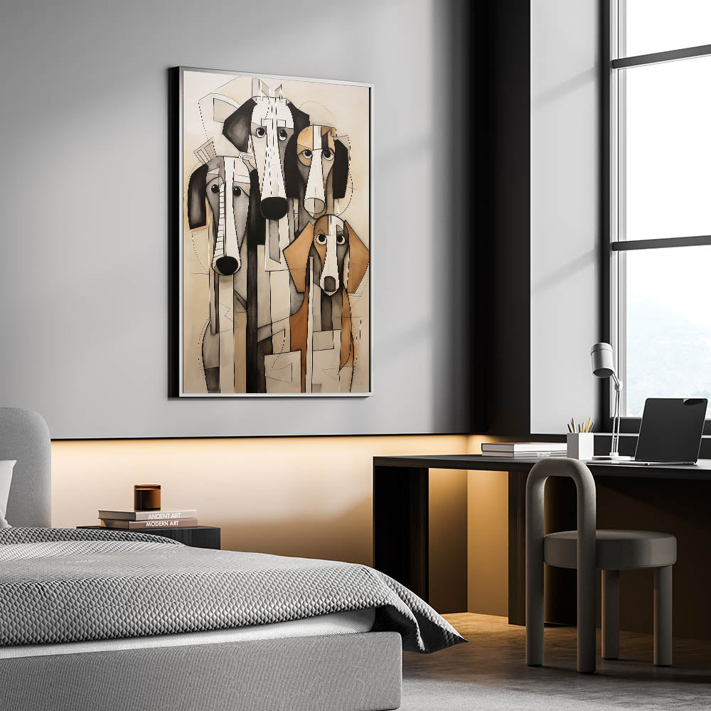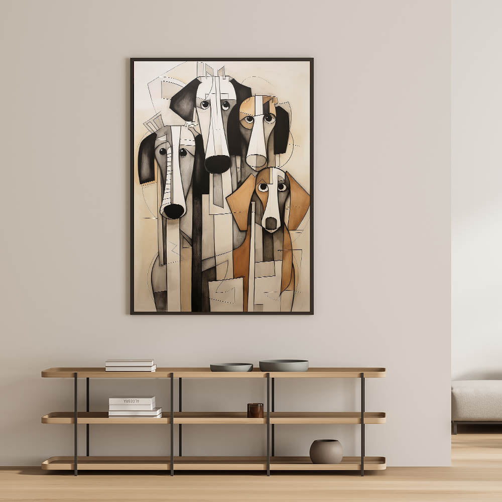 Celebrate creativity and personality with this abstract dog portrait wall art, a unique blend of cubism and modern design. The composition features four expressive dogs in black, white, beige, and brown hues, creating an artistic and stylish statement piece for modern living room decor. Whether displayed as canvas wall art or framed wall art, this piece brings a contemporary edge to your home.