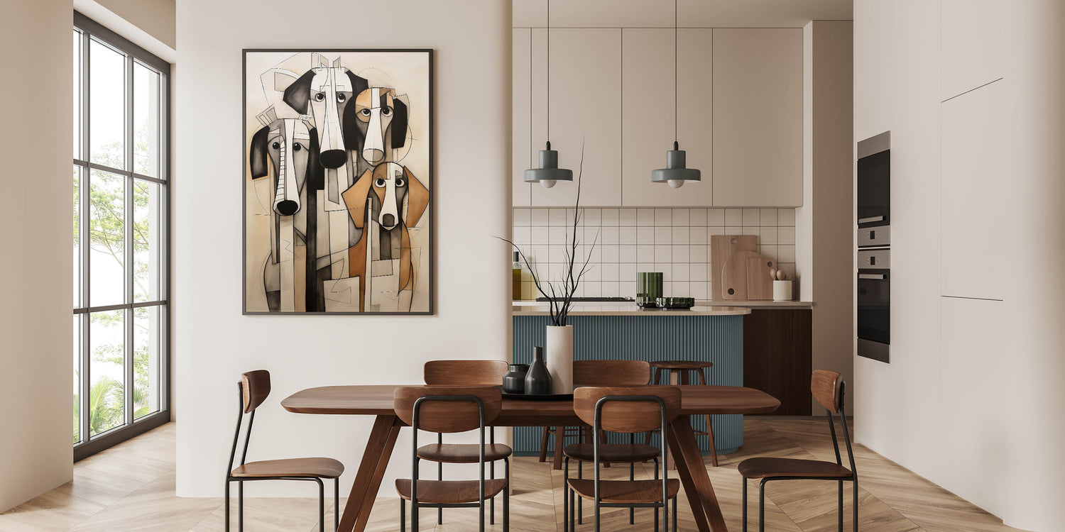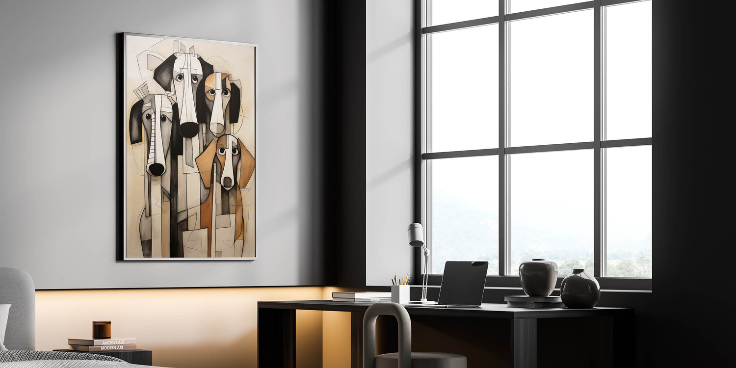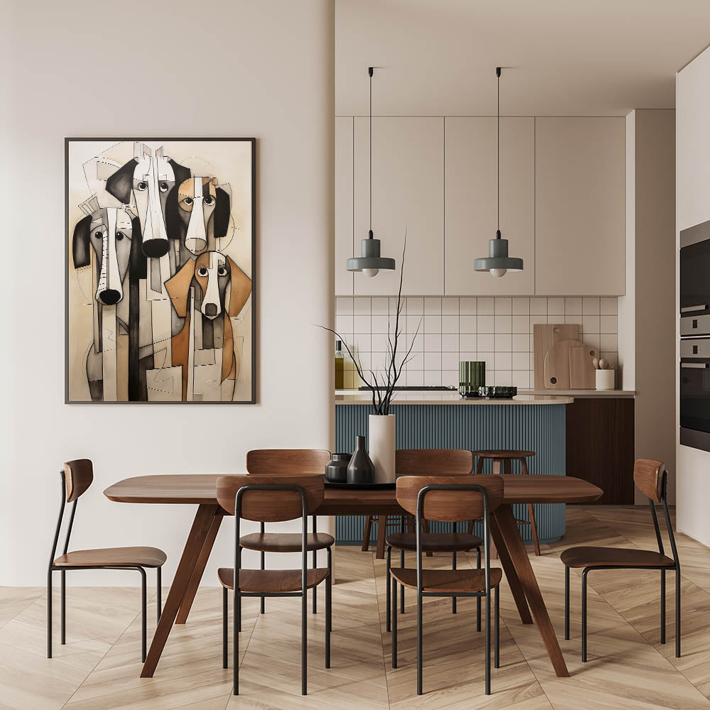 Celebrate creativity and personality with this abstract dog portrait wall art, a unique blend of cubism and modern design. The composition features four expressive dogs in black, white, beige, and brown hues, creating an artistic and stylish statement piece for modern living room decor. Whether displayed as canvas wall art or framed wall art, this piece brings a contemporary edge to your home.