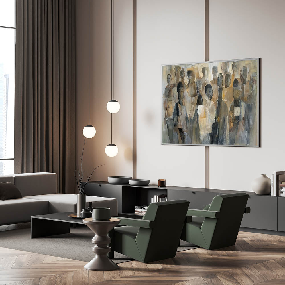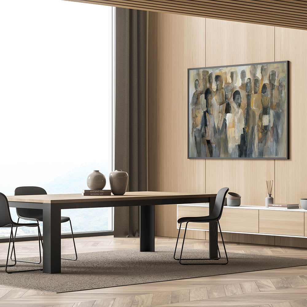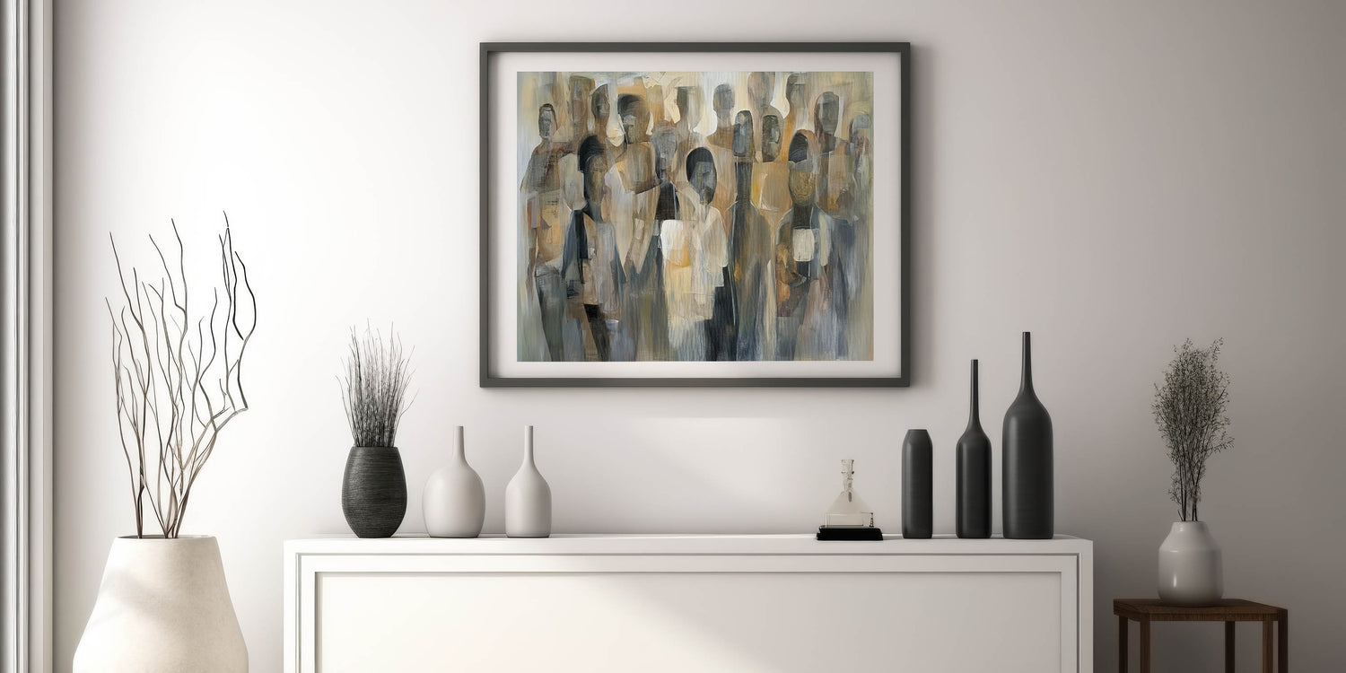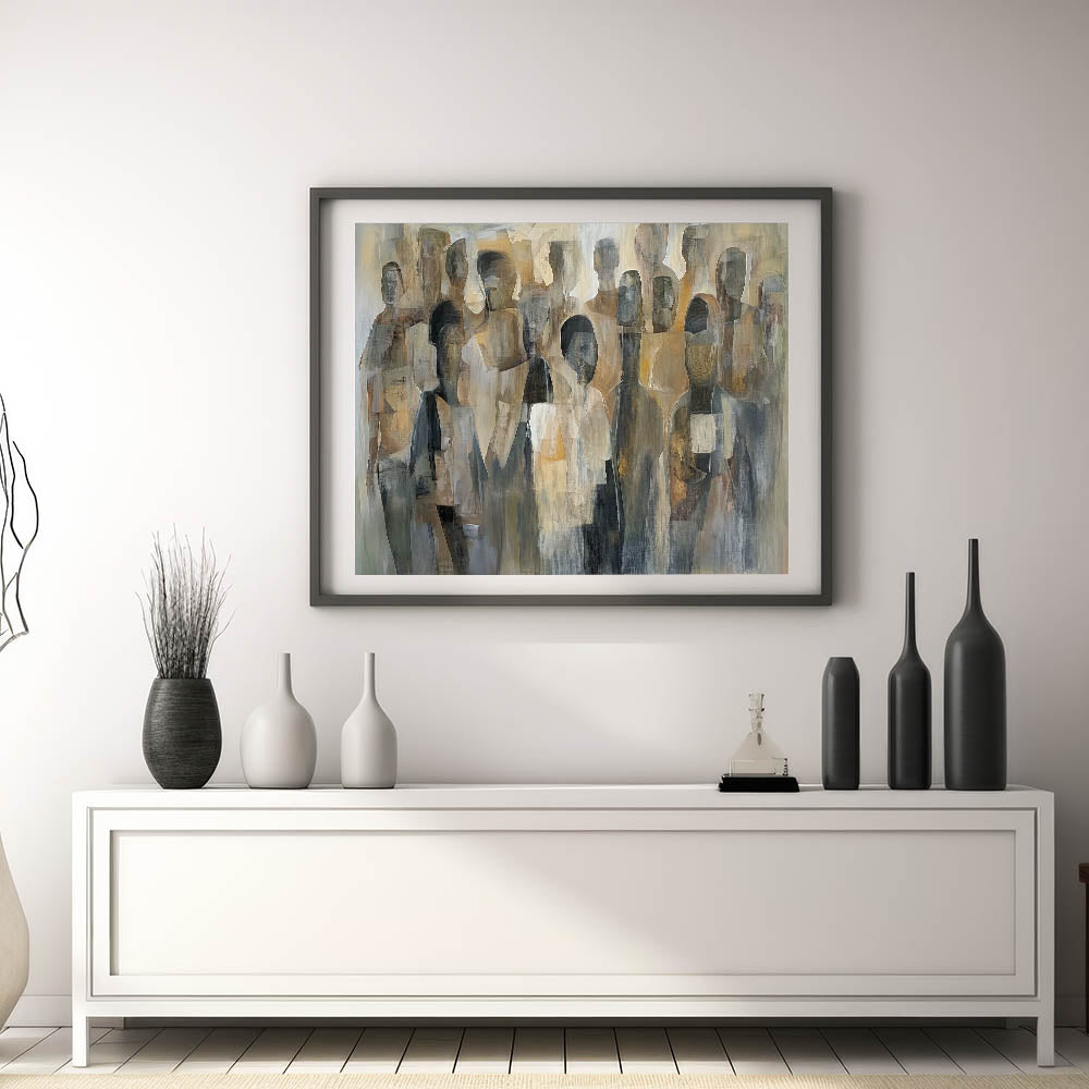 Elevate your space with this abstract figurative wall art for the living room. This captivating artwork features a blend of neutral beige, gray, and brown tones, forming a contemporary representation of human figures in an abstract composition. The modern wall art design adds depth and sophistication, making it an ideal centerpiece for contemporary living room decor.