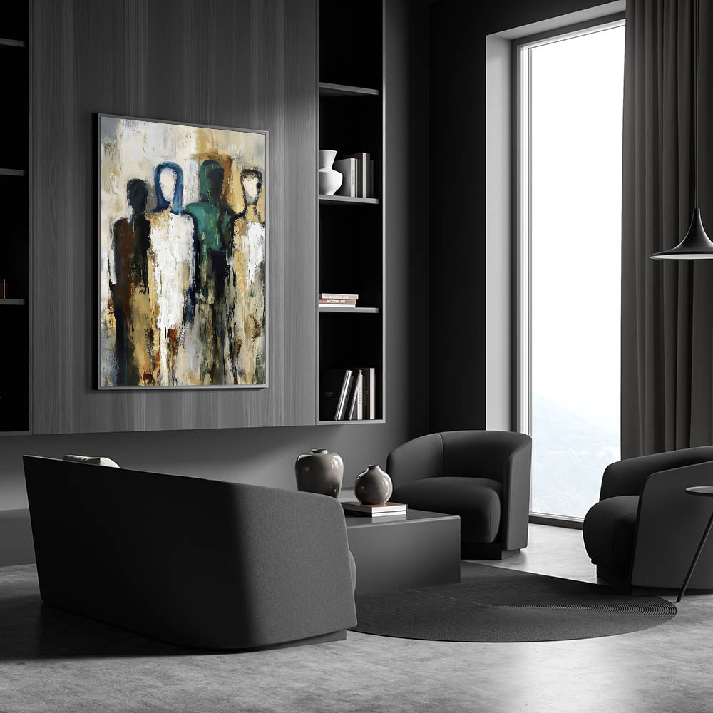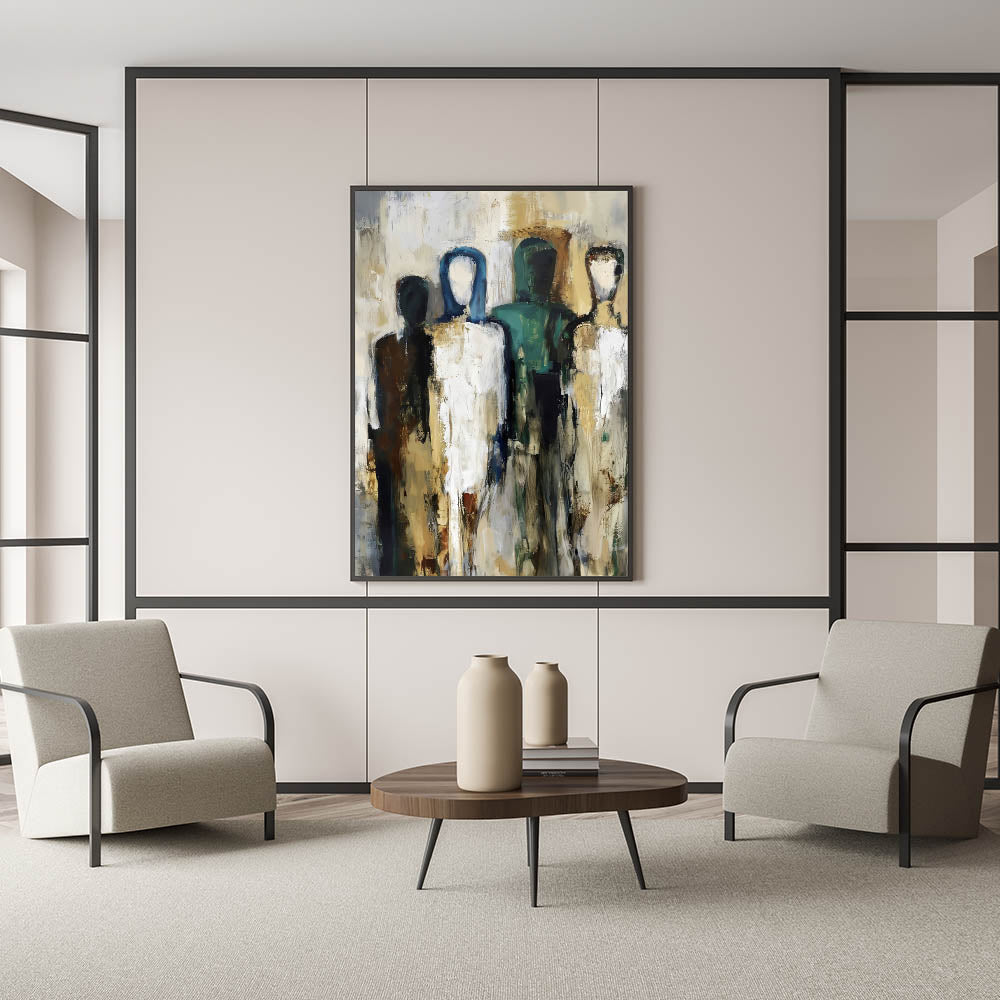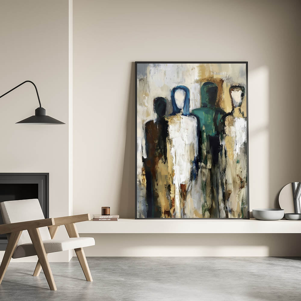 Add a touch of artistic intrigue with this stunning abstract wall art for living rooms, featuring a faceless group of figures painted in deep, expressive tones. The blend of modern living room décor and emotional depth makes this contemporary art print a bold statement piece.