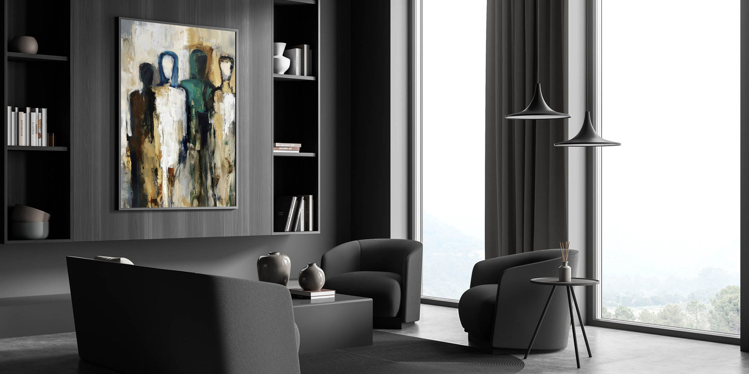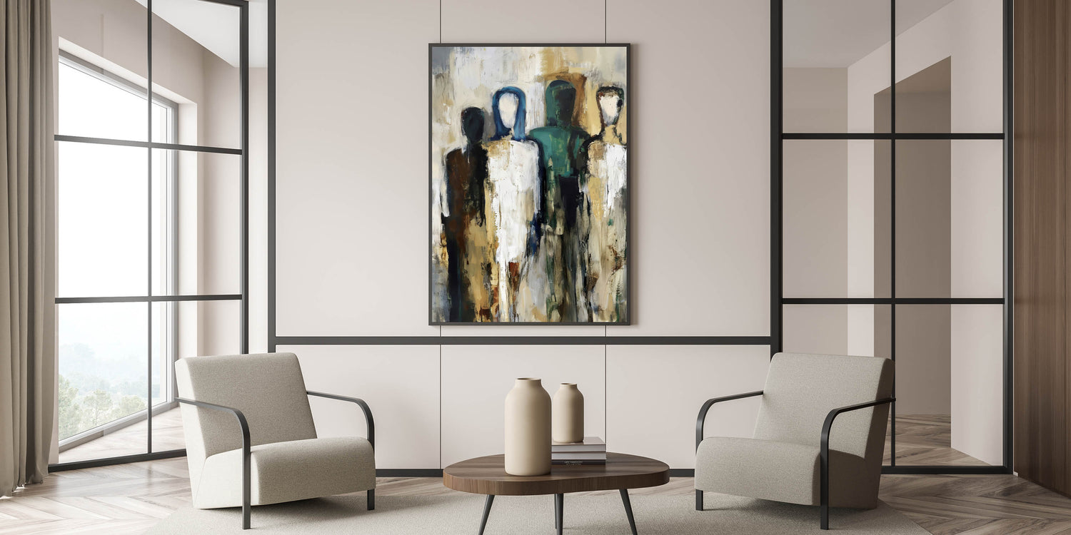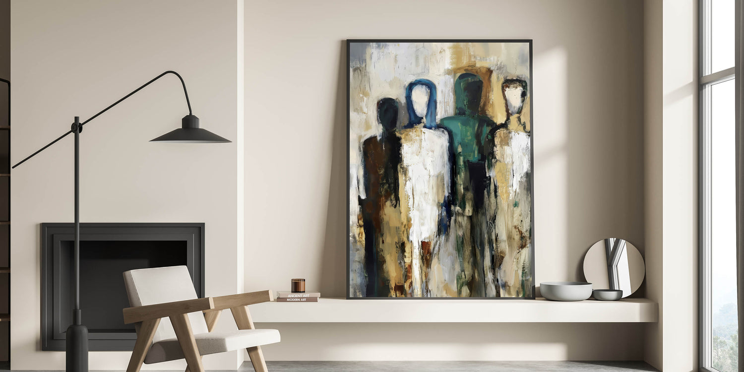 Add a touch of artistic intrigue with this stunning abstract wall art for living rooms, featuring a faceless group of figures painted in deep, expressive tones. The blend of modern living room décor and emotional depth makes this contemporary art print a bold statement piece.