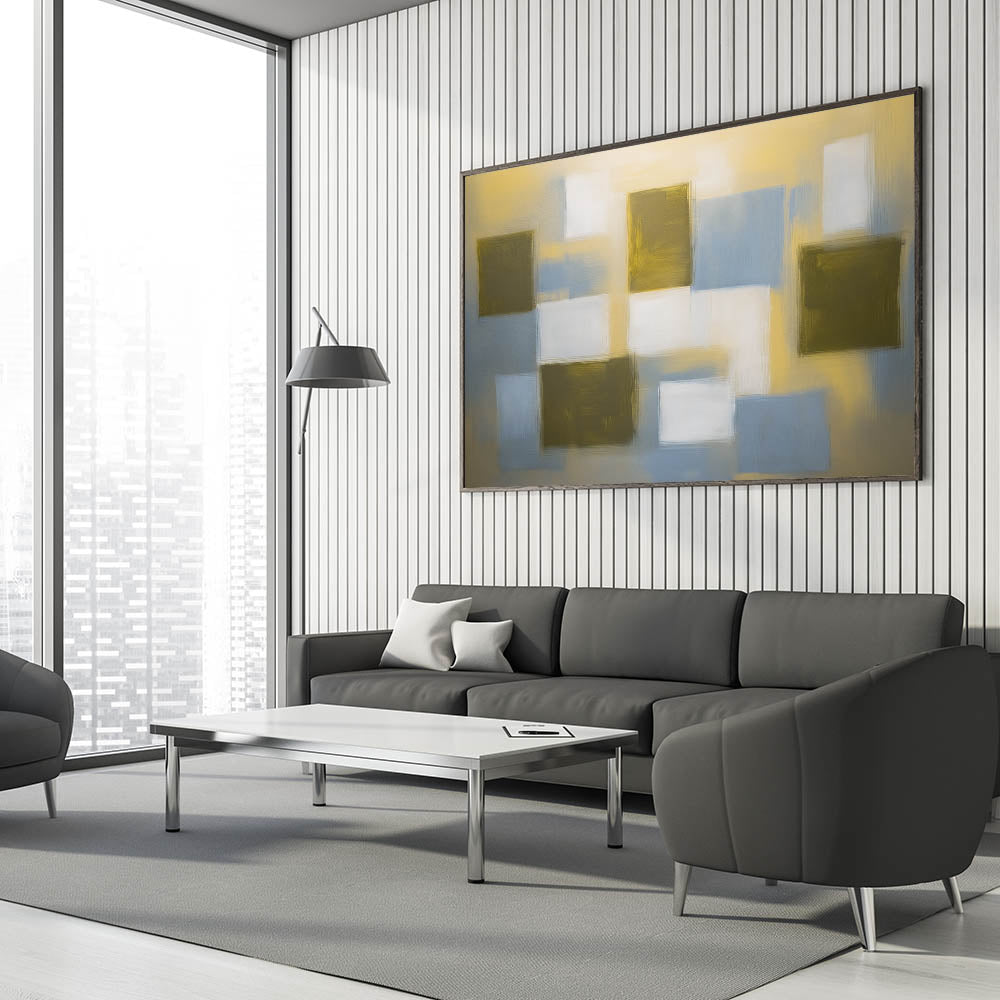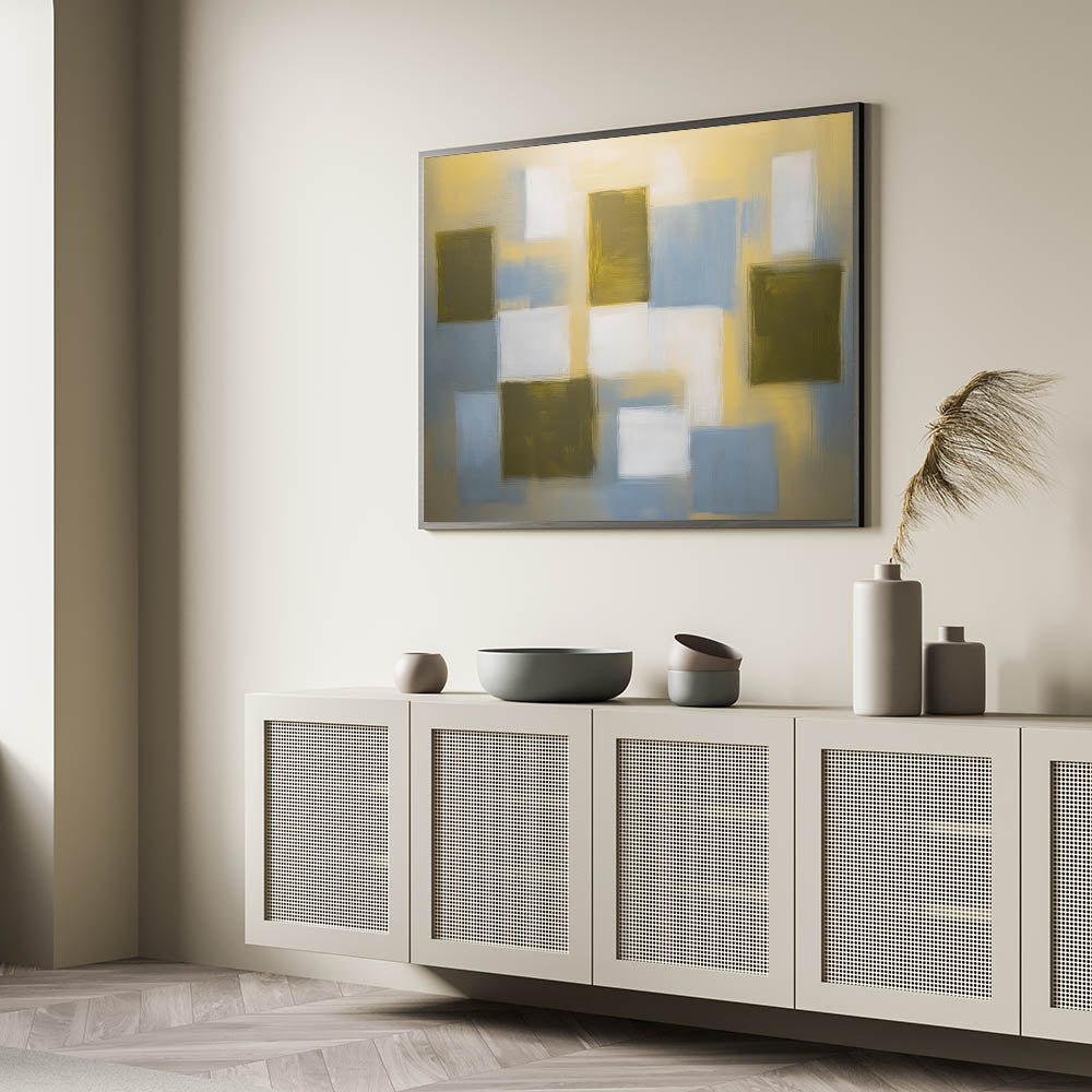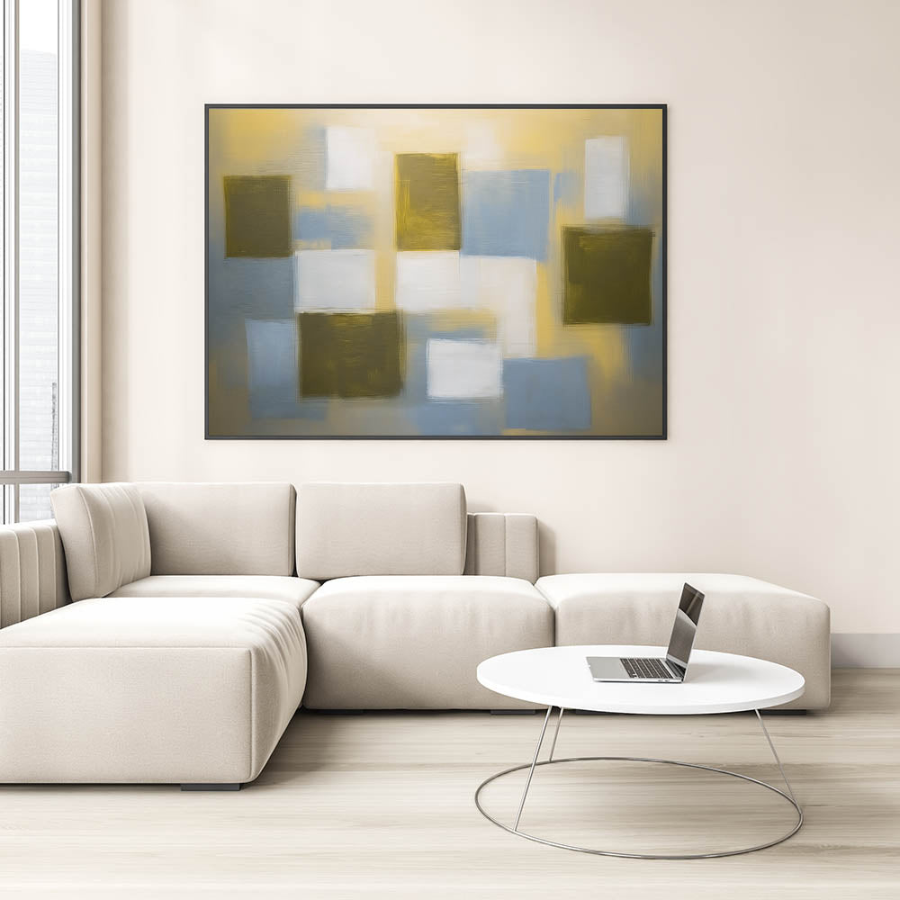 Elevate your space with this Abstract Geometric Living Room Wall Art, a sophisticated blend of modern wall art and contemporary art prints. Featuring an artistic arrangement of soft blue, muted gold, and white squares, this canvas wall art introduces balance and depth to any modern living room decor.