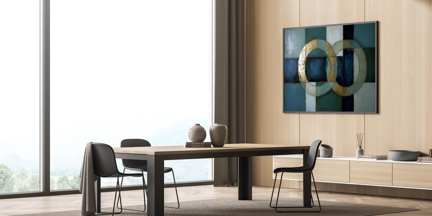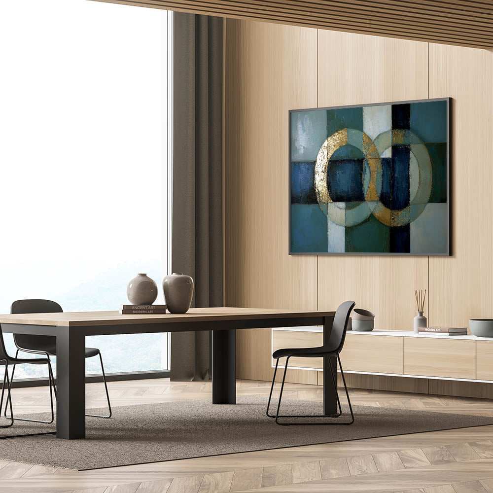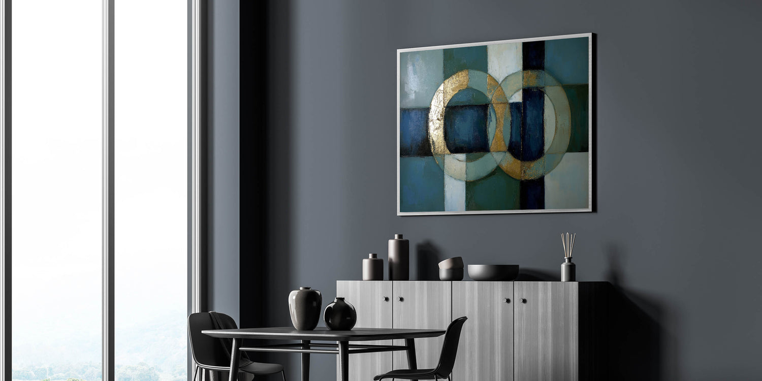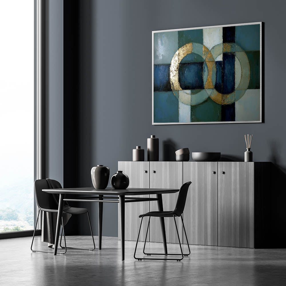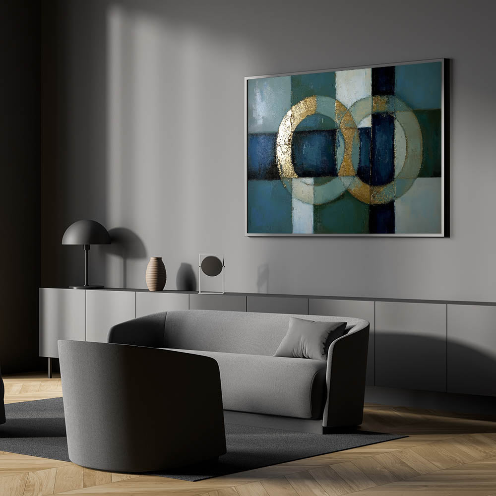 Enhance your home with this modern geometric abstract wall art, featuring interlocking gold-accented rings against a deep blue and teal background. The striking contrast of muted gold, navy blue, and soft white creates a luxurious and sophisticated look, making this artwork ideal for wall art for living rooms, offices, or contemporary interiors. Available in canvas wall art, framed wall art, and acrylic glass, this piece seamlessly complements both minimalist and high-end décor.