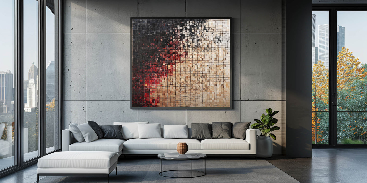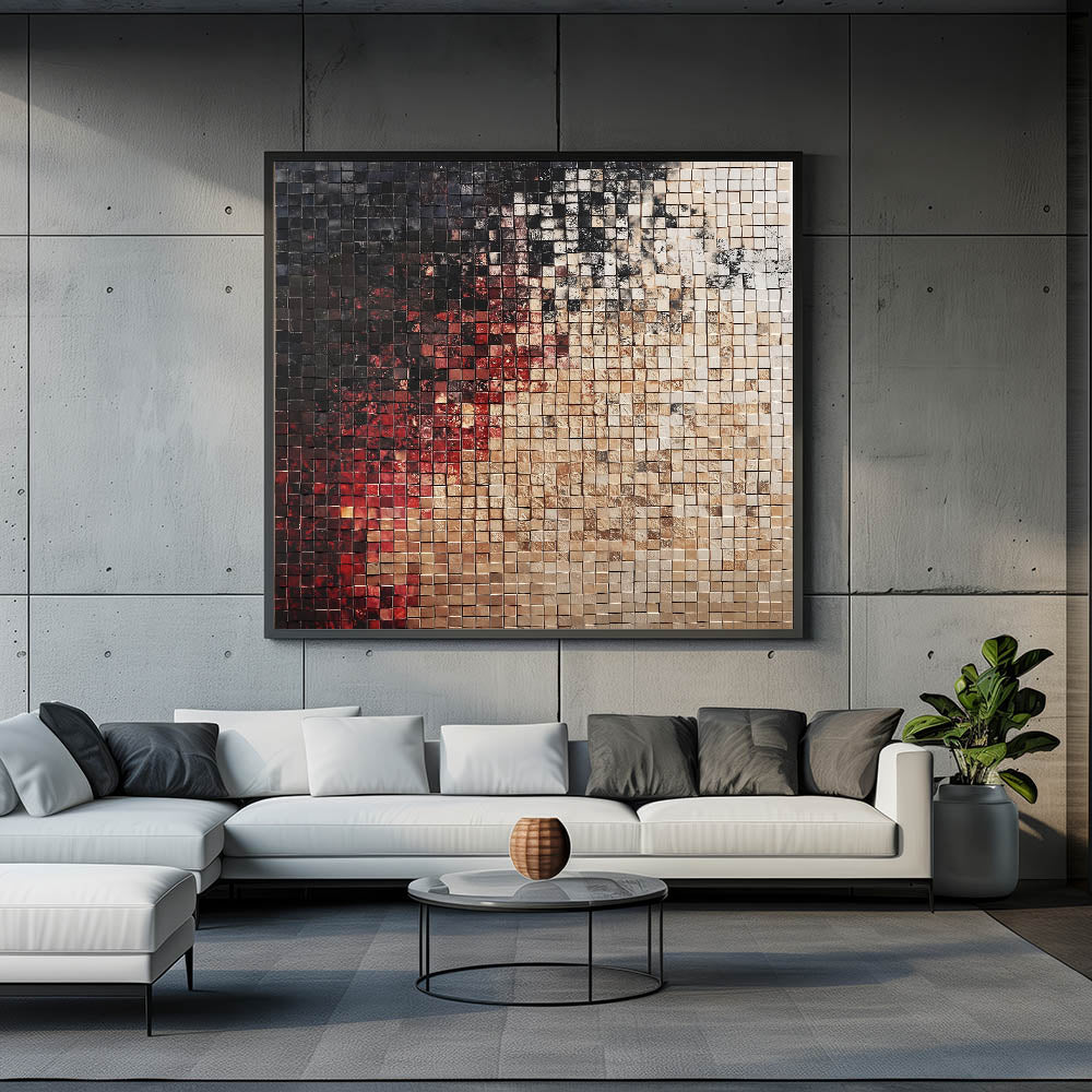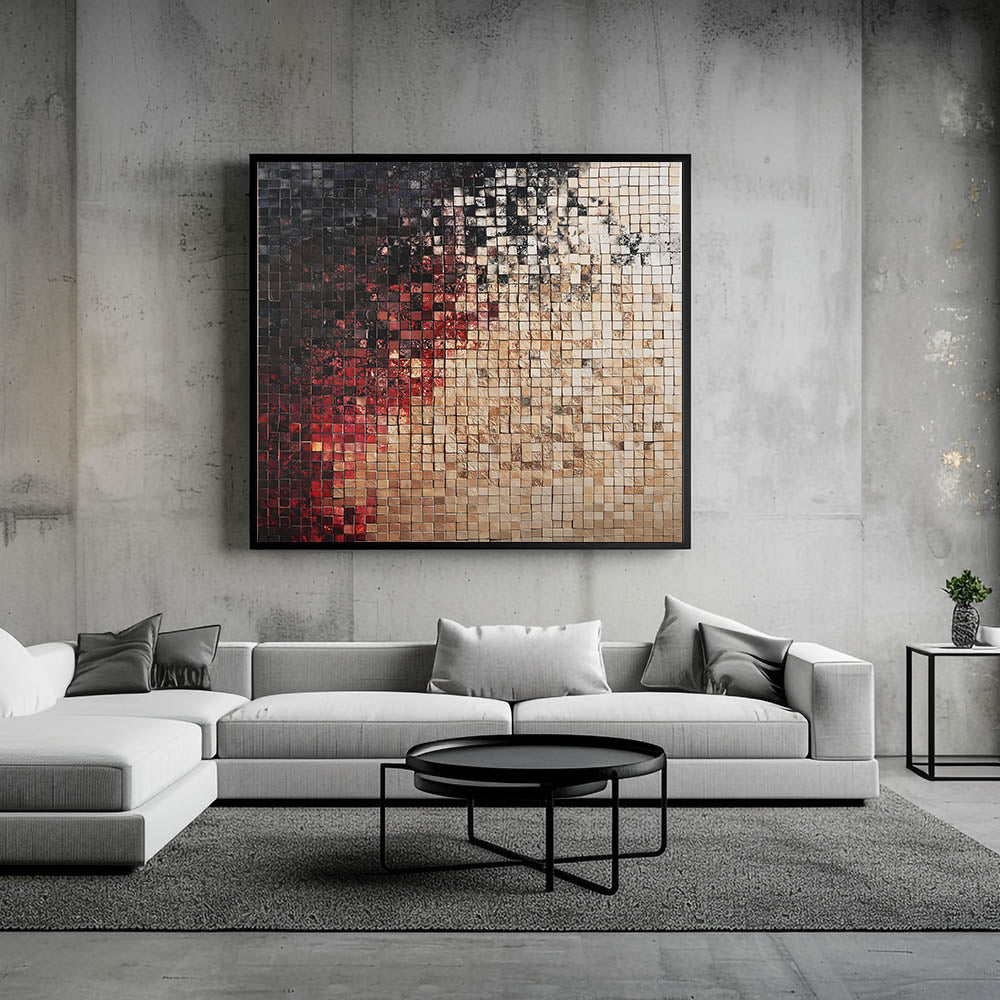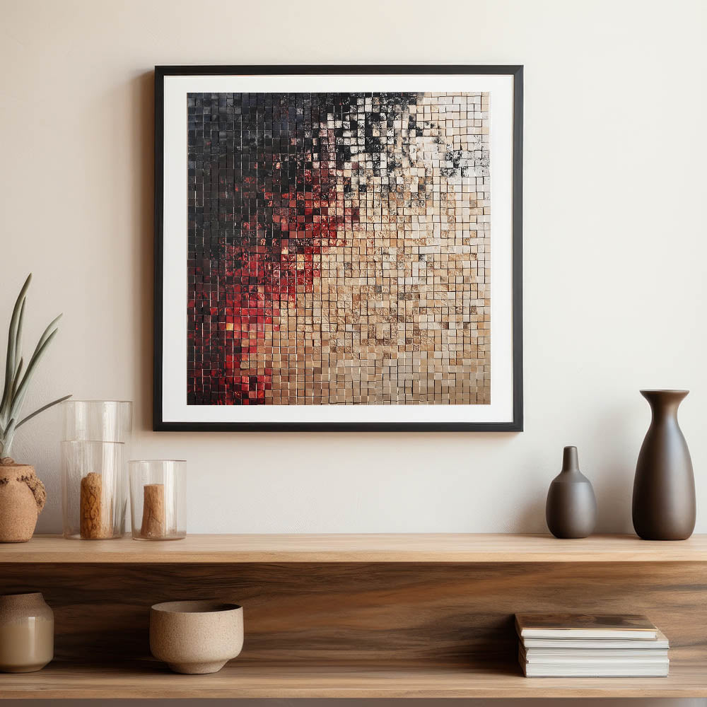 Bring depth and sophistication to your home with this abstract mosaic wall art, an ideal piece for modern living room decor. Featuring a bold interplay of black, red, and beige tones, this artwork adds warmth and visual interest to any space. The pixelated design creates a contemporary, textured effect, making it a striking framed wall art or large canvas art centerpiece.