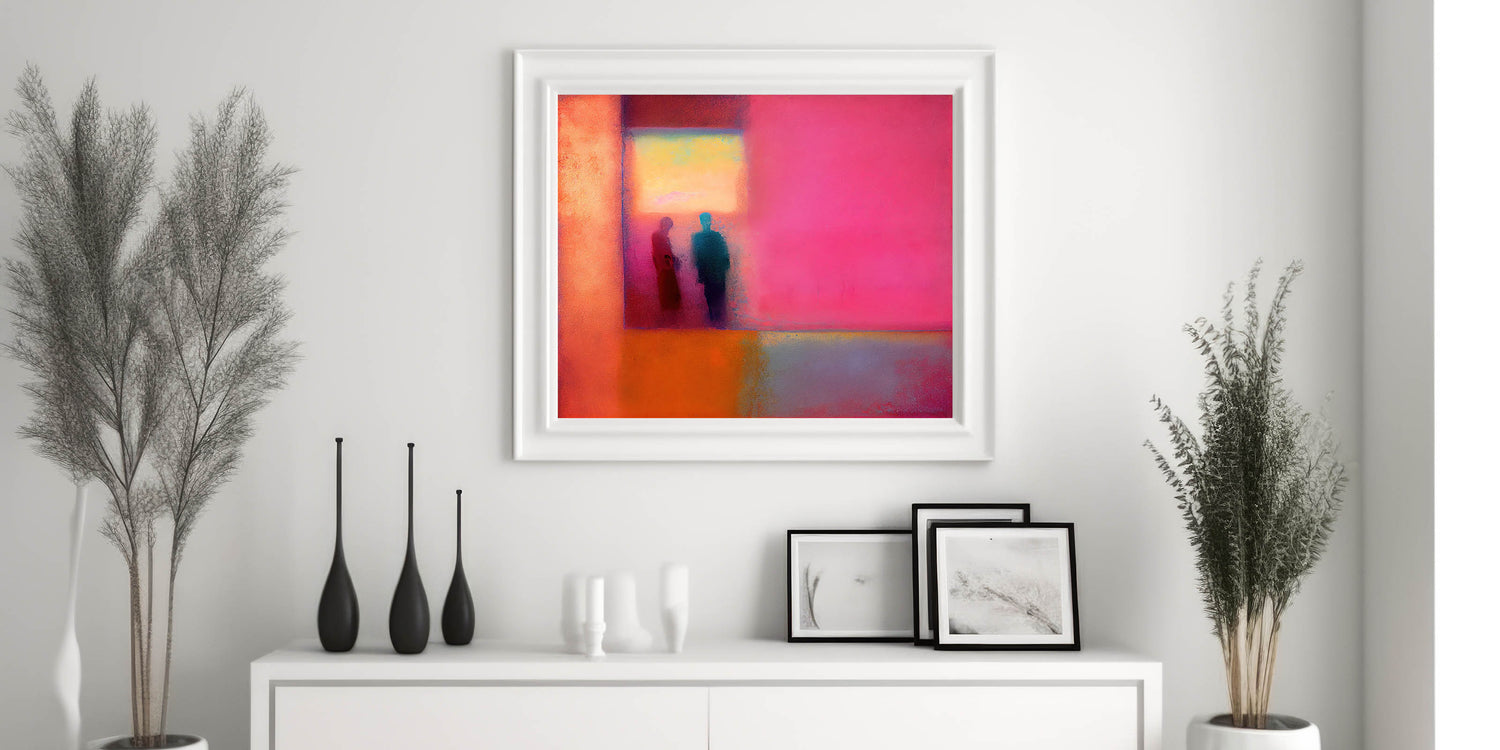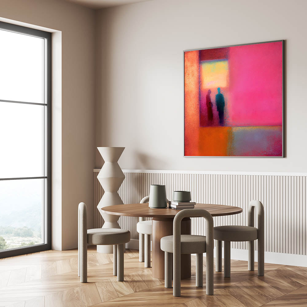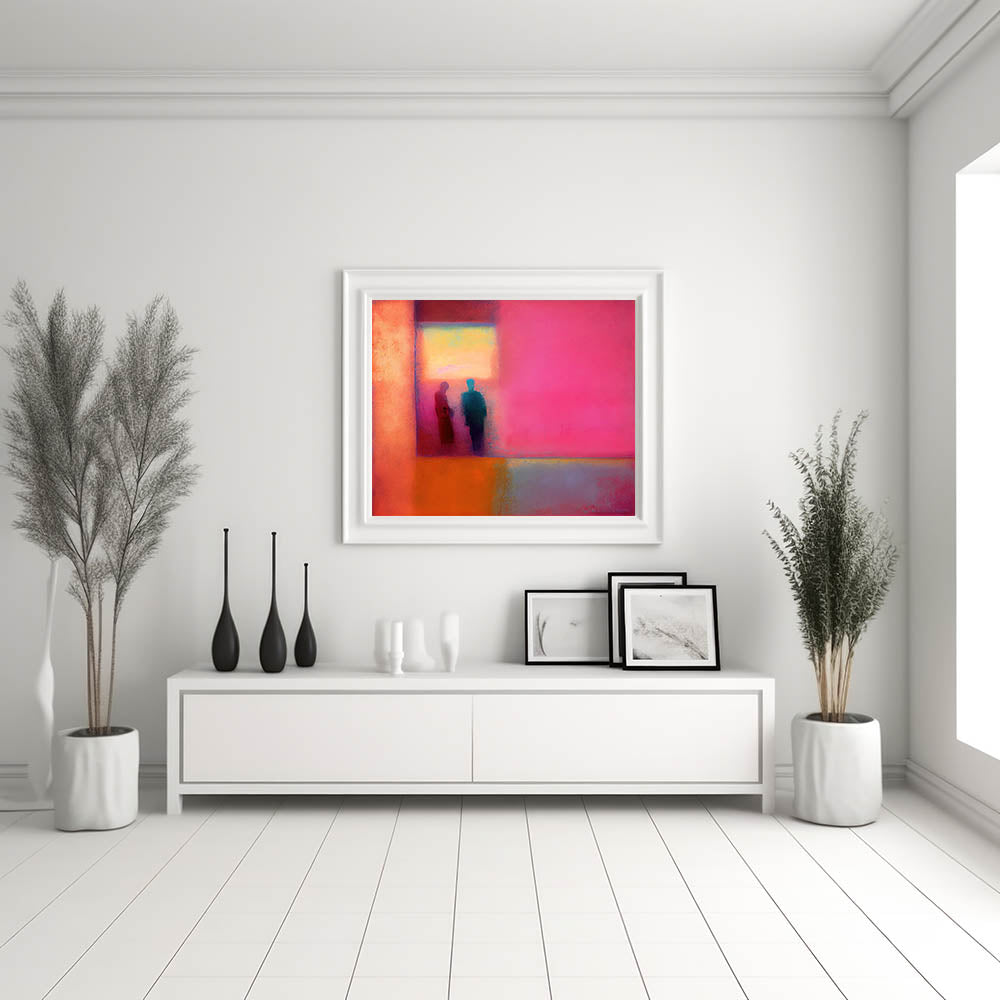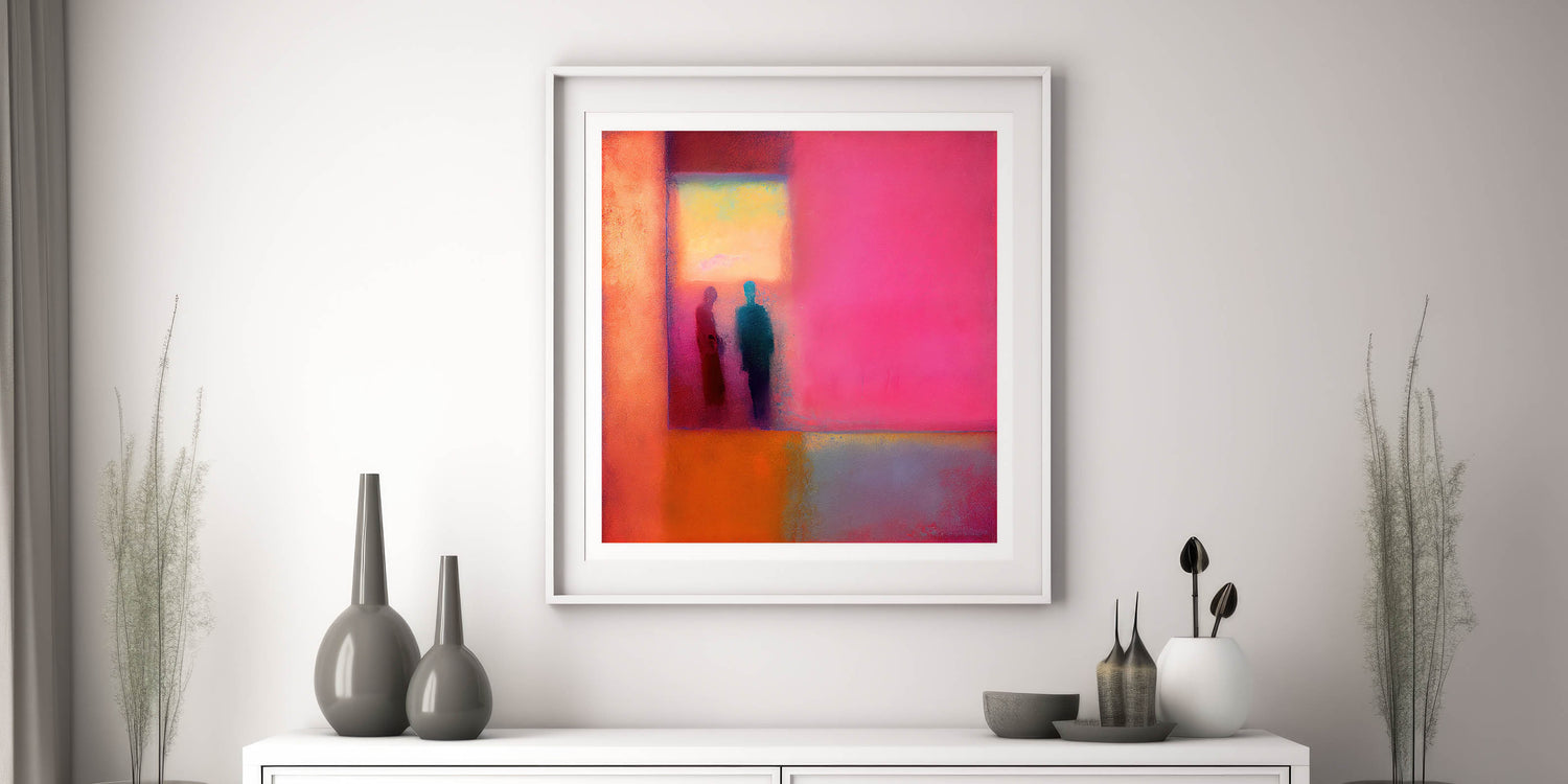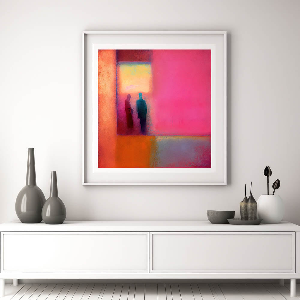 Infuse your space with the expressive energy of this abstract figurative wall art, featuring two silhouetted figures surrounded by vibrant pink, orange, and yellow hues. The dreamy composition and soft blending of colors create a sense of mystery and connection, making it an eye-catching piece for wall art for living rooms, offices, or artistic interiors. Available in canvas wall art, framed wall art, and acrylic glass, this modern wall art seamlessly enhances contemporary décor styles.