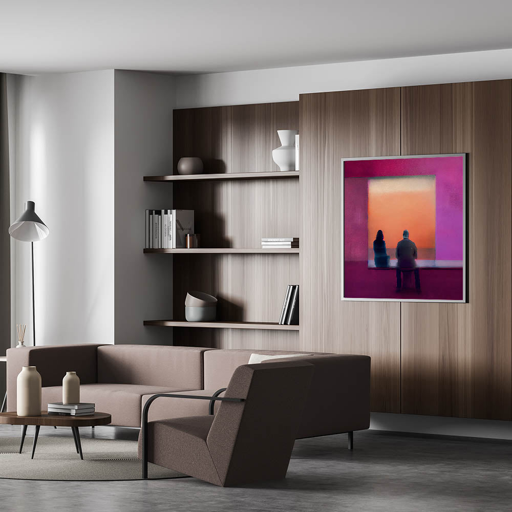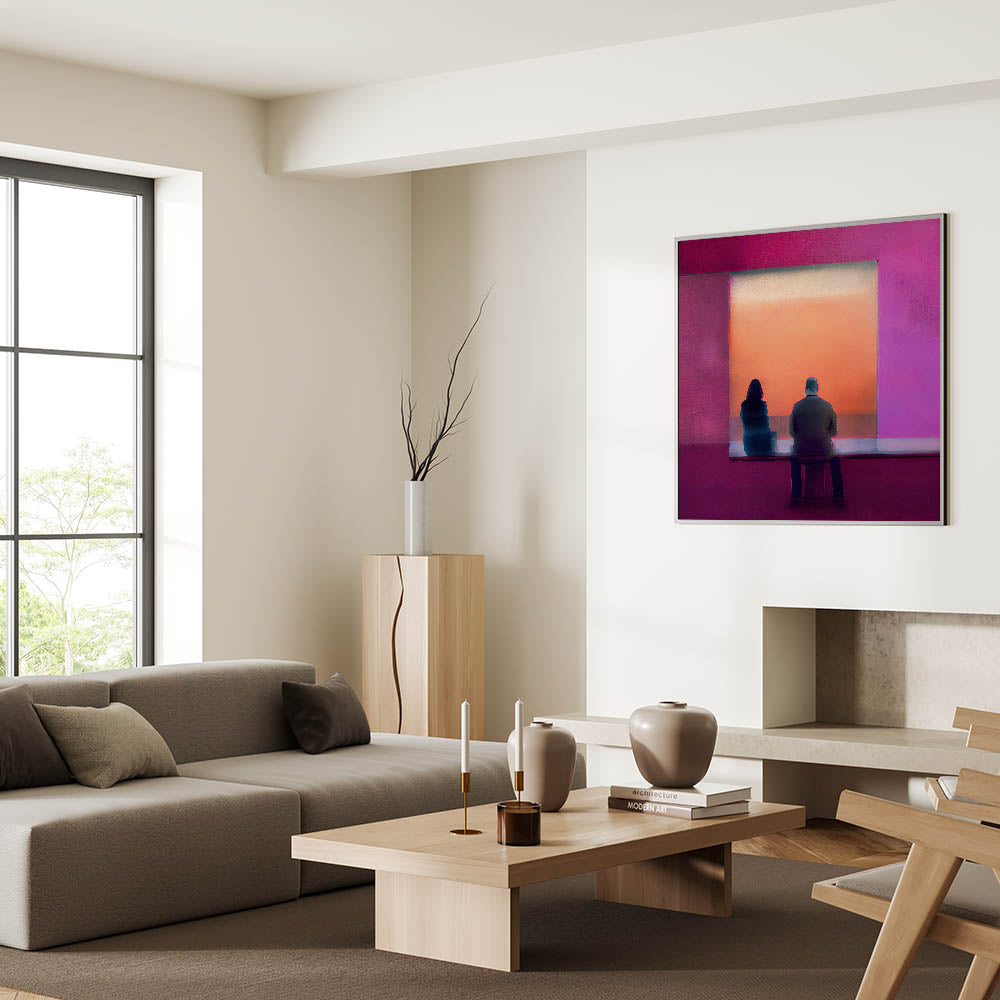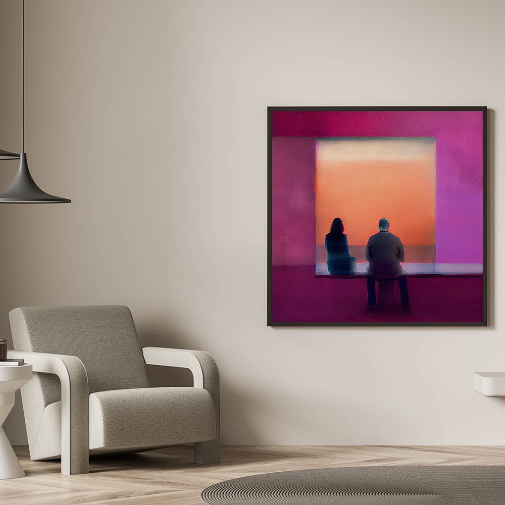 Create a thought-provoking and visually striking ambiance with this modern abstract figurative wall art. Featuring two silhouetted figures sitting before a radiant sunset-like glow, this contemporary wall art blends deep magenta, violet, and warm orange hues, evoking a sense of mystery and introspection. The contrast between bold colors and soft transitions makes this a compelling statement piece for wall art for living rooms, offices, or stylish interiors. Available in canvas wall art, framed wall art, and acrylic glass, this unique design complements modern and expressive décor styles.