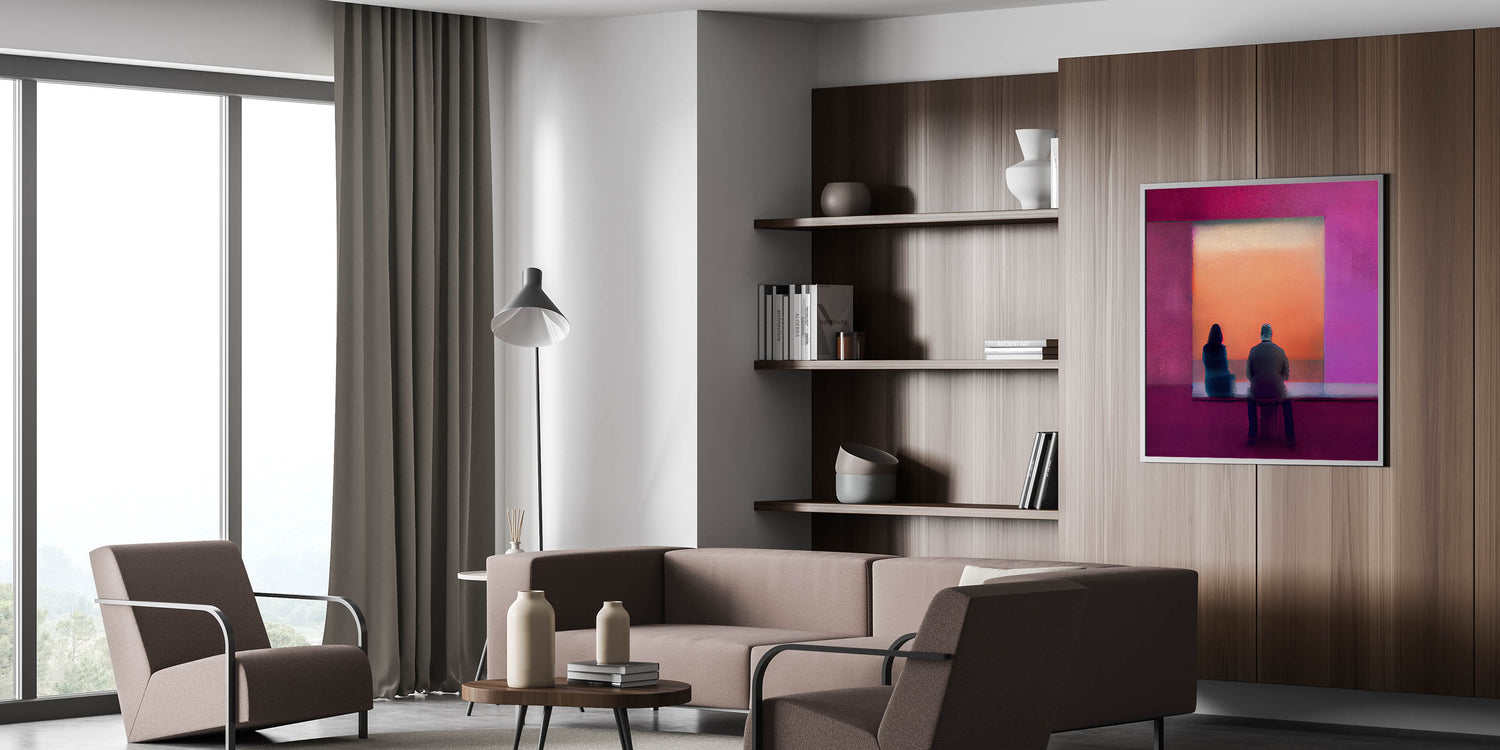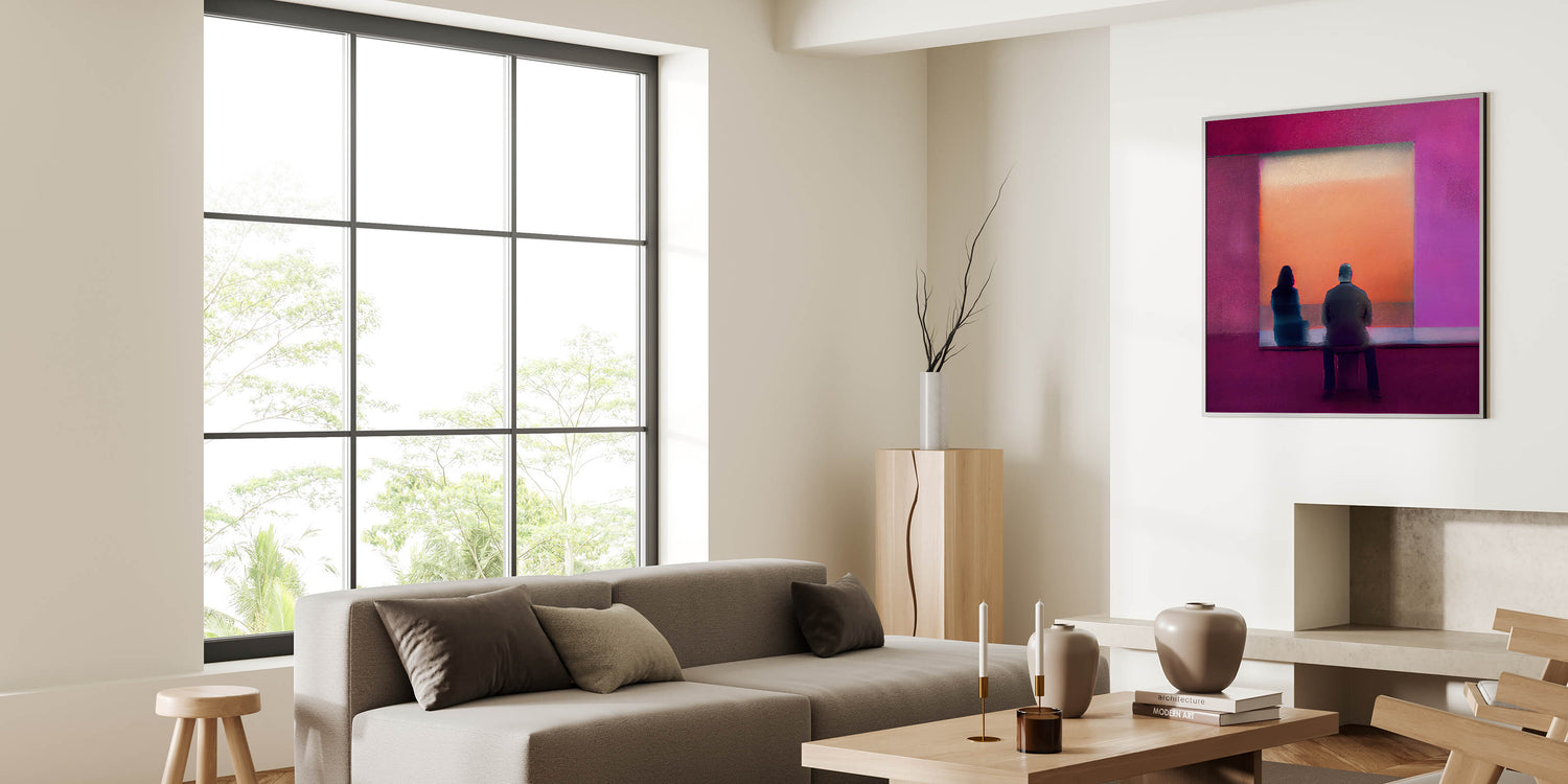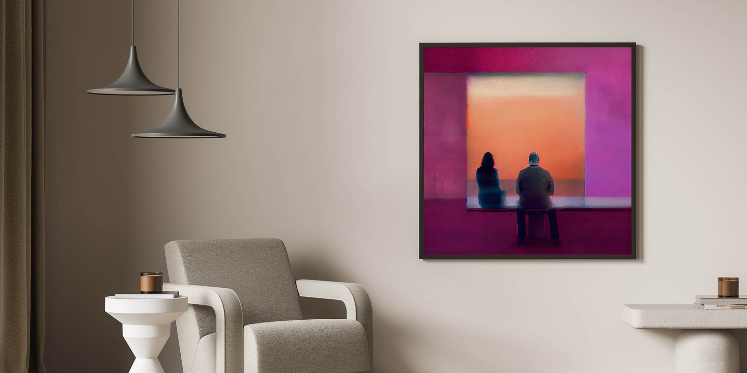Create a thought-provoking and visually striking ambiance with this modern abstract figurative wall art. Featuring two silhouetted figures sitting before a radiant sunset-like glow, this contemporary wall art blends deep magenta, violet, and warm orange hues, evoking a sense of mystery and introspection. The contrast between bold colors and soft transitions makes this a compelling statement piece for wall art for living rooms, offices, or stylish interiors. Available in canvas wall art, framed wall art, and acrylic glass, this unique design complements modern and expressive décor styles.
