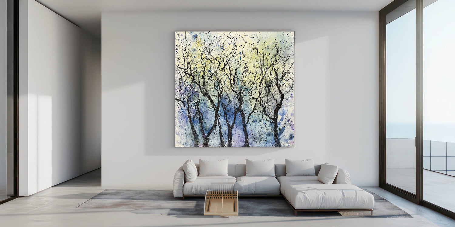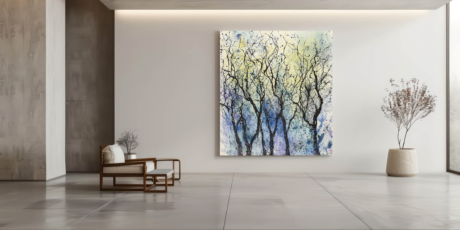 Add an artistic and serene touch to your home with this modern wall art, featuring a stunning abstract depiction of trees in a dreamy blue and yellow background. The delicate black branches contrast beautifully with the soft watercolor effect, making this wall art for the living room a perfect addition to any contemporary or minimalist space. This abstract wall art is designed to evoke a sense of tranquility and artistic expression.