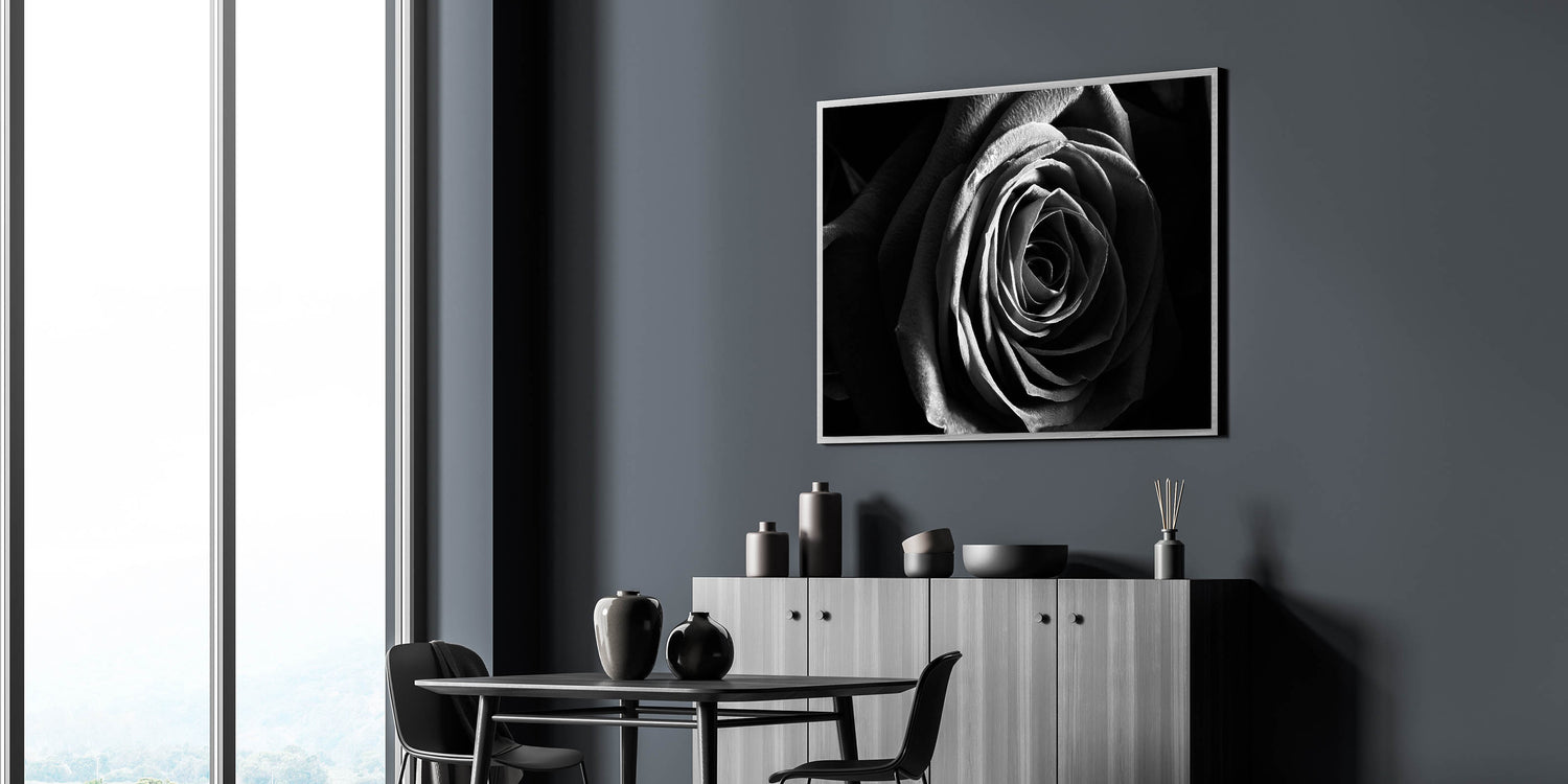 Elevate your space with this striking black-and-white rose wall art, capturing the delicate beauty of a rose in breathtaking detail. The dramatic contrast and intricate petal textures create a timeless and sophisticated aesthetic, making this modern wall art a perfect choice for contemporary interiors. Ideal for those who love minimalist, bold, and elegant décor, this canvas art print blends seamlessly with modern, industrial, and monochrome design themes.