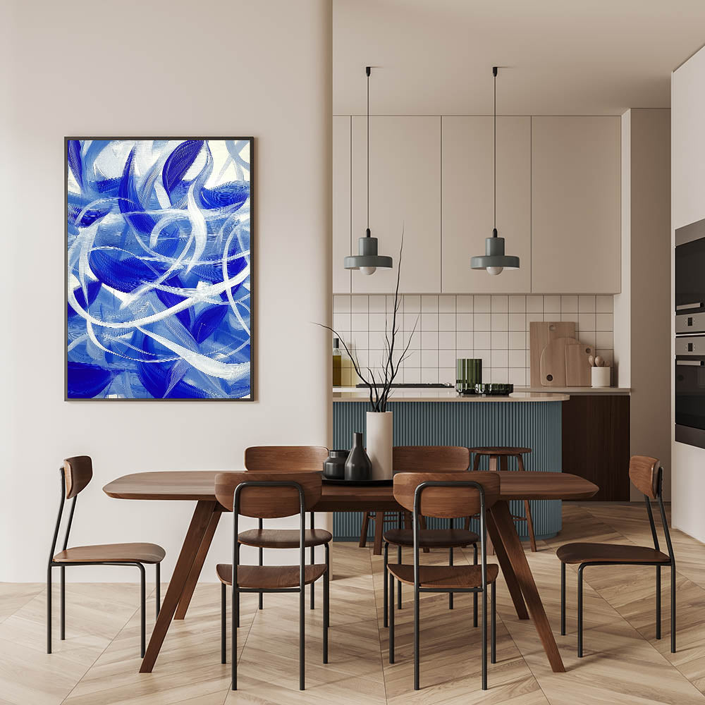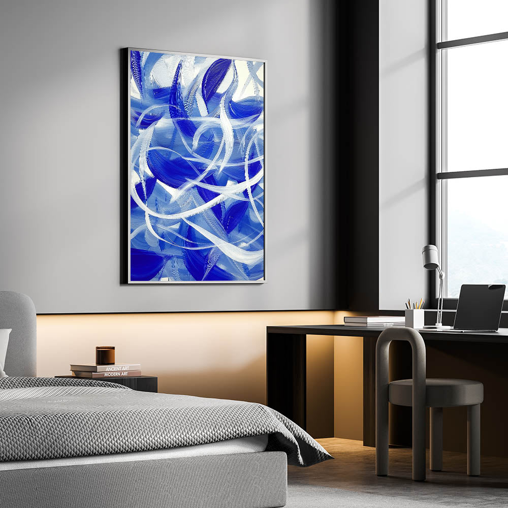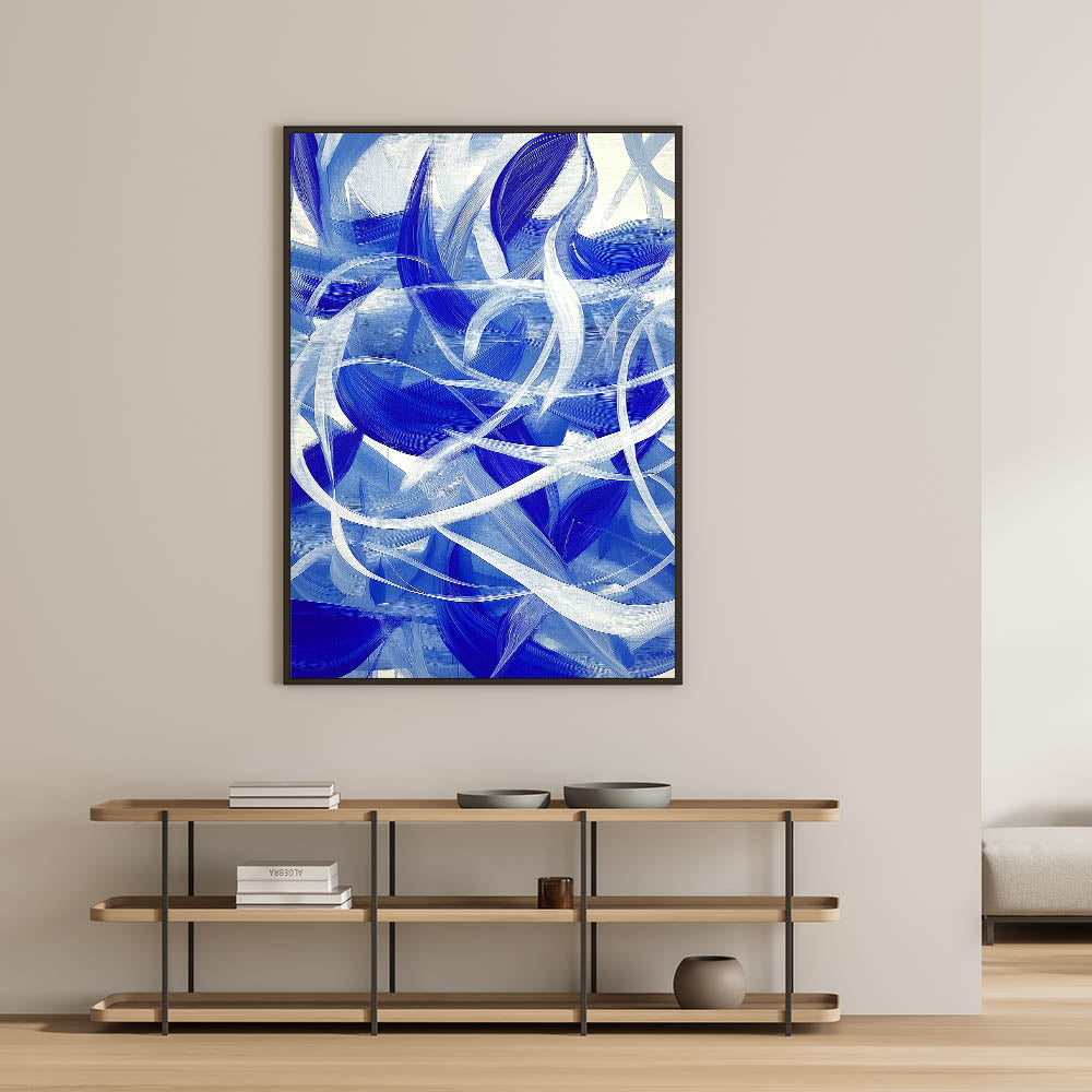 Bring energy and movement to your space with this Blue Abstract Living Room Wall Art. Featuring fluid, sweeping brushstrokes in deep blue and crisp white, this modern wall art evokes a sense of motion and depth, making it a bold statement piece for modern living room decor. The dynamic interplay of shades creates a visually captivating effect, perfect for contemporary interiors.