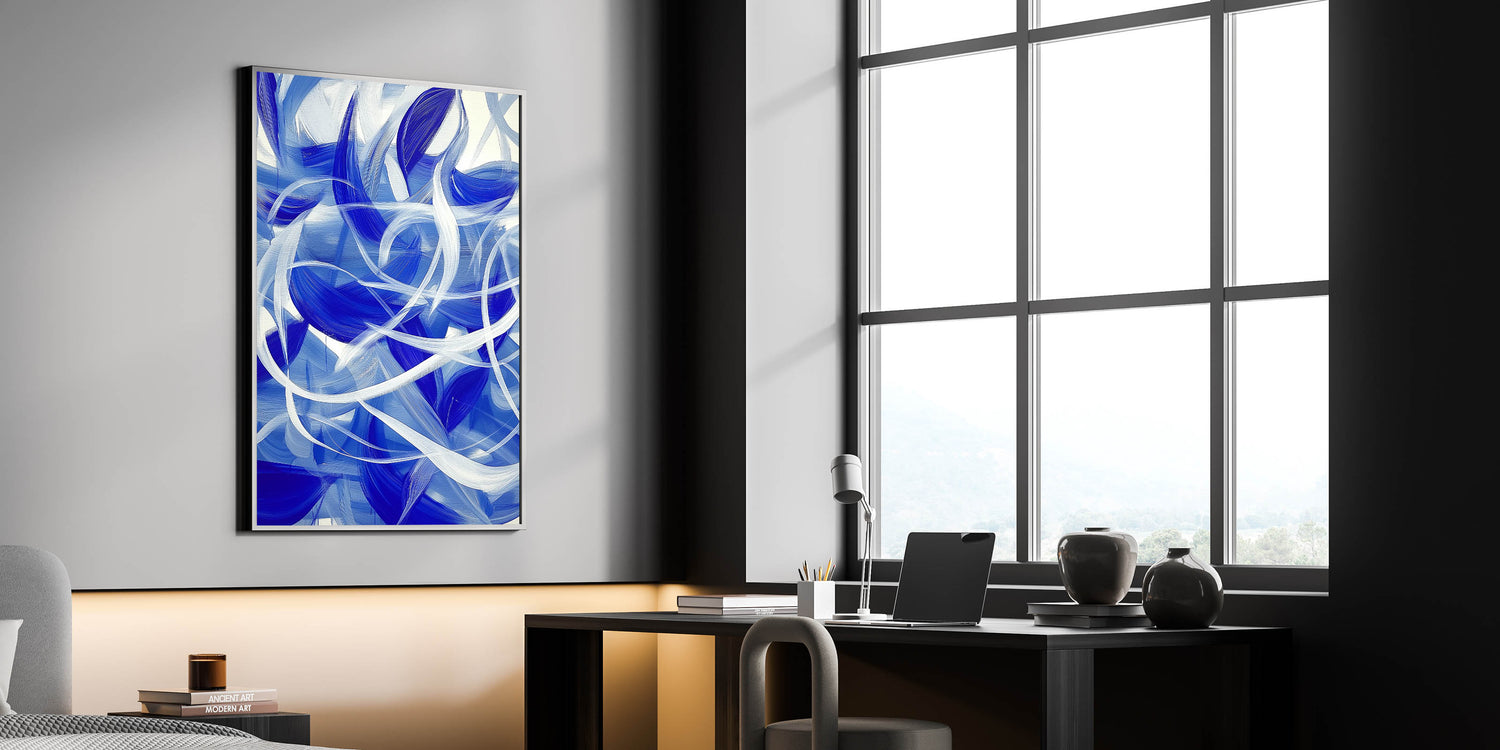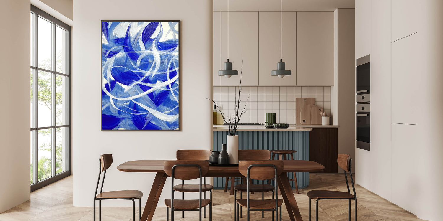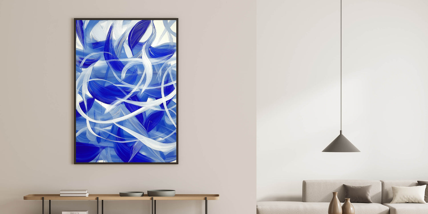Bring energy and movement to your space with this Blue Abstract Living Room Wall Art. Featuring fluid, sweeping brushstrokes in deep blue and crisp white, this modern wall art evokes a sense of motion and depth, making it a bold statement piece for modern living room decor. The dynamic interplay of shades creates a visually captivating effect, perfect for contemporary interiors.