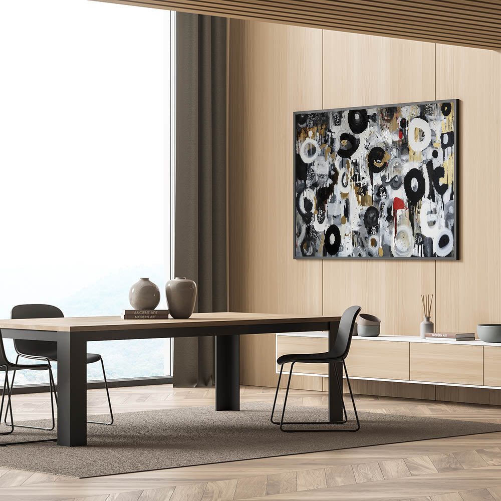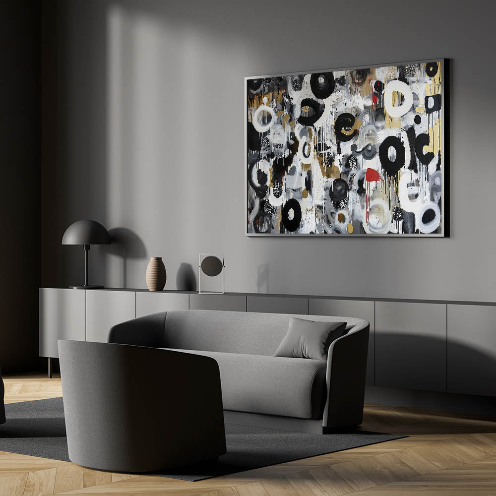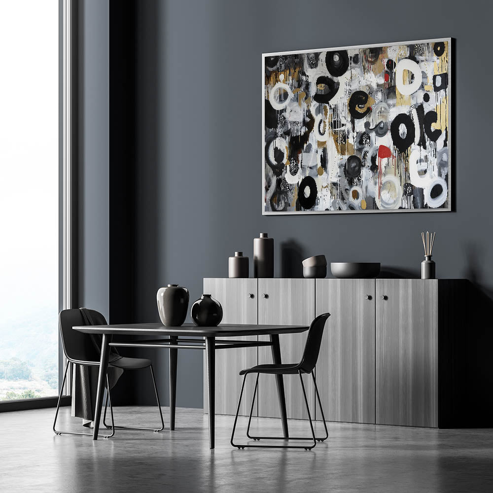 Make a bold statement with this living room wall art, featuring a striking black, white, gold, and red abstract composition. The dynamic brushstrokes, intricate patterns, and fluid textures bring movement and energy to this modern wall art, making it a perfect choice for modern living room decor. Whether you're decorating a contemporary space or adding an artistic touch, this canvas wall art serves as a visually compelling centerpiece.