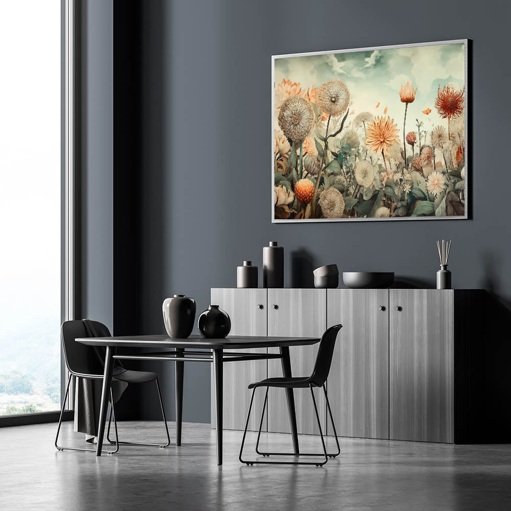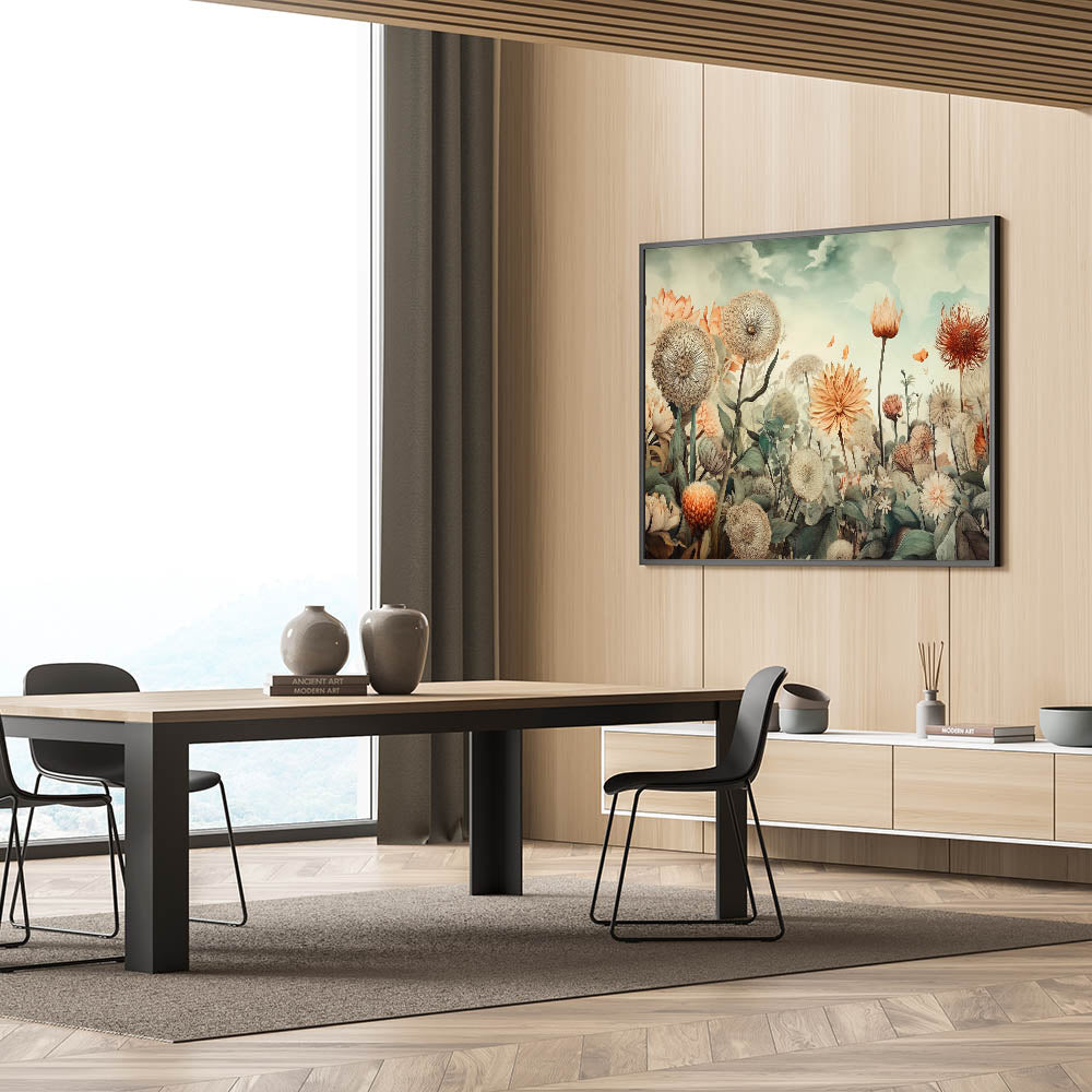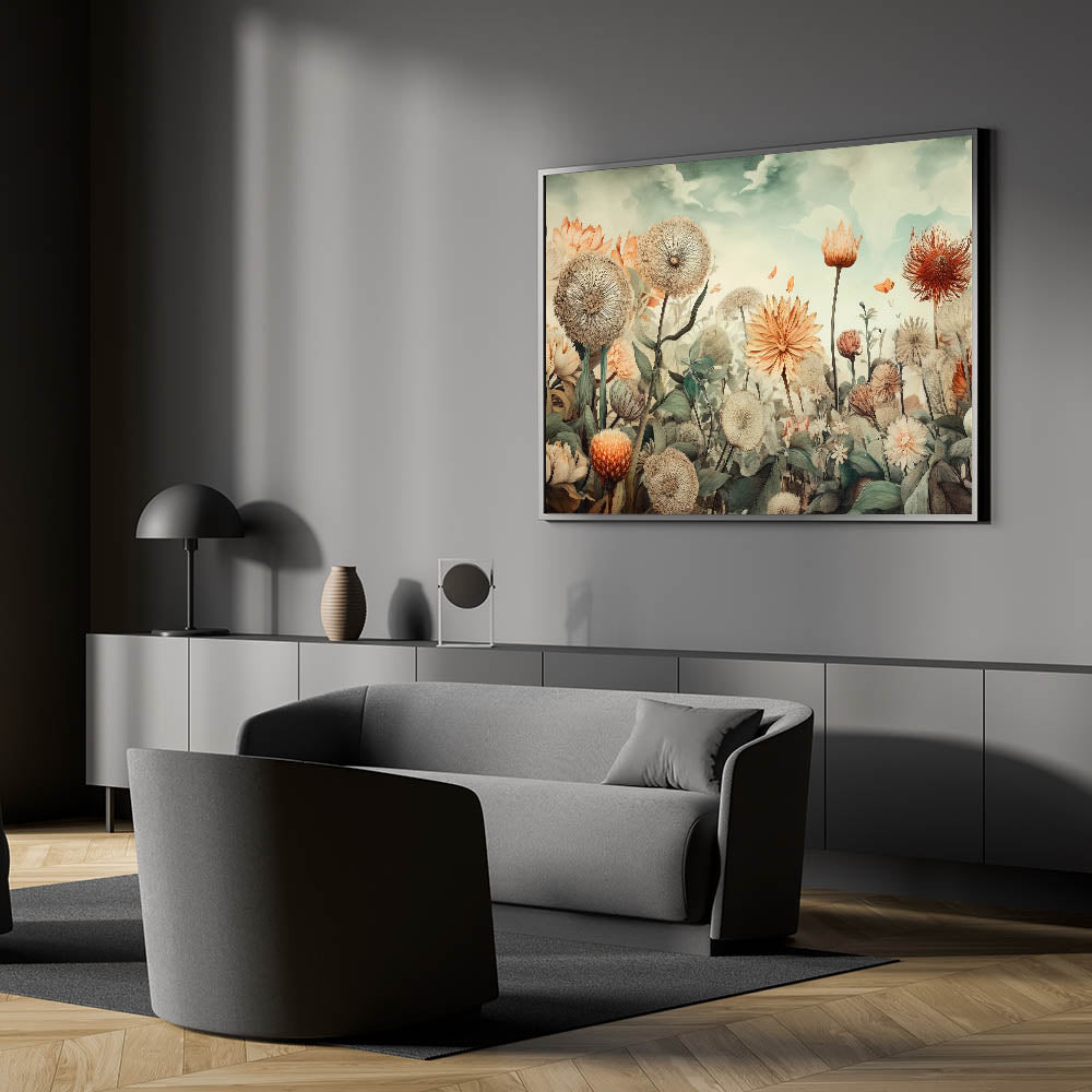 Bring the beauty of nature into your home with this exquisite wall art for living room, featuring a dreamy floral landscape. Soft beige, peach, and muted greens blend harmoniously to create a tranquil, nature-inspired composition. This modern living room decor piece showcases delicate dandelions, blooming flowers, and fluttering butterflies, offering a sense of serenity and elegance.