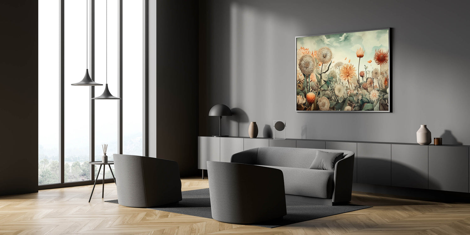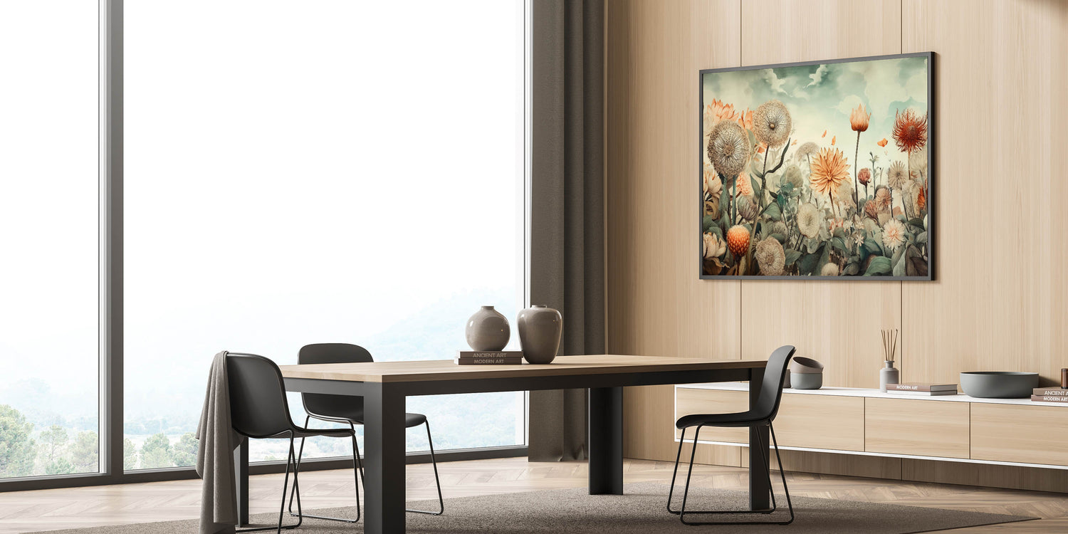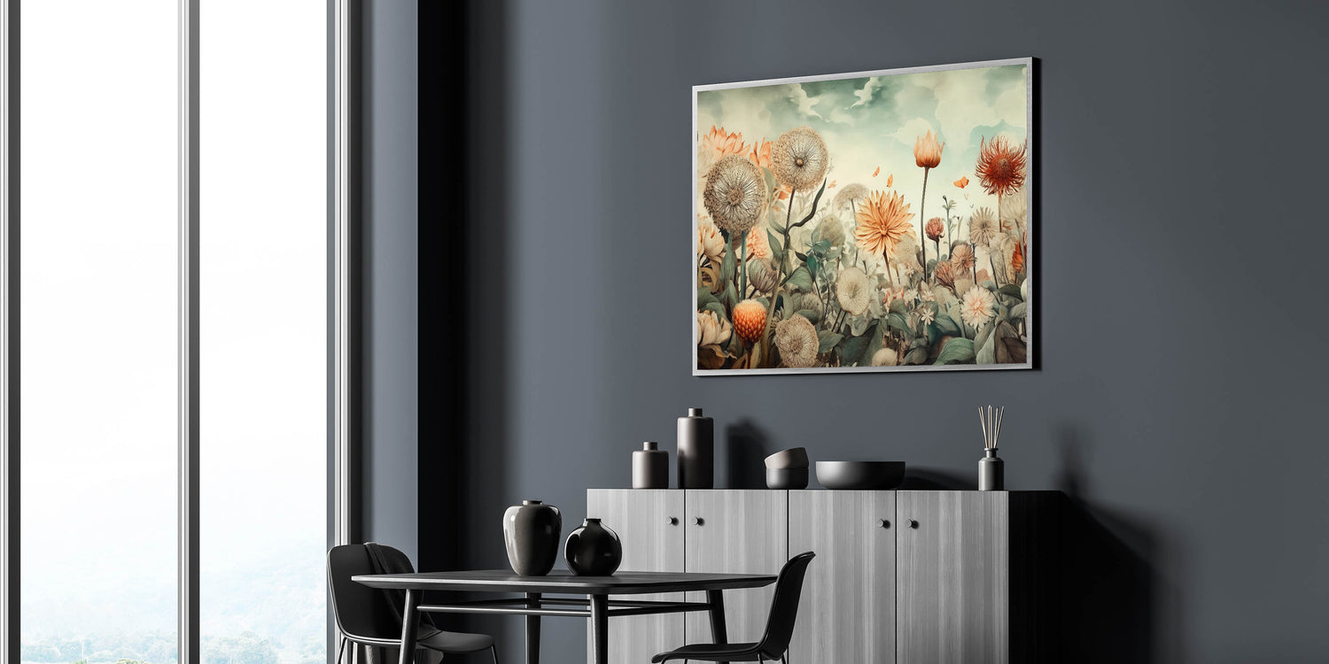 Bring the beauty of nature into your home with this exquisite wall art for living room, featuring a dreamy floral landscape. Soft beige, peach, and muted greens blend harmoniously to create a tranquil, nature-inspired composition. This modern living room decor piece showcases delicate dandelions, blooming flowers, and fluttering butterflies, offering a sense of serenity and elegance.