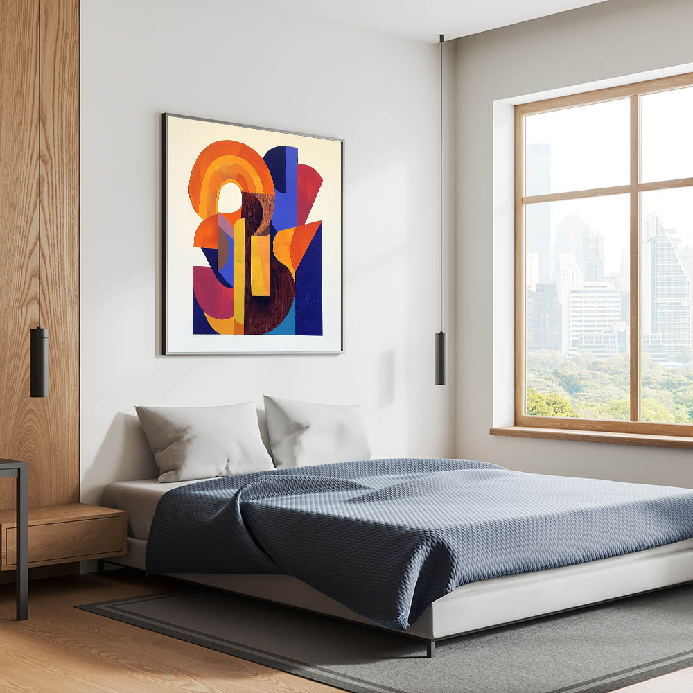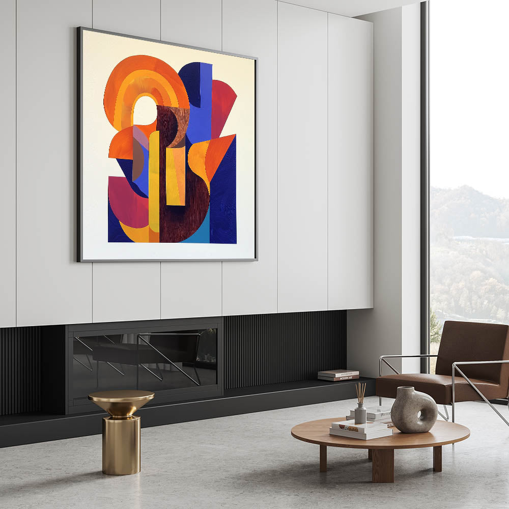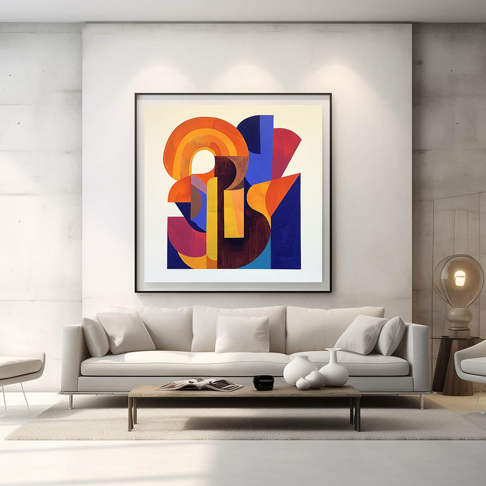 Add a bold and dynamic touch to your space with this stunning geometric abstract wall art, featuring a striking composition of orange, yellow, deep blue, and red. This modern wall art brings energy and creativity, making it an ideal wall art for living rooms, offices, or contemporary interiors. The overlapping geometric shapes and vibrant color palette create a sense of movement and depth, making this piece a captivating focal point in any room.