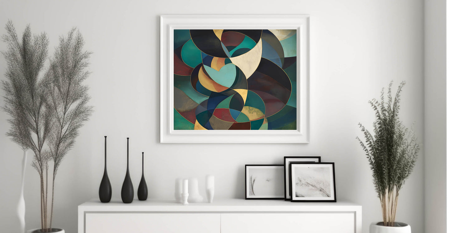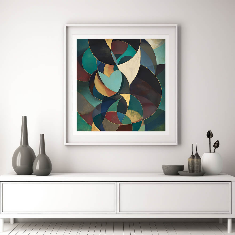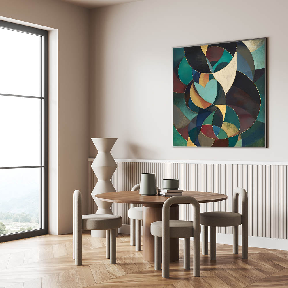 Infuse energy and elegance into your space with this Colorful Geometric Living Room Wall Art. Featuring an intricate interplay of overlapping shapes in deep teal, navy blue, burgundy, and gold, this modern wall art is a stunning example of abstract art pieces. The combination of bold hues and fine gold detailing makes this a captivating addition to any modern living room decor.