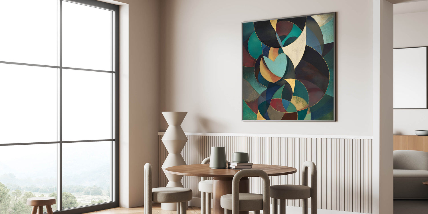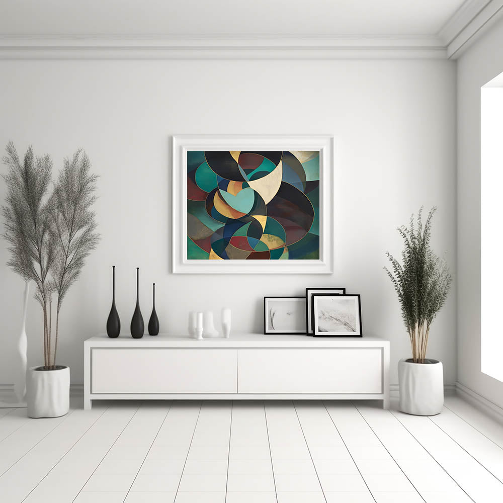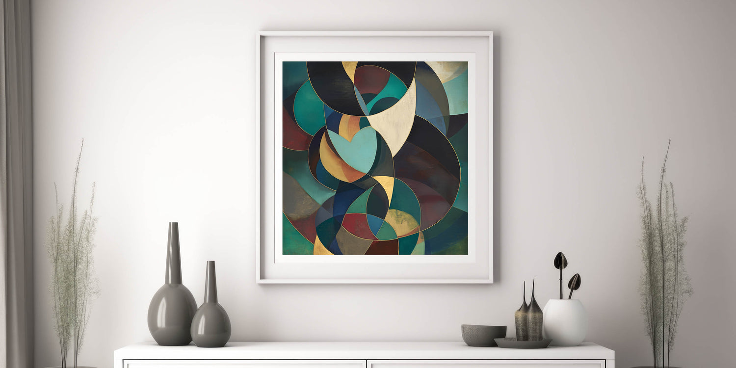 Infuse energy and elegance into your space with this Colorful Geometric Living Room Wall Art. Featuring an intricate interplay of overlapping shapes in deep teal, navy blue, burgundy, and gold, this modern wall art is a stunning example of abstract art pieces. The combination of bold hues and fine gold detailing makes this a captivating addition to any modern living room decor.