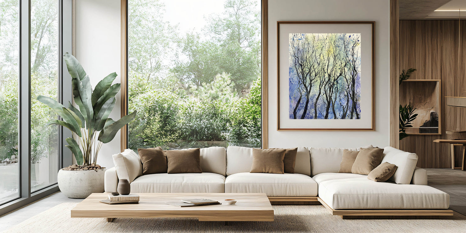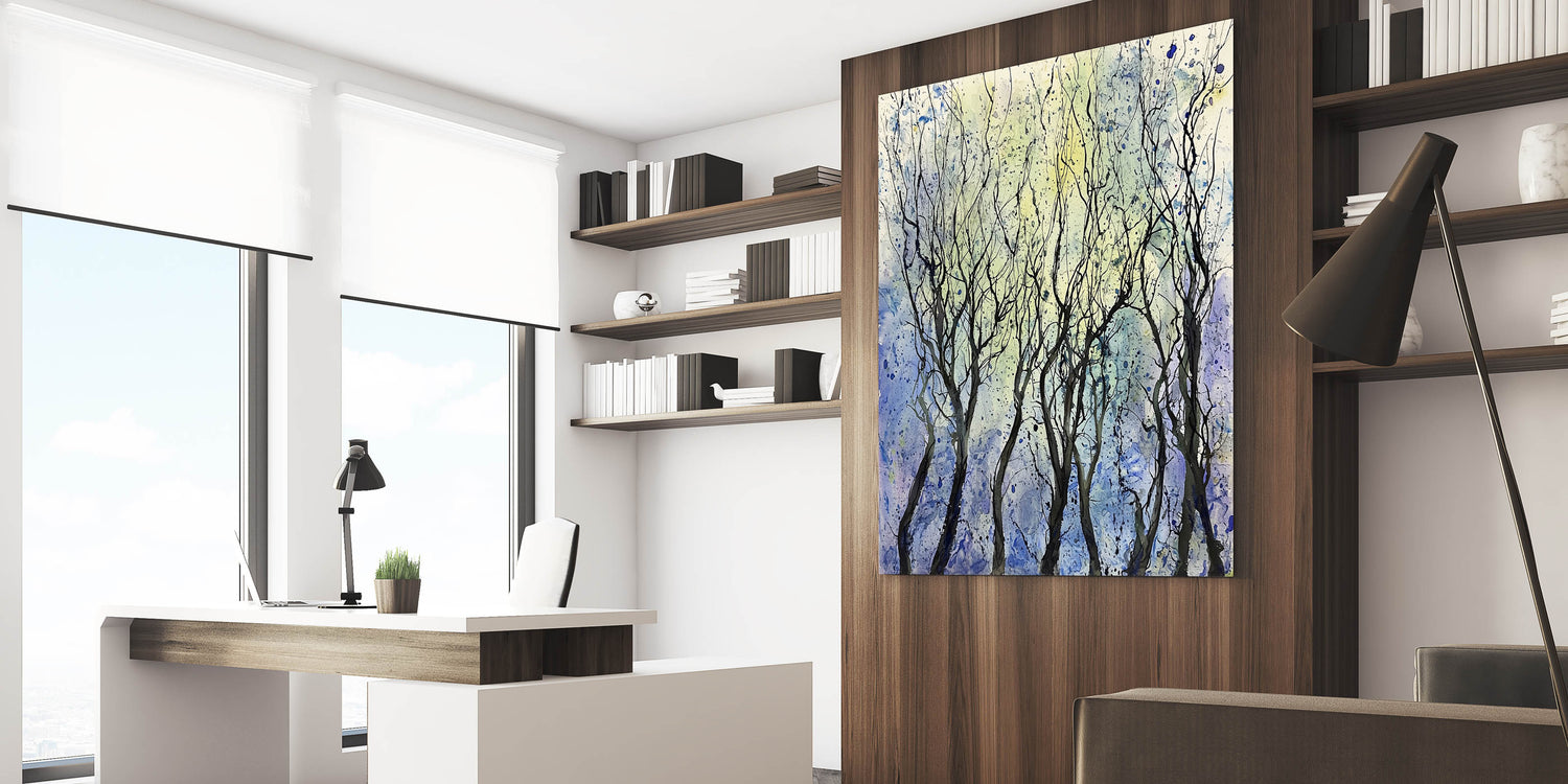 Enhance your space with this contemporary wall art, featuring an abstract portrayal of delicate trees set against a soft blue and yellow gradient. The expressive black branches blend seamlessly with the watercolor-inspired background, making this wall art for the living room a stunning addition to modern, minimalist, or nature-inspired interiors. The balance of light and dark hues creates a captivating sense of movement and depth.
