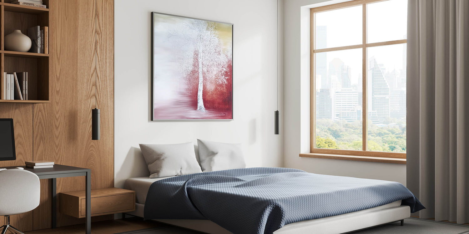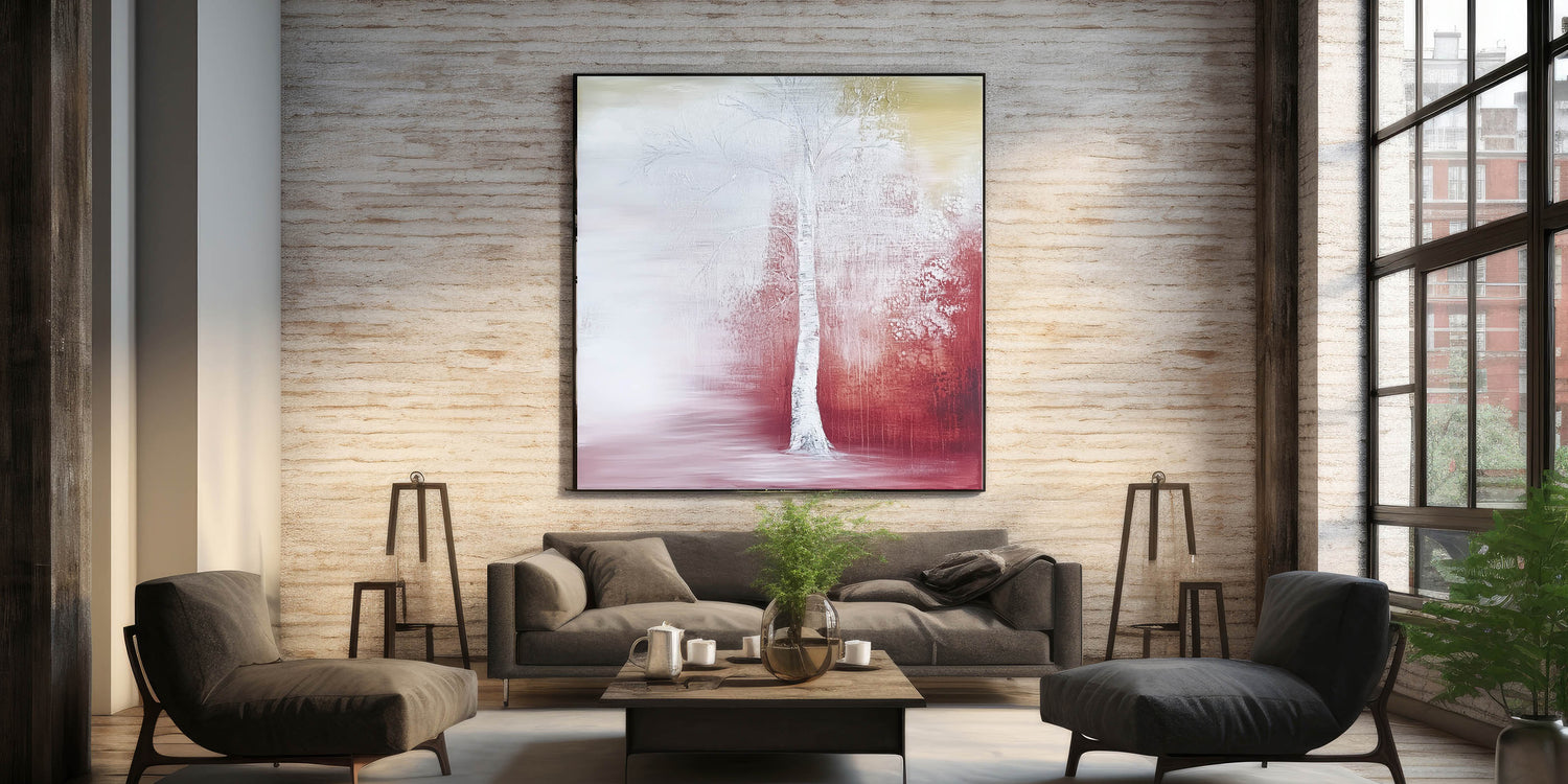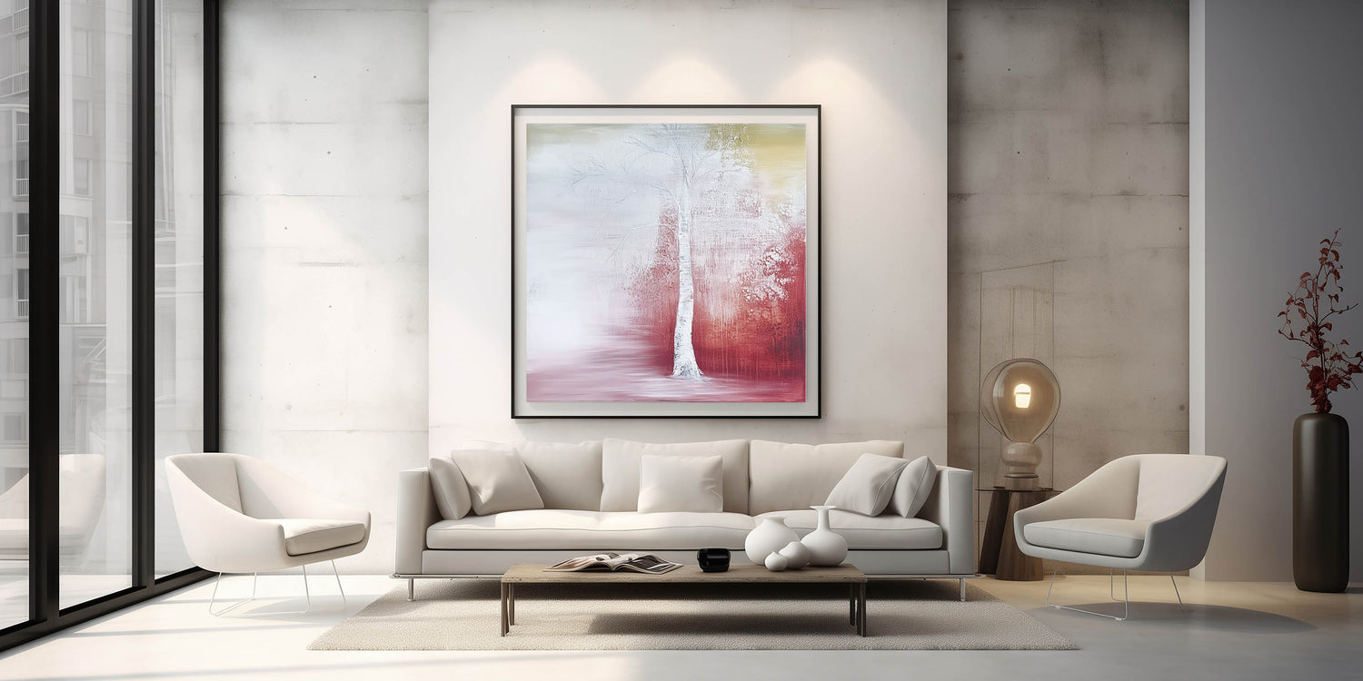 Enhance your space with this contemporary living room art, featuring an elegant white tree set against a dreamy blend of soft gold, warm burgundy, and gentle white tones. The smooth transitions and delicate textures give this modern wall art a serene and sophisticated aesthetic. Perfect as wall art for the living room, this piece captures nature's beauty in a minimal yet expressive style.