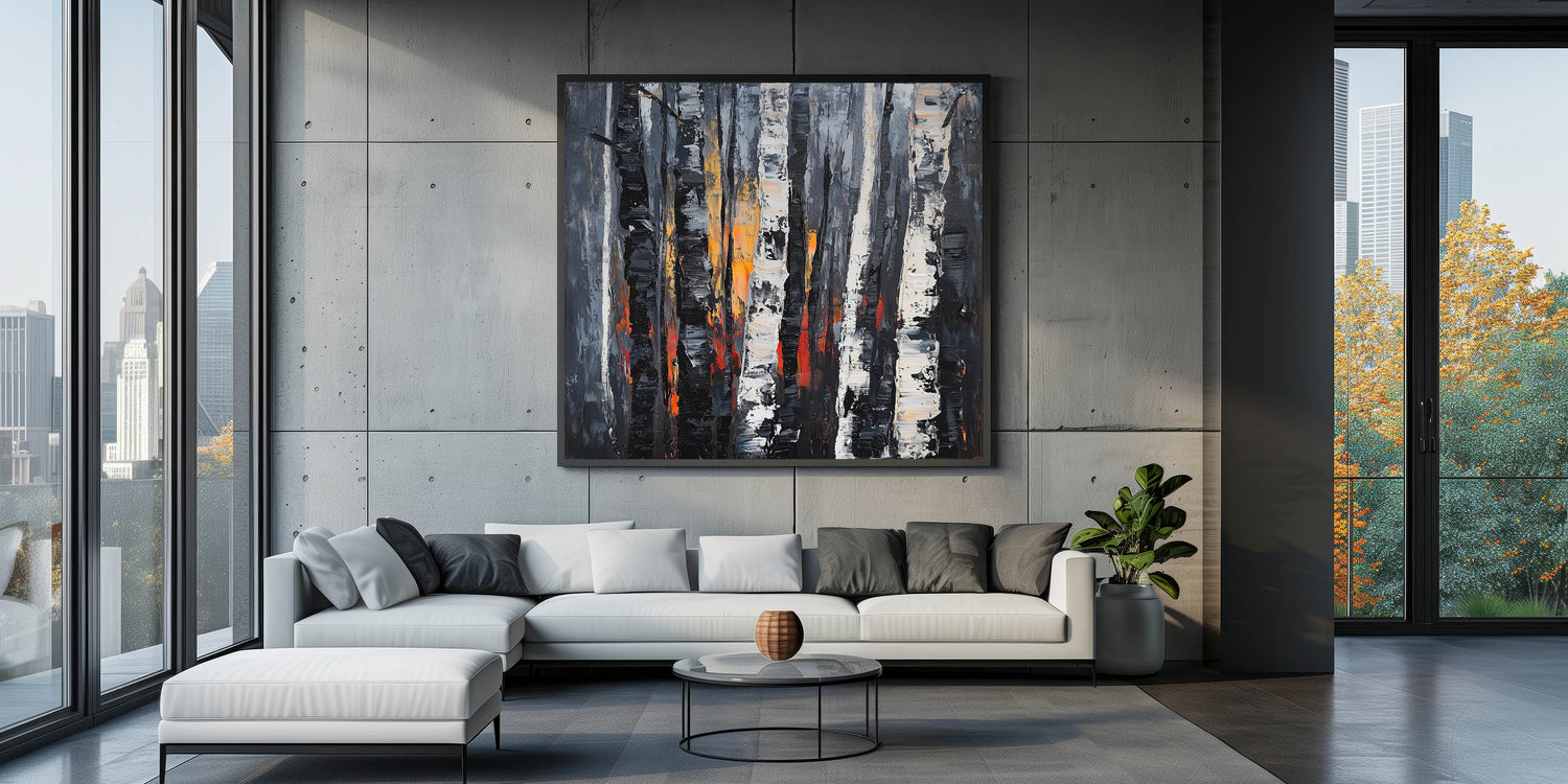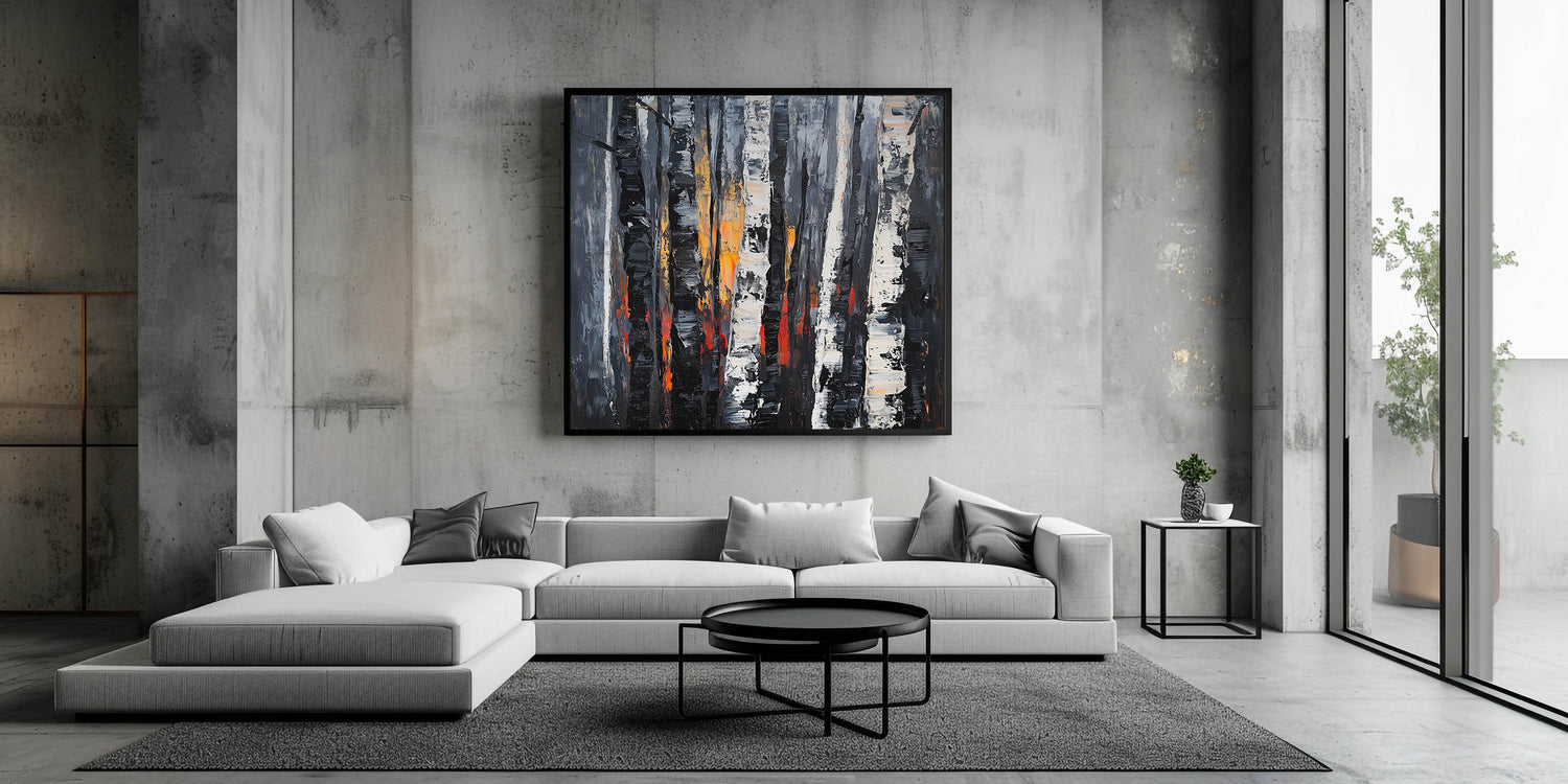 Create a bold focal point in your space with this modern wall art, featuring an abstract depiction of birch trees in a fiery autumn setting. The blend of black, white, and gray tones contrasts beautifully with the glowing orange and red highlights, making this wall art for the living room an eye-catching masterpiece. With its expressive brushstrokes and textured design, this abstract wall art adds depth and movement to any contemporary or classic décor.