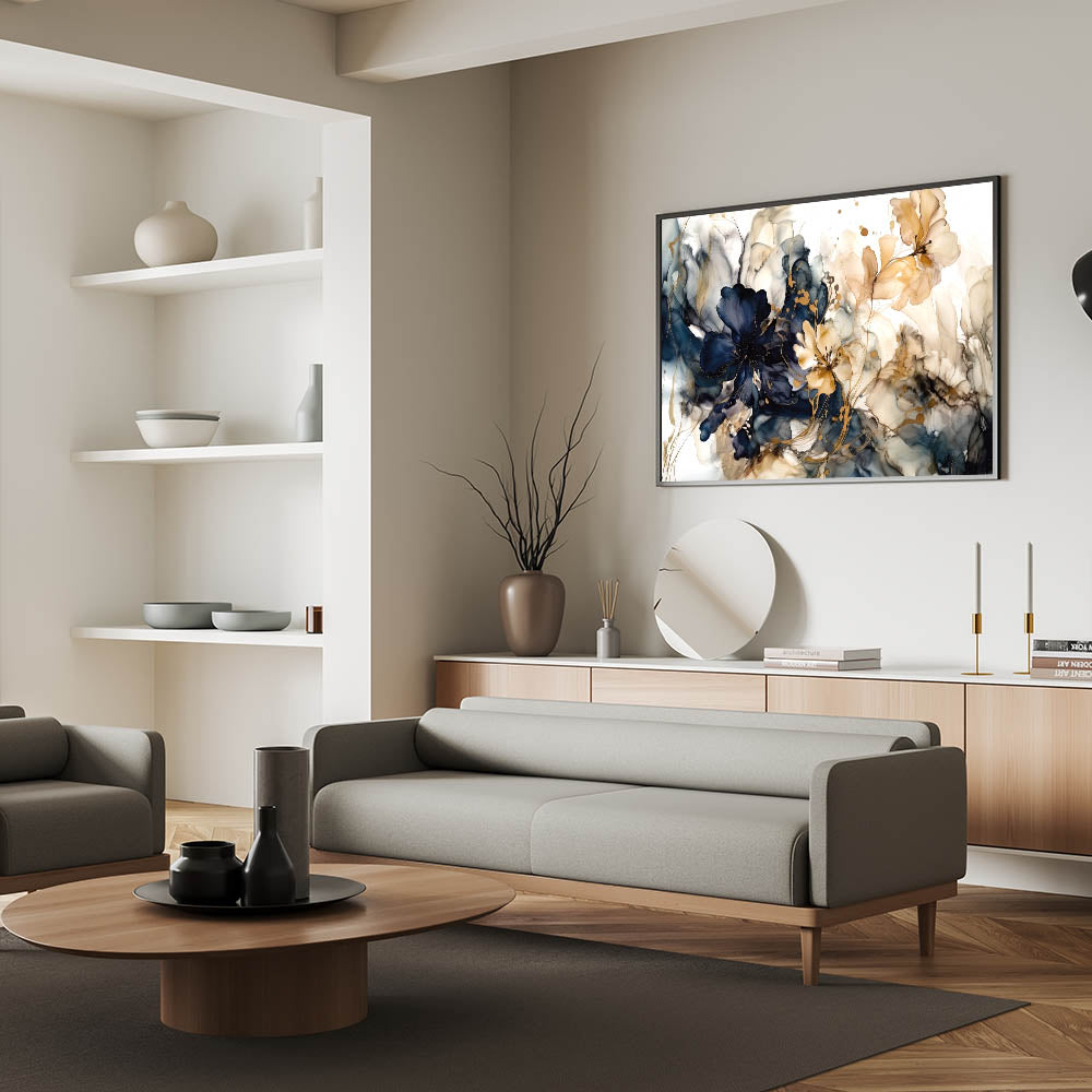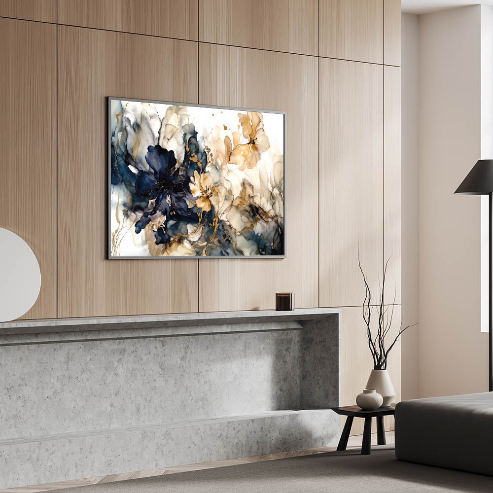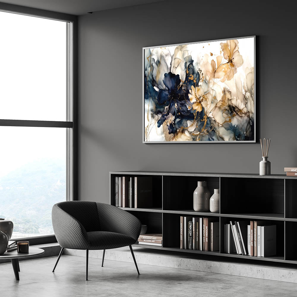 Transform your space with this stunning living room wall art, featuring an exquisite blend of abstract floral artistry in navy blue, gold, and beige. This modern wall art piece captures the fluidity of nature with its soft brushstrokes and delicate details, making it a sophisticated addition to contemporary living room decor. The elegant contrast of deep tones with light, airy hues creates a mesmerizing effect, bringing harmony and luxury to any interior.