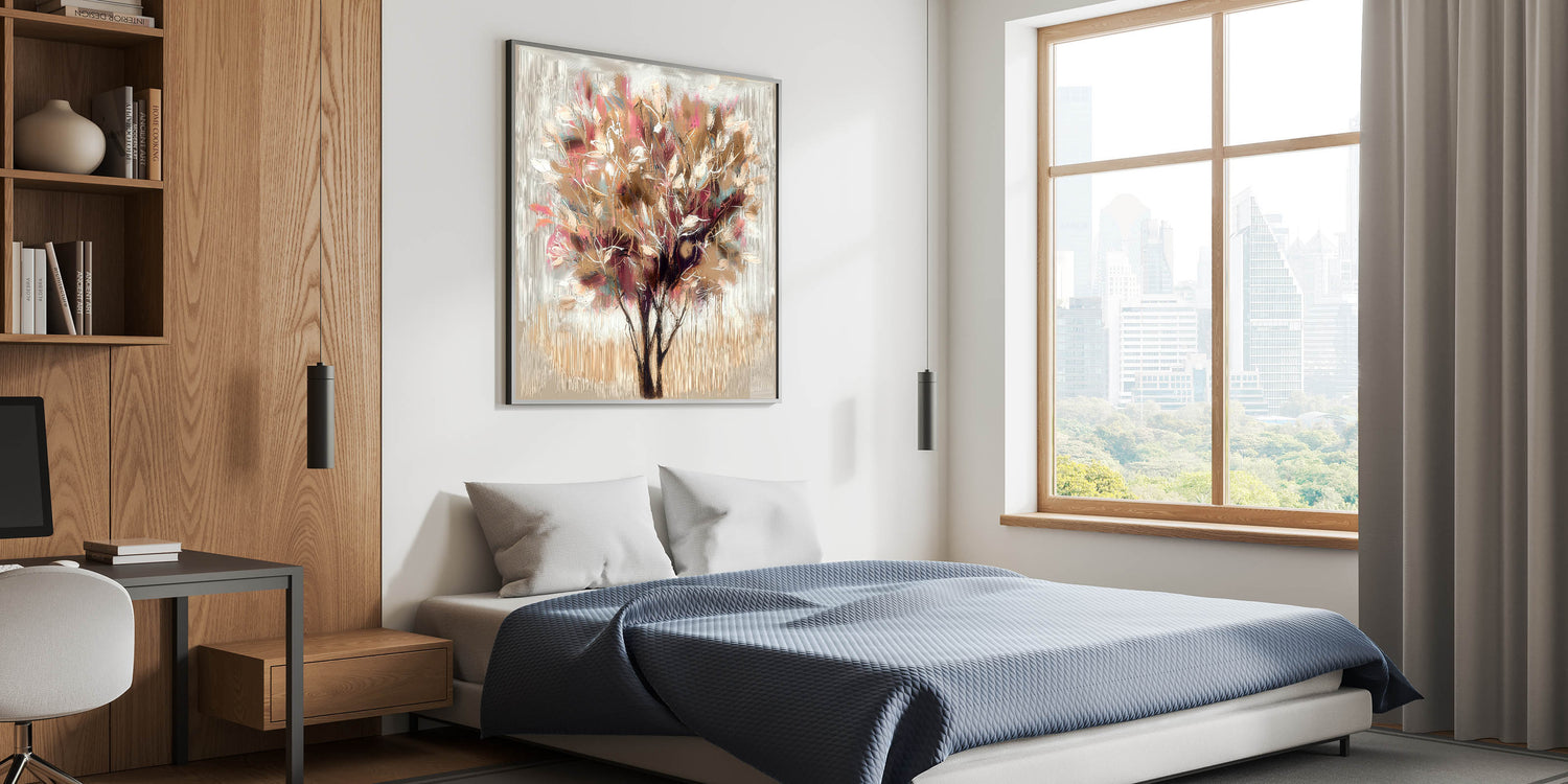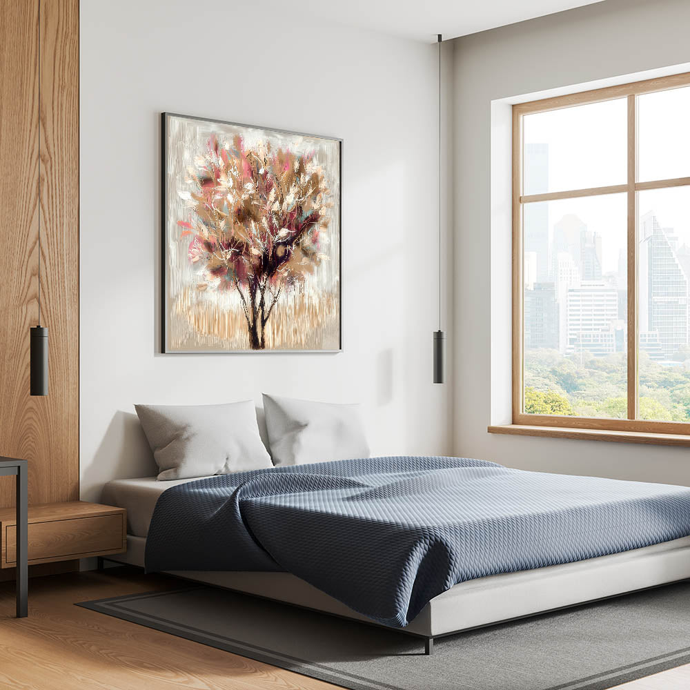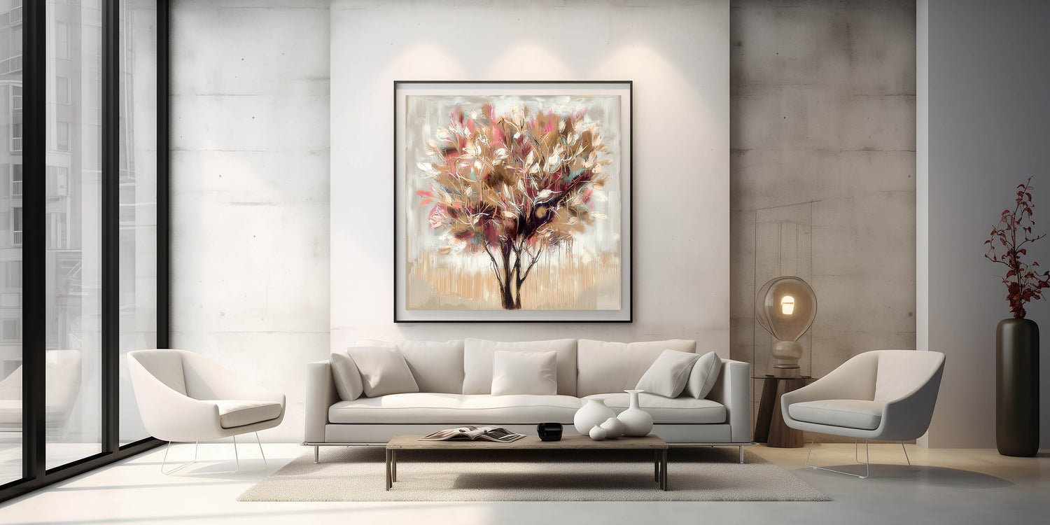Add a touch of nature’s beauty to your space with this living room wall art, featuring an elegantly stylized tree with warm beige, brown, and burgundy tones. The abstract brushstrokes and delicate details create a refined and sophisticated look, making it the perfect modern wall art piece for a cozy and stylish interior.