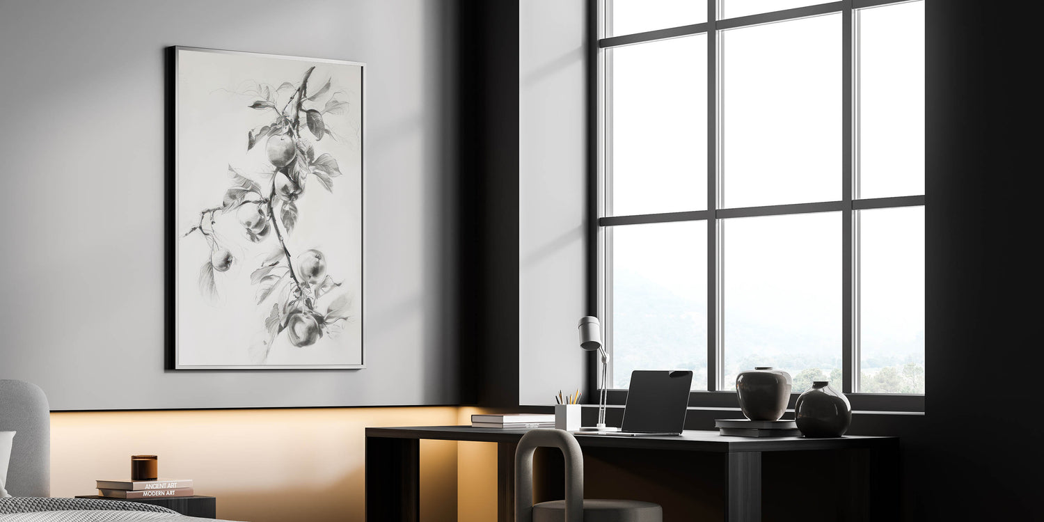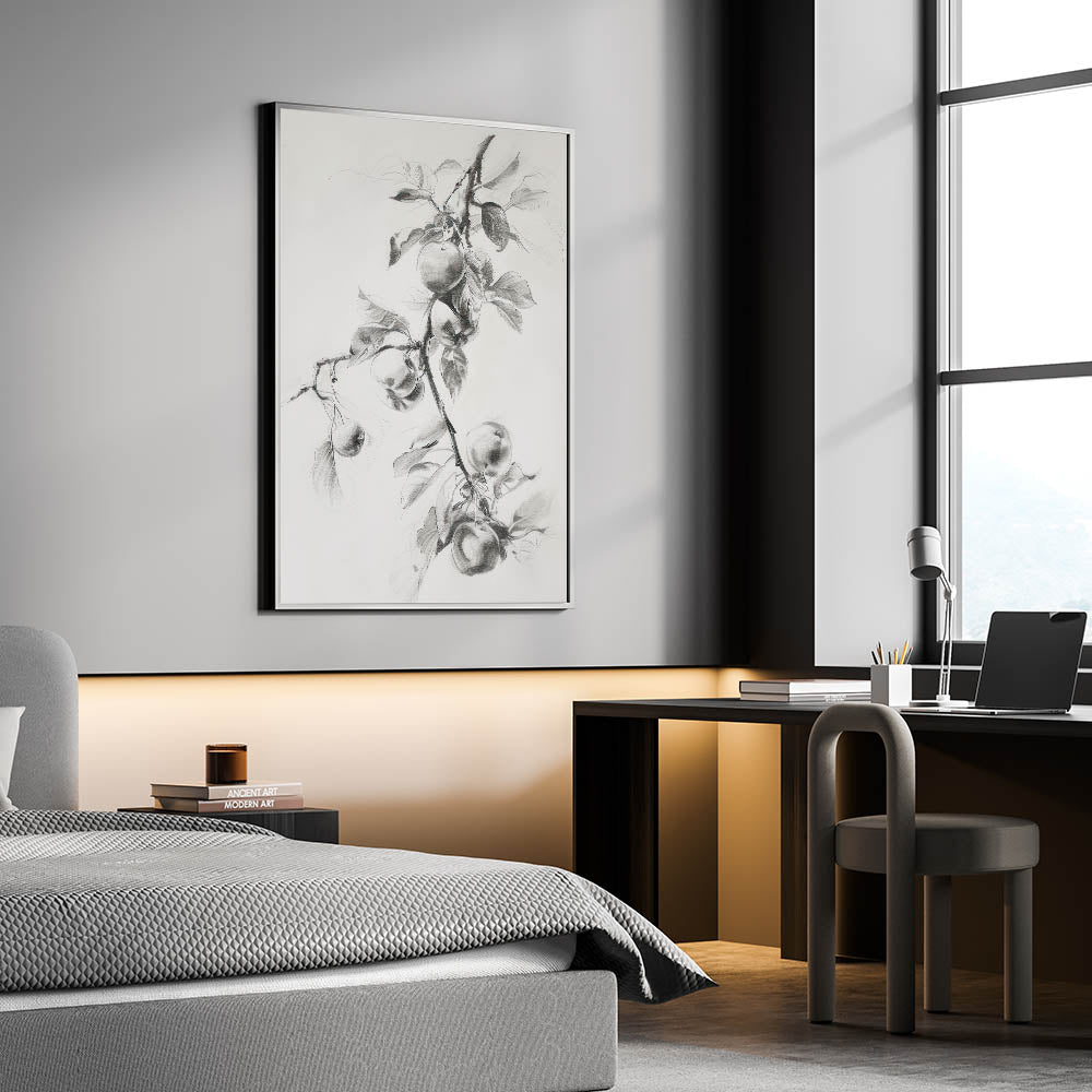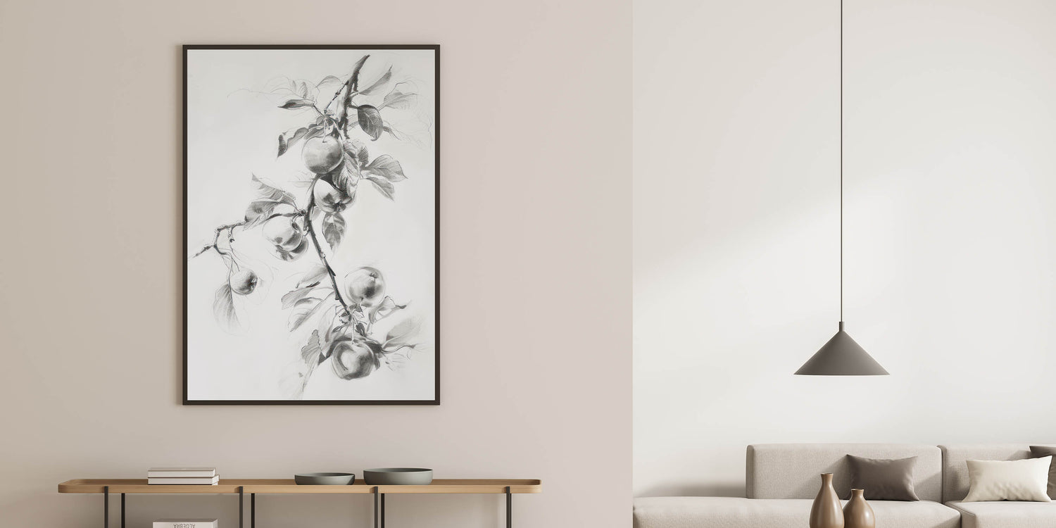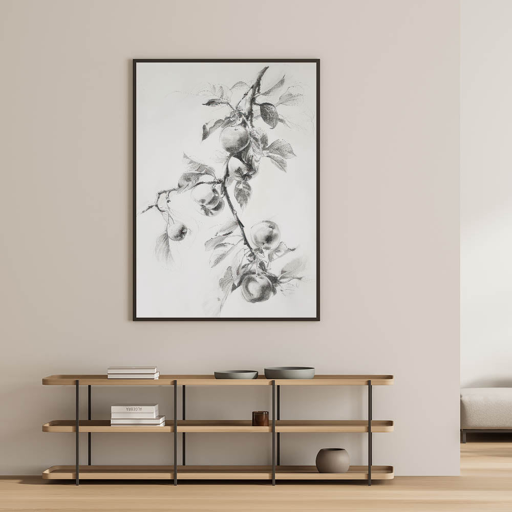 Enhance your space with this sophisticated black and white wall art, a stunning representation of nature's beauty. This modern wall art features a finely detailed sketch of apples on a branch, blending classic artistry with contemporary elegance. Perfect for modern living room décor, this timeless piece adds depth and style to your home.