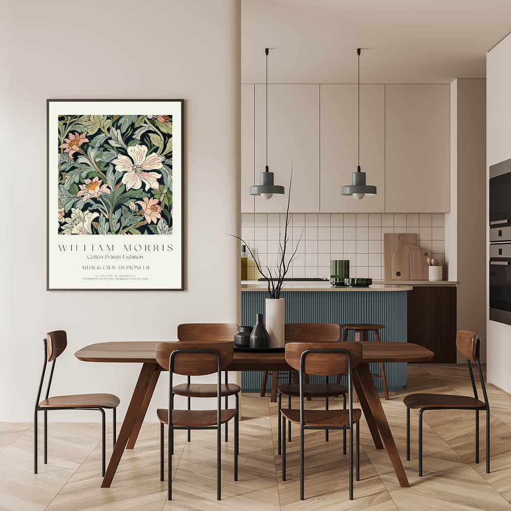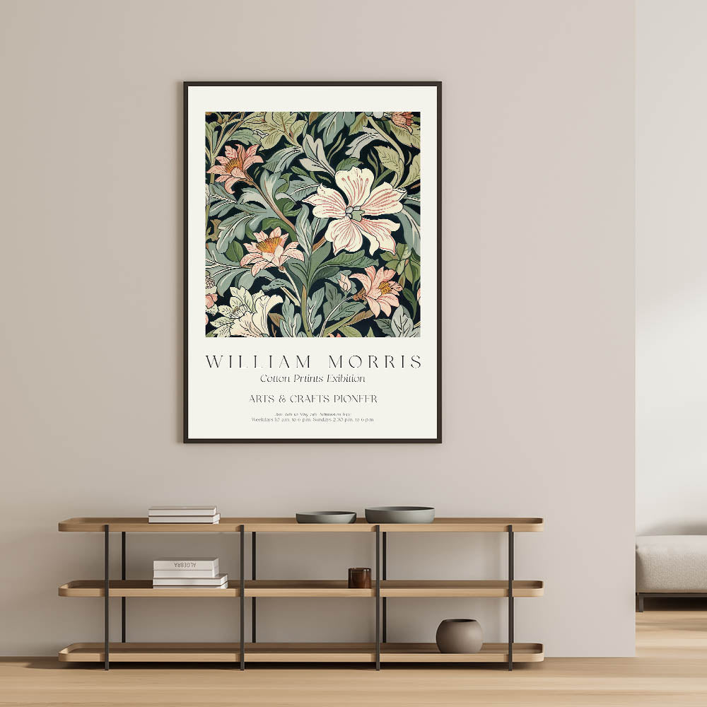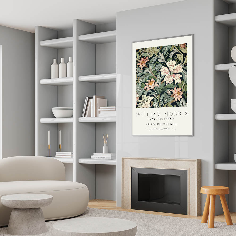 Enhance your home with the timeless beauty of this botanical-inspired wall art, featuring intricate floral patterns in a classic William Morris style. This modern wall art blends soft greens, peach-toned flowers, and delicate detailing, making it a perfect addition to living room wall décor.